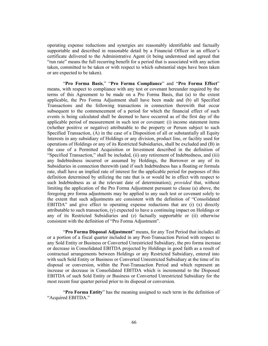 operating expense reductions and synergies are reasonably identifiable and factually supportable and described in reasonable detail by a Financial Officer in an officer’s certificate delivered to the Administrative Agent (it being understood and agreed that “run rate” means the full recurring benefit for a period that is associated with any action taken, committed to be taken or with respect to which substantial steps have been taken or are expected to be taken). “Pro Forma Basis,” “Pro Forma Compliance” and “Pro Forma Effect” means, with respect to compliance with any test or covenant hereunder required by the terms of this Agreement to be made on a Pro Forma Basis, that (a) to the extent applicable, the Pro Forma Adjustment shall have been made and (b) all Specified Transactions and the following transactions in connection therewith that occur subsequent to the commencement of a period for which the financial effect of such events is being calculated shall be deemed to have occurred as of the first day of the applicable period of measurement in such test or covenant: (i) income statement items (whether positive or negative) attributable to the property or Person subject to such Specified Transaction, (A) in the case of a Disposition of all or substantially all Equity Interests in any subsidiary of Holdings or any division, product line, or facility used for operations of Holdings or any of its Restricted Subsidiaries, shall be excluded and (B) in the case of a Permitted Acquisition or Investment described in the definition of “Specified Transaction,” shall be included, (ii) any retirement of Indebtedness, and (iii) any Indebtedness incurred or assumed by Holdings, the Borrower or any of its Subsidiaries in connection therewith (and if such Indebtedness has a floating or formula rate, shall have an implied rate of interest for the applicable period for purposes of this definition determined by utilizing the rate that is or would be in effect with respect to such Indebtedness as at the relevant date of determination); provided that, without limiting the application of the Pro Forma Adjustment pursuant to clause (a) above, the foregoing pro forma adjustments may be applied to any such test or covenant solely to the extent that such adjustments are consistent with the definition of “Consolidated EBITDA” and give effect to operating expense reductions that are (i) (x) directly attributable to such transaction, (y) expected to have a continuing impact on Holdings or any of its Restricted Subsidiaries and (z) factually supportable or (ii) otherwise consistent with the definition of “Pro Forma Adjustment”. “Pro Forma Disposal Adjustment” means, for any Test Period that includes all or a portion of a fiscal quarter included in any Post-Transaction Period with respect to any Sold Entity or Business or Converted Unrestricted Subsidiary, the pro forma increase or decrease in Consolidated EBITDA projected by Holdings in good faith as a result of contractual arrangements between Holdings or any Restricted Subsidiary, entered into with such Sold Entity or Business or Converted Unrestricted Subsidiary at the time of its disposal or conversion, within the Post-Transaction Period and which represent an increase or decrease in Consolidated EBITDA which is incremental to the Disposed EBITDA of such Sold Entity or Business or Converted Unrestricted Subsidiary for the most recent four quarter period prior to its disposal or conversion. “Pro Forma Entity” has the meaning assigned to such term in the definition of “Acquired EBITDA.” 66