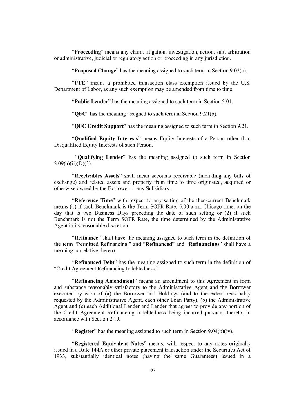 “Proceeding” means any claim, litigation, investigation, action, suit, arbitration or administrative, judicial or regulatory action or proceeding in any jurisdiction. “Proposed Change” has the meaning assigned to such term in Section 9.02(c). “PTE” means a prohibited transaction class exemption issued by the U.S. Department of Labor, as any such exemption may be amended from time to time. “Public Lender” has the meaning assigned to such term in Section 5.01. “QFC” has the meaning assigned to such term in Section 9.21(b). “QFC Credit Support” has the meaning assigned to such term in Section 9.21. “Qualified Equity Interests” means Equity Interests of a Person other than Disqualified Equity Interests of such Person. “Qualifying Lender” has the meaning assigned to such term in Section 2.09(a)(ii)(D)(3). “Receivables Assets” shall mean accounts receivable (including any bills of exchange) and related assets and property from time to time originated, acquired or otherwise owned by the Borrower or any Subsidiary. “Reference Time” with respect to any setting of the then-current Benchmark means (1) if such Benchmark is the Term SOFR Rate, 5:00 a.m., Chicago time, on the day that is two Business Days preceding the date of such setting or (2) if such Benchmark is not the Term SOFR Rate, the time determined by the Administrative Agent in its reasonable discretion. “Refinance” shall have the meaning assigned to such term in the definition of the term “Permitted Refinancing,” and “Refinanced” and “Refinancings” shall have a meaning correlative thereto. “Refinanced Debt” has the meaning assigned to such term in the definition of “Credit Agreement Refinancing Indebtedness.” “Refinancing Amendment” means an amendment to this Agreement in form and substance reasonably satisfactory to the Administrative Agent and the Borrower executed by each of (a) the Borrower and Holdings (and to the extent reasonably requested by the Administrative Agent, each other Loan Party), (b) the Administrative Agent and (c) each Additional Lender and Lender that agrees to provide any portion of the Credit Agreement Refinancing Indebtedness being incurred pursuant thereto, in accordance with Section 2.19. “Register” has the meaning assigned to such term in Section 9.04(b)(iv). “Registered Equivalent Notes” means, with respect to any notes originally issued in a Rule 144A or other private placement transaction under the Securities Act of 1933, substantially identical notes (having the same Guarantees) issued in a 67