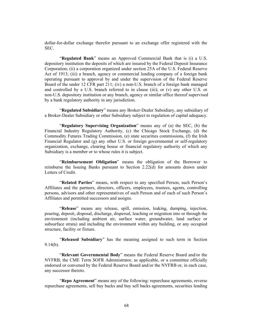 dollar-for-dollar exchange therefor pursuant to an exchange offer registered with the SEC. “Regulated Bank” means an Approved Commercial Bank that is (i) a U.S. depository institution the deposits of which are insured by the Federal Deposit Insurance Corporation; (ii) a corporation organized under section 25A of the U.S. Federal Reserve Act of 1913; (iii) a branch, agency or commercial lending company of a foreign bank operating pursuant to approval by and under the supervision of the Federal Reserve Board of the under 12 CFR part 211; (iv) a non-U.S. branch of a foreign bank managed and controlled by a U.S. branch referred to in clause (iii); or (v) any other U.S. or non-U.S. depository institution or any branch, agency or similar office thereof supervised by a bank regulatory authority in any jurisdiction. “Regulated Subsidiary” means any Broker-Dealer Subsidiary, any subsidiary of a Broker-Dealer Subsidiary or other Subsidiary subject to regulation of capital adequacy. “Regulatory Supervising Organization” means any of (a) the SEC, (b) the Financial Industry Regulatory Authority, (c) the Chicago Stock Exchange, (d) the Commodity Futures Trading Commission, (e) state securities commissions, (f) the Irish Financial Regulator and (g) any other U.S. or foreign governmental or self-regulatory organization, exchange, clearing house or financial regulatory authority of which any Subsidiary is a member or to whose rules it is subject. “Reimbursement Obligation” means the obligation of the Borrower to reimburse the Issuing Banks pursuant to Section 2.22(d) for amounts drawn under Letters of Credit. “Related Parties” means, with respect to any specified Person, such Person’s Affiliates and the partners, directors, officers, employees, trustees, agents, controlling persons, advisors and other representatives of such Person and of each of such Person’s Affiliates and permitted successors and assigns. “Release” means any release, spill, emission, leaking, dumping, injection, pouring, deposit, disposal, discharge, dispersal, leaching or migration into or through the environment (including ambient air, surface water, groundwater, land surface or subsurface strata) and including the environment within any building, or any occupied structure, facility or fixture. “Released Subsidiary” has the meaning assigned to such term in Section 9.14(b). “Relevant Governmental Body” means the Federal Reserve Board and/or the NYFRB, the CME Term SOFR Administrator, as applicable, or a committee officially endorsed or convened by the Federal Reserve Board and/or the NYFRB or, in each case, any successor thereto. “Repo Agreement” means any of the following: repurchase agreements, reverse repurchase agreements, sell buy backs and buy sell backs agreements, securities lending 68