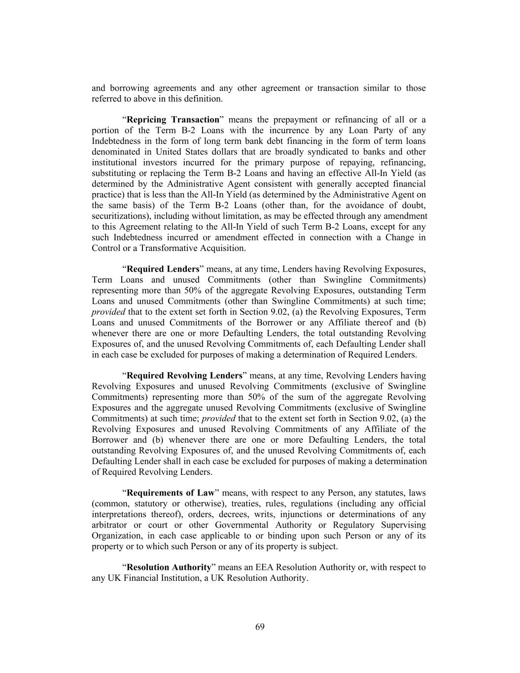 and borrowing agreements and any other agreement or transaction similar to those referred to above in this definition. “Repricing Transaction” means the prepayment or refinancing of all or a portion of the Term B-2 Loans with the incurrence by any Loan Party of any Indebtedness in the form of long term bank debt financing in the form of term loans denominated in United States dollars that are broadly syndicated to banks and other institutional investors incurred for the primary purpose of repaying, refinancing, substituting or replacing the Term B-2 Loans and having an effective All-In Yield (as determined by the Administrative Agent consistent with generally accepted financial practice) that is less than the All-In Yield (as determined by the Administrative Agent on the same basis) of the Term B-2 Loans (other than, for the avoidance of doubt, securitizations), including without limitation, as may be effected through any amendment to this Agreement relating to the All-In Yield of such Term B-2 Loans, except for any such Indebtedness incurred or amendment effected in connection with a Change in Control or a Transformative Acquisition. “Required Lenders” means, at any time, Lenders having Revolving Exposures, Term Loans and unused Commitments (other than Swingline Commitments) representing more than 50% of the aggregate Revolving Exposures, outstanding Term Loans and unused Commitments (other than Swingline Commitments) at such time; provided that to the extent set forth in Section 9.02, (a) the Revolving Exposures, Term Loans and unused Commitments of the Borrower or any Affiliate thereof and (b) whenever there are one or more Defaulting Lenders, the total outstanding Revolving Exposures of, and the unused Revolving Commitments of, each Defaulting Lender shall in each case be excluded for purposes of making a determination of Required Lenders. “Required Revolving Lenders” means, at any time, Revolving Lenders having Revolving Exposures and unused Revolving Commitments (exclusive of Swingline Commitments) representing more than 50% of the sum of the aggregate Revolving Exposures and the aggregate unused Revolving Commitments (exclusive of Swingline Commitments) at such time; provided that to the extent set forth in Section 9.02, (a) the Revolving Exposures and unused Revolving Commitments of any Affiliate of the Borrower and (b) whenever there are one or more Defaulting Lenders, the total outstanding Revolving Exposures of, and the unused Revolving Commitments of, each Defaulting Lender shall in each case be excluded for purposes of making a determination of Required Revolving Lenders. “Requirements of Law” means, with respect to any Person, any statutes, laws (common, statutory or otherwise), treaties, rules, regulations (including any official interpretations thereof), orders, decrees, writs, injunctions or determinations of any arbitrator or court or other Governmental Authority or Regulatory Supervising Organization, in each case applicable to or binding upon such Person or any of its property or to which such Person or any of its property is subject. “Resolution Authority” means an EEA Resolution Authority or, with respect to any UK Financial Institution, a UK Resolution Authority. 69