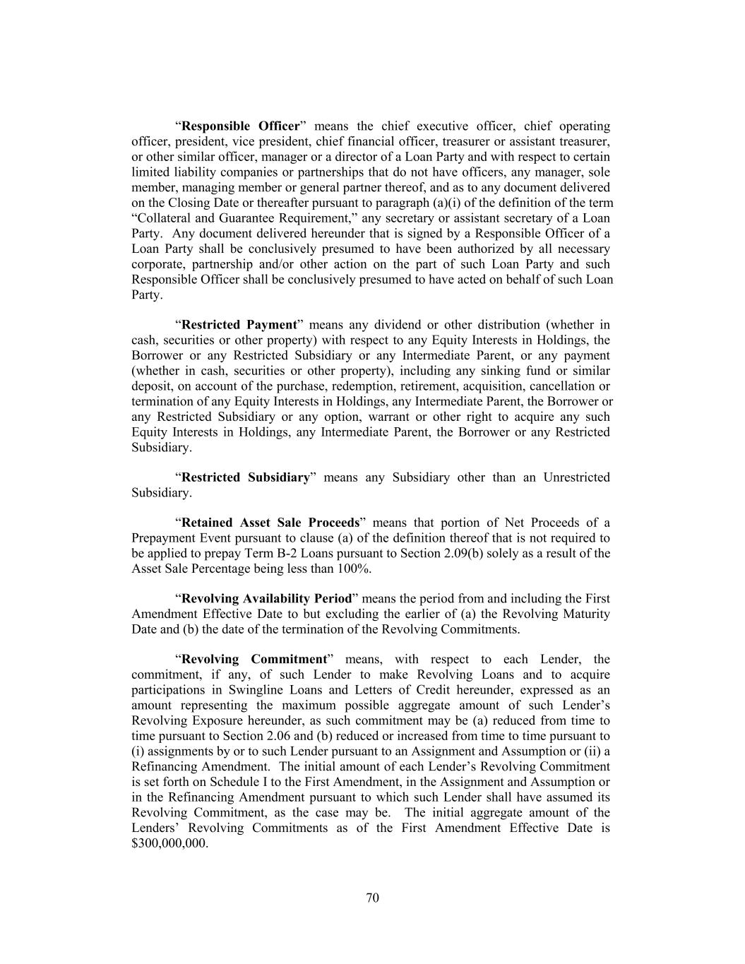 “Responsible Officer” means the chief executive officer, chief operating officer, president, vice president, chief financial officer, treasurer or assistant treasurer, or other similar officer, manager or a director of a Loan Party and with respect to certain limited liability companies or partnerships that do not have officers, any manager, sole member, managing member or general partner thereof, and as to any document delivered on the Closing Date or thereafter pursuant to paragraph (a)(i) of the definition of the term “Collateral and Guarantee Requirement,” any secretary or assistant secretary of a Loan Party. Any document delivered hereunder that is signed by a Responsible Officer of a Loan Party shall be conclusively presumed to have been authorized by all necessary corporate, partnership and/or other action on the part of such Loan Party and such Responsible Officer shall be conclusively presumed to have acted on behalf of such Loan Party. “Restricted Payment” means any dividend or other distribution (whether in cash, securities or other property) with respect to any Equity Interests in Holdings, the Borrower or any Restricted Subsidiary or any Intermediate Parent, or any payment (whether in cash, securities or other property), including any sinking fund or similar deposit, on account of the purchase, redemption, retirement, acquisition, cancellation or termination of any Equity Interests in Holdings, any Intermediate Parent, the Borrower or any Restricted Subsidiary or any option, warrant or other right to acquire any such Equity Interests in Holdings, any Intermediate Parent, the Borrower or any Restricted Subsidiary. “Restricted Subsidiary” means any Subsidiary other than an Unrestricted Subsidiary. “Retained Asset Sale Proceeds” means that portion of Net Proceeds of a Prepayment Event pursuant to clause (a) of the definition thereof that is not required to be applied to prepay Term B-2 Loans pursuant to Section 2.09(b) solely as a result of the Asset Sale Percentage being less than 100%. “Revolving Availability Period” means the period from and including the First Amendment Effective Date to but excluding the earlier of (a) the Revolving Maturity Date and (b) the date of the termination of the Revolving Commitments. “Revolving Commitment” means, with respect to each Lender, the commitment, if any, of such Lender to make Revolving Loans and to acquire participations in Swingline Loans and Letters of Credit hereunder, expressed as an amount representing the maximum possible aggregate amount of such Lender’s Revolving Exposure hereunder, as such commitment may be (a) reduced from time to time pursuant to Section 2.06 and (b) reduced or increased from time to time pursuant to (i) assignments by or to such Lender pursuant to an Assignment and Assumption or (ii) a Refinancing Amendment. The initial amount of each Lender’s Revolving Commitment is set forth on Schedule I to the First Amendment, in the Assignment and Assumption or in the Refinancing Amendment pursuant to which such Lender shall have assumed its Revolving Commitment, as the case may be. The initial aggregate amount of the Lenders’ Revolving Commitments as of the First Amendment Effective Date is $300,000,000. 70
