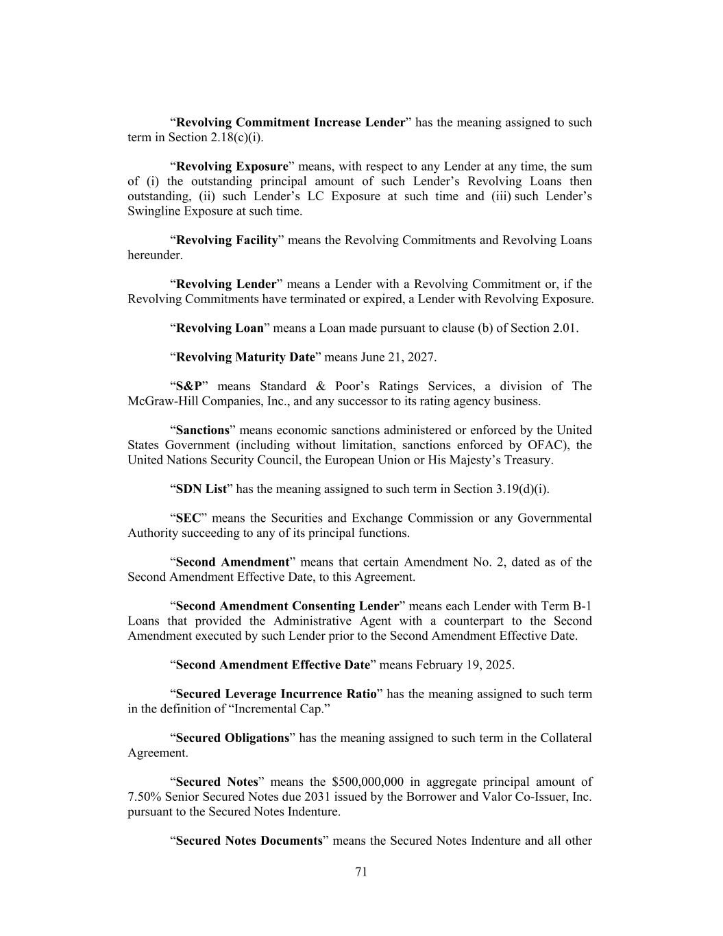 “Revolving Commitment Increase Lender” has the meaning assigned to such term in Section 2.18(c)(i). “Revolving Exposure” means, with respect to any Lender at any time, the sum of (i) the outstanding principal amount of such Lender’s Revolving Loans then outstanding, (ii) such Lender’s LC Exposure at such time and (iii) such Lender’s Swingline Exposure at such time. “Revolving Facility” means the Revolving Commitments and Revolving Loans hereunder. “Revolving Lender” means a Lender with a Revolving Commitment or, if the Revolving Commitments have terminated or expired, a Lender with Revolving Exposure. “Revolving Loan” means a Loan made pursuant to clause (b) of Section 2.01. “Revolving Maturity Date” means June 21, 2027. “S&P” means Standard & Poor’s Ratings Services, a division of The McGraw-Hill Companies, Inc., and any successor to its rating agency business. “Sanctions” means economic sanctions administered or enforced by the United States Government (including without limitation, sanctions enforced by OFAC), the United Nations Security Council, the European Union or His Majesty’s Treasury. “SDN List” has the meaning assigned to such term in Section 3.19(d)(i). “SEC” means the Securities and Exchange Commission or any Governmental Authority succeeding to any of its principal functions. “Second Amendment” means that certain Amendment No. 2, dated as of the Second Amendment Effective Date, to this Agreement. “Second Amendment Consenting Lender” means each Lender with Term B-1 Loans that provided the Administrative Agent with a counterpart to the Second Amendment executed by such Lender prior to the Second Amendment Effective Date. “Second Amendment Effective Date” means February 19, 2025. “Secured Leverage Incurrence Ratio” has the meaning assigned to such term in the definition of “Incremental Cap.” “Secured Obligations” has the meaning assigned to such term in the Collateral Agreement. “Secured Notes” means the $500,000,000 in aggregate principal amount of 7.50% Senior Secured Notes due 2031 issued by the Borrower and Valor Co-Issuer, Inc. pursuant to the Secured Notes Indenture. “Secured Notes Documents” means the Secured Notes Indenture and all other 71