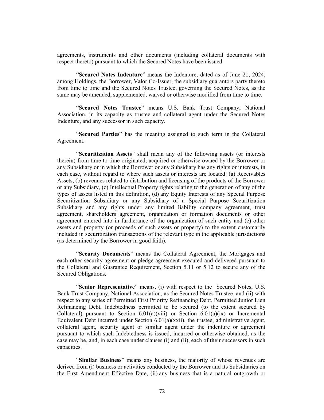 agreements, instruments and other documents (including collateral documents with respect thereto) pursuant to which the Secured Notes have been issued. “Secured Notes Indenture” means the Indenture, dated as of June 21, 2024, among Holdings, the Borrower, Valor Co-Issuer, the subsidiary guarantors party thereto from time to time and the Secured Notes Trustee, governing the Secured Notes, as the same may be amended, supplemented, waived or otherwise modified from time to time. “Secured Notes Trustee” means U.S. Bank Trust Company, National Association, in its capacity as trustee and collateral agent under the Secured Notes Indenture, and any successor in such capacity. “Secured Parties” has the meaning assigned to such term in the Collateral Agreement. “Securitization Assets” shall mean any of the following assets (or interests therein) from time to time originated, acquired or otherwise owned by the Borrower or any Subsidiary or in which the Borrower or any Subsidiary has any rights or interests, in each case, without regard to where such assets or interests are located: (a) Receivables Assets, (b) revenues related to distribution and licensing of the products of the Borrower or any Subsidiary, (c) Intellectual Property rights relating to the generation of any of the types of assets listed in this definition, (d) any Equity Interests of any Special Purpose Securitization Subsidiary or any Subsidiary of a Special Purpose Securitization Subsidiary and any rights under any limited liability company agreement, trust agreement, shareholders agreement, organization or formation documents or other agreement entered into in furtherance of the organization of such entity and (e) other assets and property (or proceeds of such assets or property) to the extent customarily included in securitization transactions of the relevant type in the applicable jurisdictions (as determined by the Borrower in good faith). “Security Documents” means the Collateral Agreement, the Mortgages and each other security agreement or pledge agreement executed and delivered pursuant to the Collateral and Guarantee Requirement, Section 5.11 or 5.12 to secure any of the Secured Obligations. “Senior Representative” means, (i) with respect to the Secured Notes, U.S. Bank Trust Company, National Association, as the Secured Notes Trustee, and (ii) with respect to any series of Permitted First Priority Refinancing Debt, Permitted Junior Lien Refinancing Debt, Indebtedness permitted to be secured (to the extent secured by Collateral) pursuant to Section 6.01(a)(viii) or Section 6.01(a)(ix) or Incremental Equivalent Debt incurred under Section 6.01(a)(xxii), the trustee, administrative agent, collateral agent, security agent or similar agent under the indenture or agreement pursuant to which such Indebtedness is issued, incurred or otherwise obtained, as the case may be, and, in each case under clauses (i) and (ii), each of their successors in such capacities. “Similar Business” means any business, the majority of whose revenues are derived from (i) business or activities conducted by the Borrower and its Subsidiaries on the First Amendment Effective Date, (ii) any business that is a natural outgrowth or 72