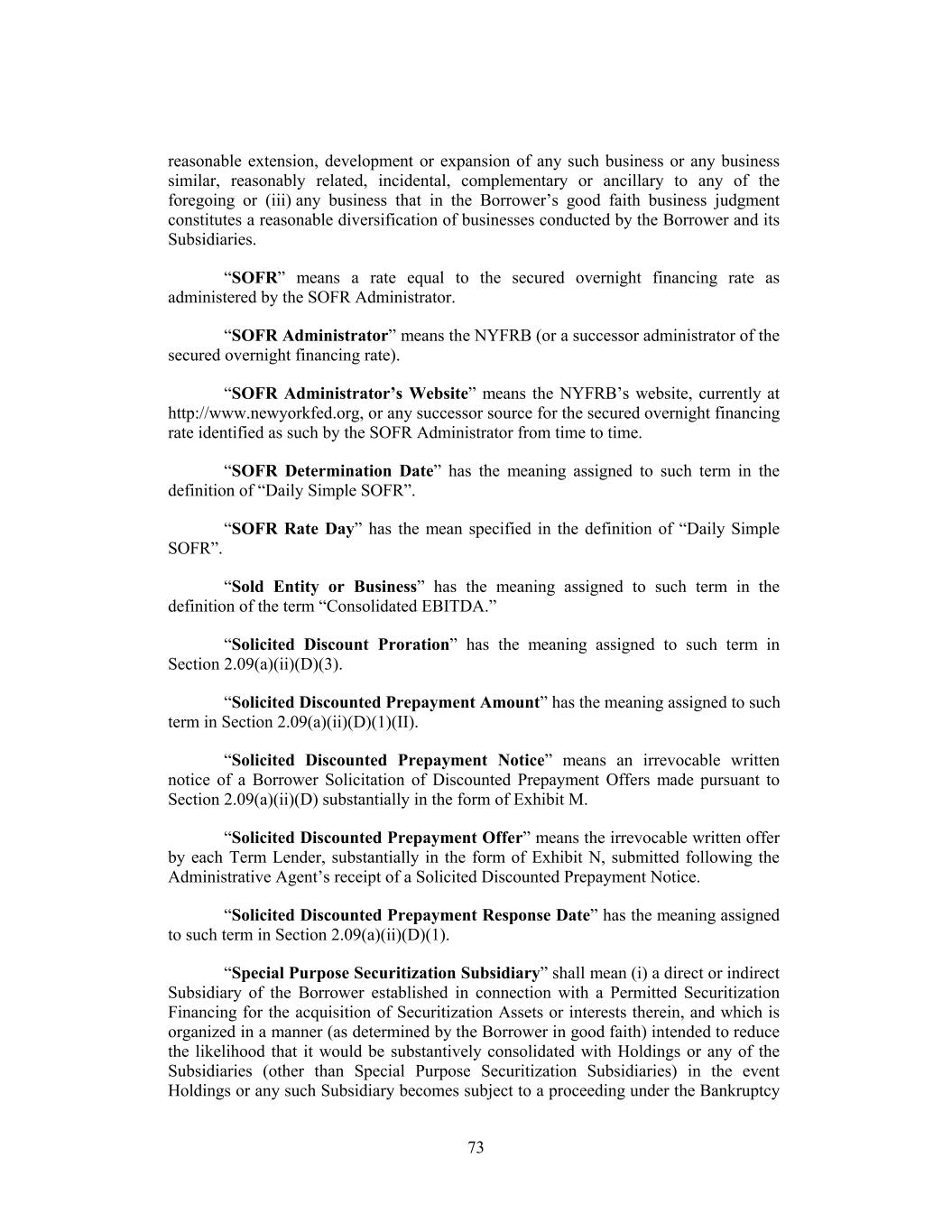 reasonable extension, development or expansion of any such business or any business similar, reasonably related, incidental, complementary or ancillary to any of the foregoing or (iii) any business that in the Borrower’s good faith business judgment constitutes a reasonable diversification of businesses conducted by the Borrower and its Subsidiaries. “SOFR” means a rate equal to the secured overnight financing rate as administered by the SOFR Administrator. “SOFR Administrator” means the NYFRB (or a successor administrator of the secured overnight financing rate). “SOFR Administrator’s Website” means the NYFRB’s website, currently at http://www.newyorkfed.org, or any successor source for the secured overnight financing rate identified as such by the SOFR Administrator from time to time. “SOFR Determination Date” has the meaning assigned to such term in the definition of “Daily Simple SOFR”. “SOFR Rate Day” has the mean specified in the definition of “Daily Simple SOFR”. “Sold Entity or Business” has the meaning assigned to such term in the definition of the term “Consolidated EBITDA.” “Solicited Discount Proration” has the meaning assigned to such term in Section 2.09(a)(ii)(D)(3). “Solicited Discounted Prepayment Amount” has the meaning assigned to such term in Section 2.09(a)(ii)(D)(1)(II). “Solicited Discounted Prepayment Notice” means an irrevocable written notice of a Borrower Solicitation of Discounted Prepayment Offers made pursuant to Section 2.09(a)(ii)(D) substantially in the form of Exhibit M. “Solicited Discounted Prepayment Offer” means the irrevocable written offer by each Term Lender, substantially in the form of Exhibit N, submitted following the Administrative Agent’s receipt of a Solicited Discounted Prepayment Notice. “Solicited Discounted Prepayment Response Date” has the meaning assigned to such term in Section 2.09(a)(ii)(D)(1). “Special Purpose Securitization Subsidiary” shall mean (i) a direct or indirect Subsidiary of the Borrower established in connection with a Permitted Securitization Financing for the acquisition of Securitization Assets or interests therein, and which is organized in a manner (as determined by the Borrower in good faith) intended to reduce the likelihood that it would be substantively consolidated with Holdings or any of the Subsidiaries (other than Special Purpose Securitization Subsidiaries) in the event Holdings or any such Subsidiary becomes subject to a proceeding under the Bankruptcy 73