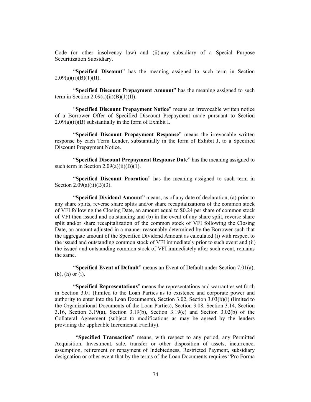 Code (or other insolvency law) and (ii) any subsidiary of a Special Purpose Securitization Subsidiary. “Specified Discount” has the meaning assigned to such term in Section 2.09(a)(ii)(B)(1)(II). “Specified Discount Prepayment Amount” has the meaning assigned to such term in Section 2.09(a)(ii)(B)(1)(II). “Specified Discount Prepayment Notice” means an irrevocable written notice of a Borrower Offer of Specified Discount Prepayment made pursuant to Section 2.09(a)(ii)(B) substantially in the form of Exhibit I. “Specified Discount Prepayment Response” means the irrevocable written response by each Term Lender, substantially in the form of Exhibit J, to a Specified Discount Prepayment Notice. “Specified Discount Prepayment Response Date” has the meaning assigned to such term in Section 2.09(a)(ii)(B)(1). “Specified Discount Proration” has the meaning assigned to such term in Section 2.09(a)(ii)(B)(3). “Specified Dividend Amount” means, as of any date of declaration, (a) prior to any share splits, reverse share splits and/or share recapitalizations of the common stock of VFI following the Closing Date, an amount equal to $0.24 per share of common stock of VFI then issued and outstanding and (b) in the event of any share split, reverse share split and/or share recapitalization of the common stock of VFI following the Closing Date, an amount adjusted in a manner reasonably determined by the Borrower such that the aggregate amount of the Specified Dividend Amount as calculated (i) with respect to the issued and outstanding common stock of VFI immediately prior to such event and (ii) the issued and outstanding common stock of VFI immediately after such event, remains the same. “Specified Event of Default” means an Event of Default under Section 7.01(a), (b), (h) or (i). “Specified Representations” means the representations and warranties set forth in Section 3.01 (limited to the Loan Parties as to existence and corporate power and authority to enter into the Loan Documents), Section 3.02, Section 3.03(b)(i) (limited to the Organizational Documents of the Loan Parties), Section 3.08, Section 3.14, Section 3.16, Section 3.19(a), Section 3.19(b), Section 3.19(c) and Section 3.02(b) of the Collateral Agreement (subject to modifications as may be agreed by the lenders providing the applicable Incremental Facility). “Specified Transaction” means, with respect to any period, any Permitted Acquisition, Investment, sale, transfer or other disposition of assets, incurrence, assumption, retirement or repayment of Indebtedness, Restricted Payment, subsidiary designation or other event that by the terms of the Loan Documents requires “Pro Forma 74