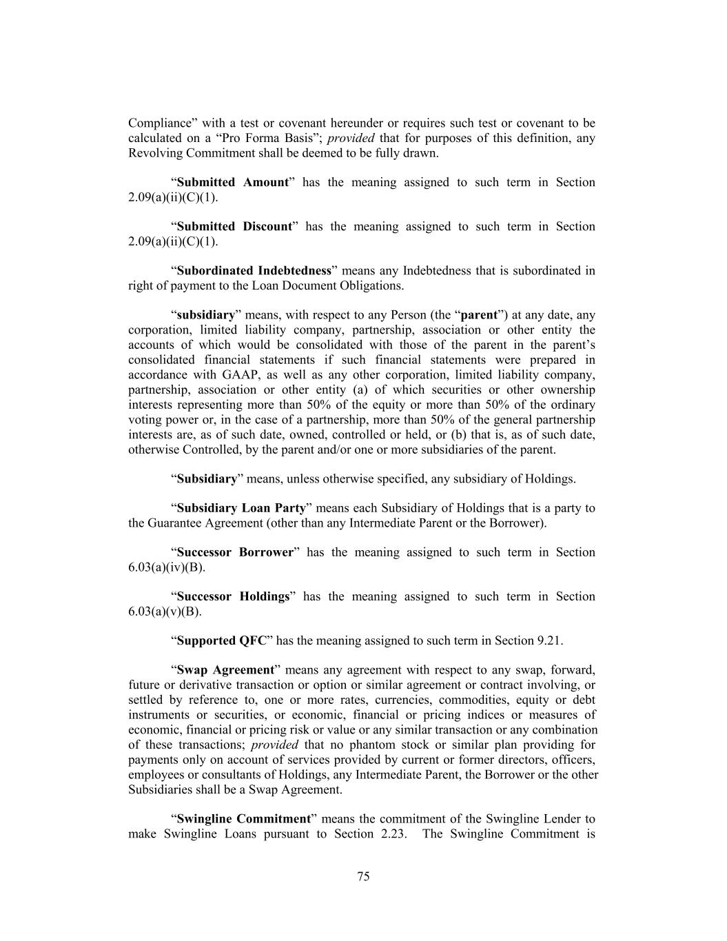 Compliance” with a test or covenant hereunder or requires such test or covenant to be calculated on a “Pro Forma Basis”; provided that for purposes of this definition, any Revolving Commitment shall be deemed to be fully drawn. “Submitted Amount” has the meaning assigned to such term in Section 2.09(a)(ii)(C)(1). “Submitted Discount” has the meaning assigned to such term in Section 2.09(a)(ii)(C)(1). “Subordinated Indebtedness” means any Indebtedness that is subordinated in right of payment to the Loan Document Obligations. “subsidiary” means, with respect to any Person (the “parent”) at any date, any corporation, limited liability company, partnership, association or other entity the accounts of which would be consolidated with those of the parent in the parent’s consolidated financial statements if such financial statements were prepared in accordance with GAAP, as well as any other corporation, limited liability company, partnership, association or other entity (a) of which securities or other ownership interests representing more than 50% of the equity or more than 50% of the ordinary voting power or, in the case of a partnership, more than 50% of the general partnership interests are, as of such date, owned, controlled or held, or (b) that is, as of such date, otherwise Controlled, by the parent and/or one or more subsidiaries of the parent. “Subsidiary” means, unless otherwise specified, any subsidiary of Holdings. “Subsidiary Loan Party” means each Subsidiary of Holdings that is a party to the Guarantee Agreement (other than any Intermediate Parent or the Borrower). “Successor Borrower” has the meaning assigned to such term in Section 6.03(a)(iv)(B). “Successor Holdings” has the meaning assigned to such term in Section 6.03(a)(v)(B). “Supported QFC” has the meaning assigned to such term in Section 9.21. “Swap Agreement” means any agreement with respect to any swap, forward, future or derivative transaction or option or similar agreement or contract involving, or settled by reference to, one or more rates, currencies, commodities, equity or debt instruments or securities, or economic, financial or pricing indices or measures of economic, financial or pricing risk or value or any similar transaction or any combination of these transactions; provided that no phantom stock or similar plan providing for payments only on account of services provided by current or former directors, officers, employees or consultants of Holdings, any Intermediate Parent, the Borrower or the other Subsidiaries shall be a Swap Agreement. “Swingline Commitment” means the commitment of the Swingline Lender to make Swingline Loans pursuant to Section 2.23. The Swingline Commitment is 75