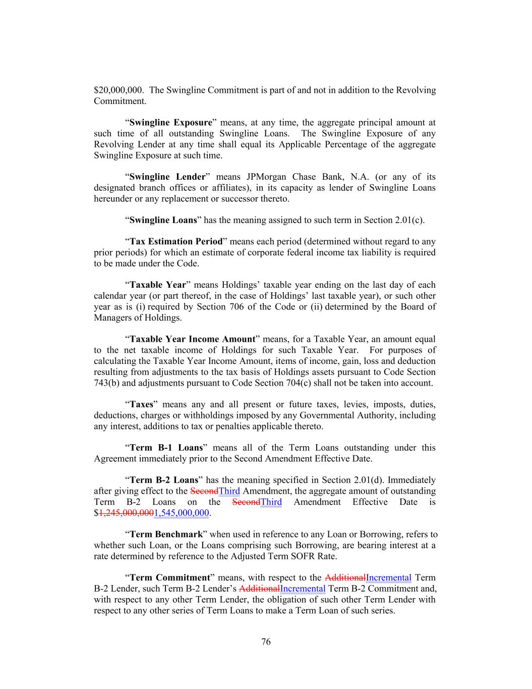 $20,000,000. The Swingline Commitment is part of and not in addition to the Revolving Commitment. “Swingline Exposure” means, at any time, the aggregate principal amount at such time of all outstanding Swingline Loans. The Swingline Exposure of any Revolving Lender at any time shall equal its Applicable Percentage of the aggregate Swingline Exposure at such time. “Swingline Lender” means JPMorgan Chase Bank, N.A. (or any of its designated branch offices or affiliates), in its capacity as lender of Swingline Loans hereunder or any replacement or successor thereto. “Swingline Loans” has the meaning assigned to such term in Section 2.01(c). “Tax Estimation Period” means each period (determined without regard to any prior periods) for which an estimate of corporate federal income tax liability is required to be made under the Code. “Taxable Year” means Holdings’ taxable year ending on the last day of each calendar year (or part thereof, in the case of Holdings’ last taxable year), or such other year as is (i) required by Section 706 of the Code or (ii) determined by the Board of Managers of Holdings. “Taxable Year Income Amount” means, for a Taxable Year, an amount equal to the net taxable income of Holdings for such Taxable Year. For purposes of calculating the Taxable Year Income Amount, items of income, gain, loss and deduction resulting from adjustments to the tax basis of Holdings assets pursuant to Code Section 743(b) and adjustments pursuant to Code Section 704(c) shall not be taken into account. “Taxes” means any and all present or future taxes, levies, imposts, duties, deductions, charges or withholdings imposed by any Governmental Authority, including any interest, additions to tax or penalties applicable thereto. “Term B-1 Loans” means all of the Term Loans outstanding under this Agreement immediately prior to the Second Amendment Effective Date. “Term B-2 Loans” has the meaning specified in Section 2.01(d). Immediately after giving effect to the SecondThird Amendment, the aggregate amount of outstanding Term B-2 Loans on the SecondThird Amendment Effective Date is $1,245,000,0001,545,000,000. “Term Benchmark” when used in reference to any Loan or Borrowing, refers to whether such Loan, or the Loans comprising such Borrowing, are bearing interest at a rate determined by reference to the Adjusted Term SOFR Rate. “Term Commitment” means, with respect to the AdditionalIncremental Term B-2 Lender, such Term B-2 Lender’s AdditionalIncremental Term B-2 Commitment and, with respect to any other Term Lender, the obligation of such other Term Lender with respect to any other series of Term Loans to make a Term Loan of such series. 76