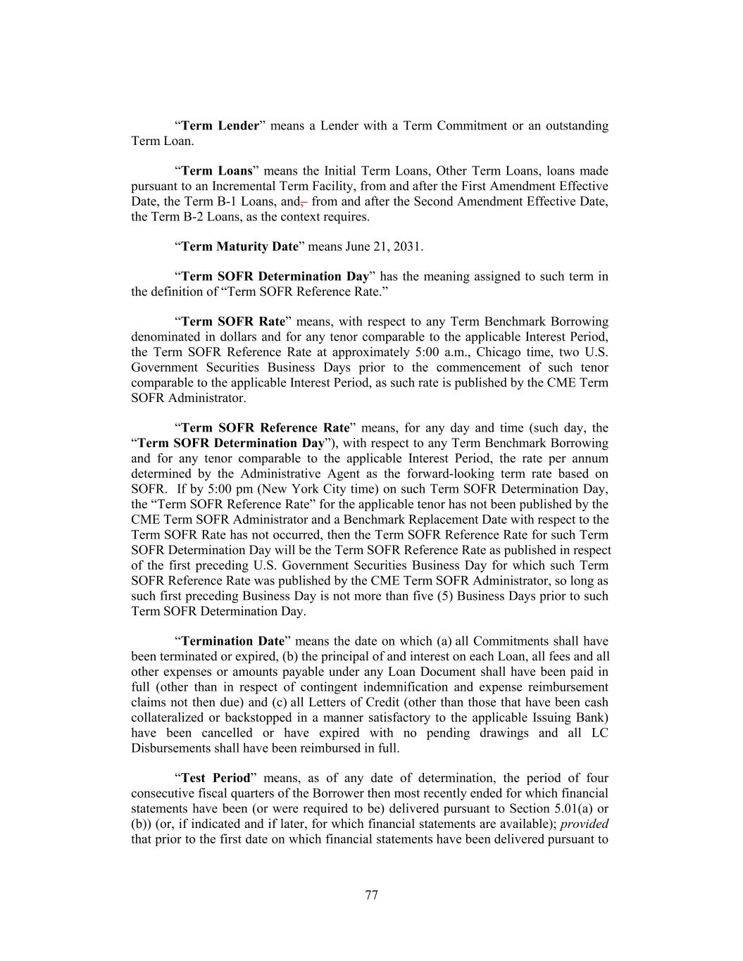 “Term Lender” means a Lender with a Term Commitment or an outstanding Term Loan. “Term Loans” means the Initial Term Loans, Other Term Loans, loans made pursuant to an Incremental Term Facility, from and after the First Amendment Effective Date, the Term B-1 Loans, and, from and after the Second Amendment Effective Date, the Term B-2 Loans, as the context requires. “Term Maturity Date” means June 21, 2031. “Term SOFR Determination Day” has the meaning assigned to such term in the definition of “Term SOFR Reference Rate.” “Term SOFR Rate” means, with respect to any Term Benchmark Borrowing denominated in dollars and for any tenor comparable to the applicable Interest Period, the Term SOFR Reference Rate at approximately 5:00 a.m., Chicago time, two U.S. Government Securities Business Days prior to the commencement of such tenor comparable to the applicable Interest Period, as such rate is published by the CME Term SOFR Administrator. “Term SOFR Reference Rate” means, for any day and time (such day, the “Term SOFR Determination Day”), with respect to any Term Benchmark Borrowing and for any tenor comparable to the applicable Interest Period, the rate per annum determined by the Administrative Agent as the forward-looking term rate based on SOFR. If by 5:00 pm (New York City time) on such Term SOFR Determination Day, the “Term SOFR Reference Rate” for the applicable tenor has not been published by the CME Term SOFR Administrator and a Benchmark Replacement Date with respect to the Term SOFR Rate has not occurred, then the Term SOFR Reference Rate for such Term SOFR Determination Day will be the Term SOFR Reference Rate as published in respect of the first preceding U.S. Government Securities Business Day for which such Term SOFR Reference Rate was published by the CME Term SOFR Administrator, so long as such first preceding Business Day is not more than five (5) Business Days prior to such Term SOFR Determination Day. “Termination Date” means the date on which (a) all Commitments shall have been terminated or expired, (b) the principal of and interest on each Loan, all fees and all other expenses or amounts payable under any Loan Document shall have been paid in full (other than in respect of contingent indemnification and expense reimbursement claims not then due) and (c) all Letters of Credit (other than those that have been cash collateralized or backstopped in a manner satisfactory to the applicable Issuing Bank) have been cancelled or have expired with no pending drawings and all LC Disbursements shall have been reimbursed in full. “Test Period” means, as of any date of determination, the period of four consecutive fiscal quarters of the Borrower then most recently ended for which financial statements have been (or were required to be) delivered pursuant to Section 5.01(a) or (b)) (or, if indicated and if later, for which financial statements are available); provided that prior to the first date on which financial statements have been delivered pursuant to 77