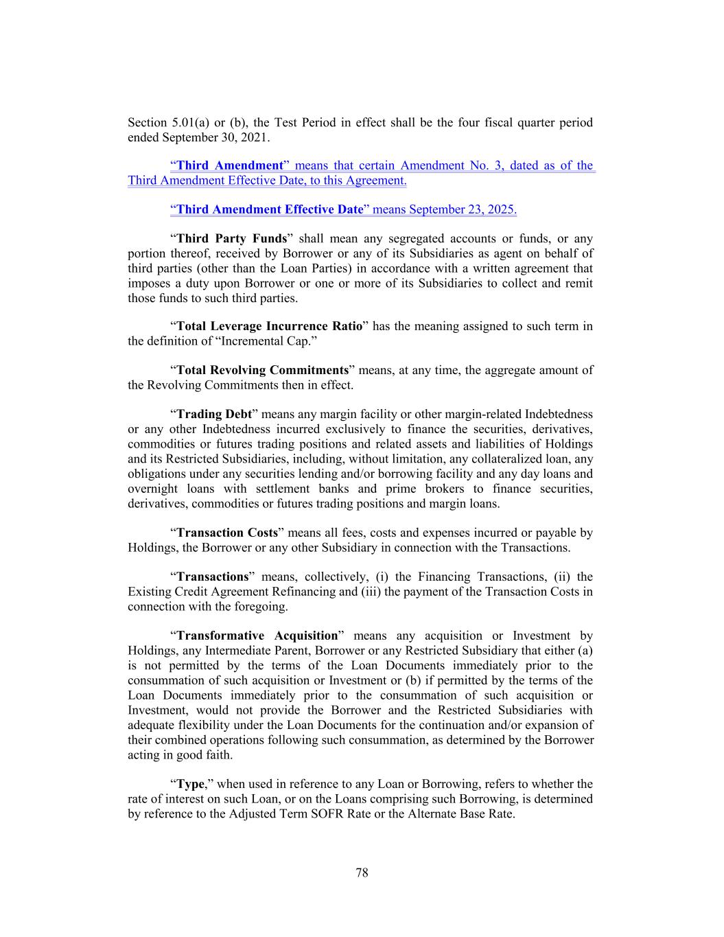 Section 5.01(a) or (b), the Test Period in effect shall be the four fiscal quarter period ended September 30, 2021. “Third Amendment” means that certain Amendment No. 3, dated as of the Third Amendment Effective Date, to this Agreement. “Third Amendment Effective Date” means September 23, 2025. “Third Party Funds” shall mean any segregated accounts or funds, or any portion thereof, received by Borrower or any of its Subsidiaries as agent on behalf of third parties (other than the Loan Parties) in accordance with a written agreement that imposes a duty upon Borrower or one or more of its Subsidiaries to collect and remit those funds to such third parties. “Total Leverage Incurrence Ratio” has the meaning assigned to such term in the definition of “Incremental Cap.” “Total Revolving Commitments” means, at any time, the aggregate amount of the Revolving Commitments then in effect. “Trading Debt” means any margin facility or other margin-related Indebtedness or any other Indebtedness incurred exclusively to finance the securities, derivatives, commodities or futures trading positions and related assets and liabilities of Holdings and its Restricted Subsidiaries, including, without limitation, any collateralized loan, any obligations under any securities lending and/or borrowing facility and any day loans and overnight loans with settlement banks and prime brokers to finance securities, derivatives, commodities or futures trading positions and margin loans. “Transaction Costs” means all fees, costs and expenses incurred or payable by Holdings, the Borrower or any other Subsidiary in connection with the Transactions. “Transactions” means, collectively, (i) the Financing Transactions, (ii) the Existing Credit Agreement Refinancing and (iii) the payment of the Transaction Costs in connection with the foregoing. “Transformative Acquisition” means any acquisition or Investment by Holdings, any Intermediate Parent, Borrower or any Restricted Subsidiary that either (a) is not permitted by the terms of the Loan Documents immediately prior to the consummation of such acquisition or Investment or (b) if permitted by the terms of the Loan Documents immediately prior to the consummation of such acquisition or Investment, would not provide the Borrower and the Restricted Subsidiaries with adequate flexibility under the Loan Documents for the continuation and/or expansion of their combined operations following such consummation, as determined by the Borrower acting in good faith. “Type,” when used in reference to any Loan or Borrowing, refers to whether the rate of interest on such Loan, or on the Loans comprising such Borrowing, is determined by reference to the Adjusted Term SOFR Rate or the Alternate Base Rate. 78