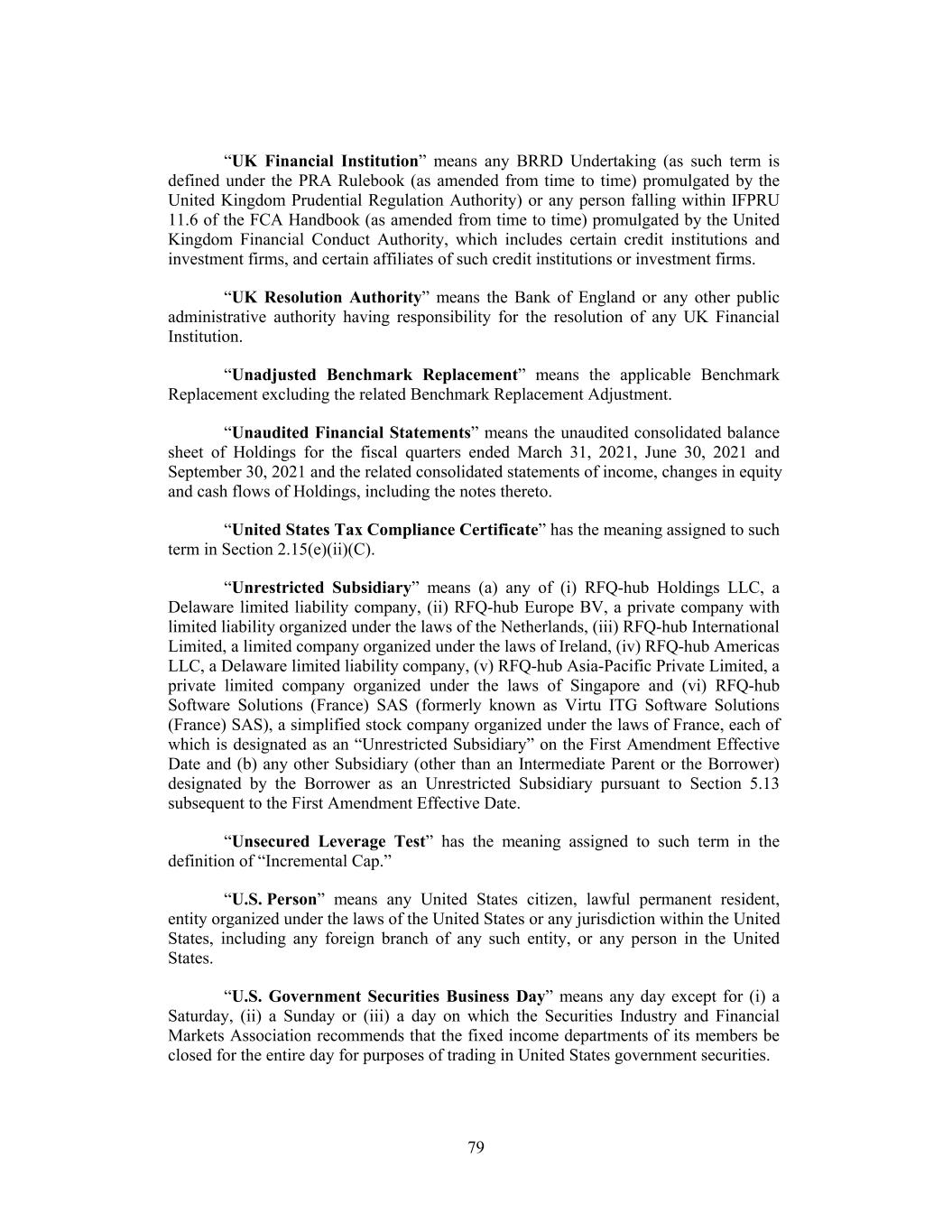 “UK Financial Institution” means any BRRD Undertaking (as such term is defined under the PRA Rulebook (as amended from time to time) promulgated by the United Kingdom Prudential Regulation Authority) or any person falling within IFPRU 11.6 of the FCA Handbook (as amended from time to time) promulgated by the United Kingdom Financial Conduct Authority, which includes certain credit institutions and investment firms, and certain affiliates of such credit institutions or investment firms. “UK Resolution Authority” means the Bank of England or any other public administrative authority having responsibility for the resolution of any UK Financial Institution. “Unadjusted Benchmark Replacement” means the applicable Benchmark Replacement excluding the related Benchmark Replacement Adjustment. “Unaudited Financial Statements” means the unaudited consolidated balance sheet of Holdings for the fiscal quarters ended March 31, 2021, June 30, 2021 and September 30, 2021 and the related consolidated statements of income, changes in equity and cash flows of Holdings, including the notes thereto. “United States Tax Compliance Certificate” has the meaning assigned to such term in Section 2.15(e)(ii)(C). “Unrestricted Subsidiary” means (a) any of (i) RFQ-hub Holdings LLC, a Delaware limited liability company, (ii) RFQ-hub Europe BV, a private company with limited liability organized under the laws of the Netherlands, (iii) RFQ-hub International Limited, a limited company organized under the laws of Ireland, (iv) RFQ-hub Americas LLC, a Delaware limited liability company, (v) RFQ-hub Asia-Pacific Private Limited, a private limited company organized under the laws of Singapore and (vi) RFQ-hub Software Solutions (France) SAS (formerly known as Virtu ITG Software Solutions (France) SAS), a simplified stock company organized under the laws of France, each of which is designated as an “Unrestricted Subsidiary” on the First Amendment Effective Date and (b) any other Subsidiary (other than an Intermediate Parent or the Borrower) designated by the Borrower as an Unrestricted Subsidiary pursuant to Section 5.13 subsequent to the First Amendment Effective Date. “Unsecured Leverage Test” has the meaning assigned to such term in the definition of “Incremental Cap.” “U.S. Person” means any United States citizen, lawful permanent resident, entity organized under the laws of the United States or any jurisdiction within the United States, including any foreign branch of any such entity, or any person in the United States. “U.S. Government Securities Business Day” means any day except for (i) a Saturday, (ii) a Sunday or (iii) a day on which the Securities Industry and Financial Markets Association recommends that the fixed income departments of its members be closed for the entire day for purposes of trading in United States government securities. 79