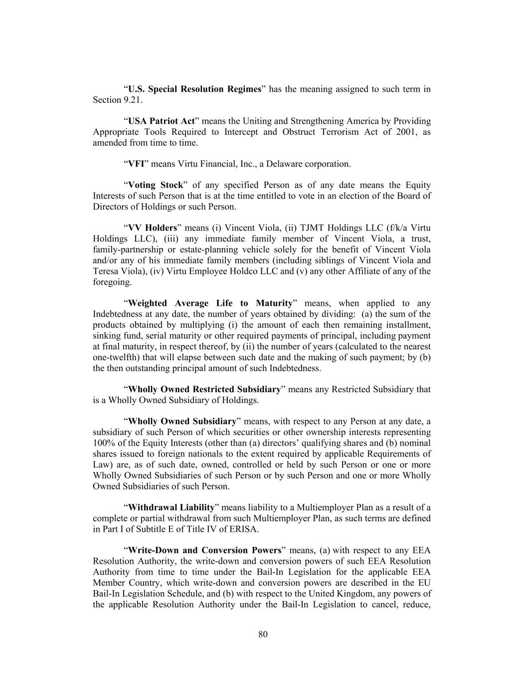 “U.S. Special Resolution Regimes” has the meaning assigned to such term in Section 9.21. “USA Patriot Act” means the Uniting and Strengthening America by Providing Appropriate Tools Required to Intercept and Obstruct Terrorism Act of 2001, as amended from time to time. “VFI” means Virtu Financial, Inc., a Delaware corporation. “Voting Stock” of any specified Person as of any date means the Equity Interests of such Person that is at the time entitled to vote in an election of the Board of Directors of Holdings or such Person. “VV Holders” means (i) Vincent Viola, (ii) TJMT Holdings LLC (f/k/a Virtu Holdings LLC), (iii) any immediate family member of Vincent Viola, a trust, family-partnership or estate-planning vehicle solely for the benefit of Vincent Viola and/or any of his immediate family members (including siblings of Vincent Viola and Teresa Viola), (iv) Virtu Employee Holdco LLC and (v) any other Affiliate of any of the foregoing. “Weighted Average Life to Maturity” means, when applied to any Indebtedness at any date, the number of years obtained by dividing: (a) the sum of the products obtained by multiplying (i) the amount of each then remaining installment, sinking fund, serial maturity or other required payments of principal, including payment at final maturity, in respect thereof, by (ii) the number of years (calculated to the nearest one-twelfth) that will elapse between such date and the making of such payment; by (b) the then outstanding principal amount of such Indebtedness. “Wholly Owned Restricted Subsidiary” means any Restricted Subsidiary that is a Wholly Owned Subsidiary of Holdings. “Wholly Owned Subsidiary” means, with respect to any Person at any date, a subsidiary of such Person of which securities or other ownership interests representing 100% of the Equity Interests (other than (a) directors’ qualifying shares and (b) nominal shares issued to foreign nationals to the extent required by applicable Requirements of Law) are, as of such date, owned, controlled or held by such Person or one or more Wholly Owned Subsidiaries of such Person or by such Person and one or more Wholly Owned Subsidiaries of such Person. “Withdrawal Liability” means liability to a Multiemployer Plan as a result of a complete or partial withdrawal from such Multiemployer Plan, as such terms are defined in Part I of Subtitle E of Title IV of ERISA. “Write-Down and Conversion Powers” means, (a) with respect to any EEA Resolution Authority, the write-down and conversion powers of such EEA Resolution Authority from time to time under the Bail-In Legislation for the applicable EEA Member Country, which write-down and conversion powers are described in the EU Bail-In Legislation Schedule, and (b) with respect to the United Kingdom, any powers of the applicable Resolution Authority under the Bail-In Legislation to cancel, reduce, 80