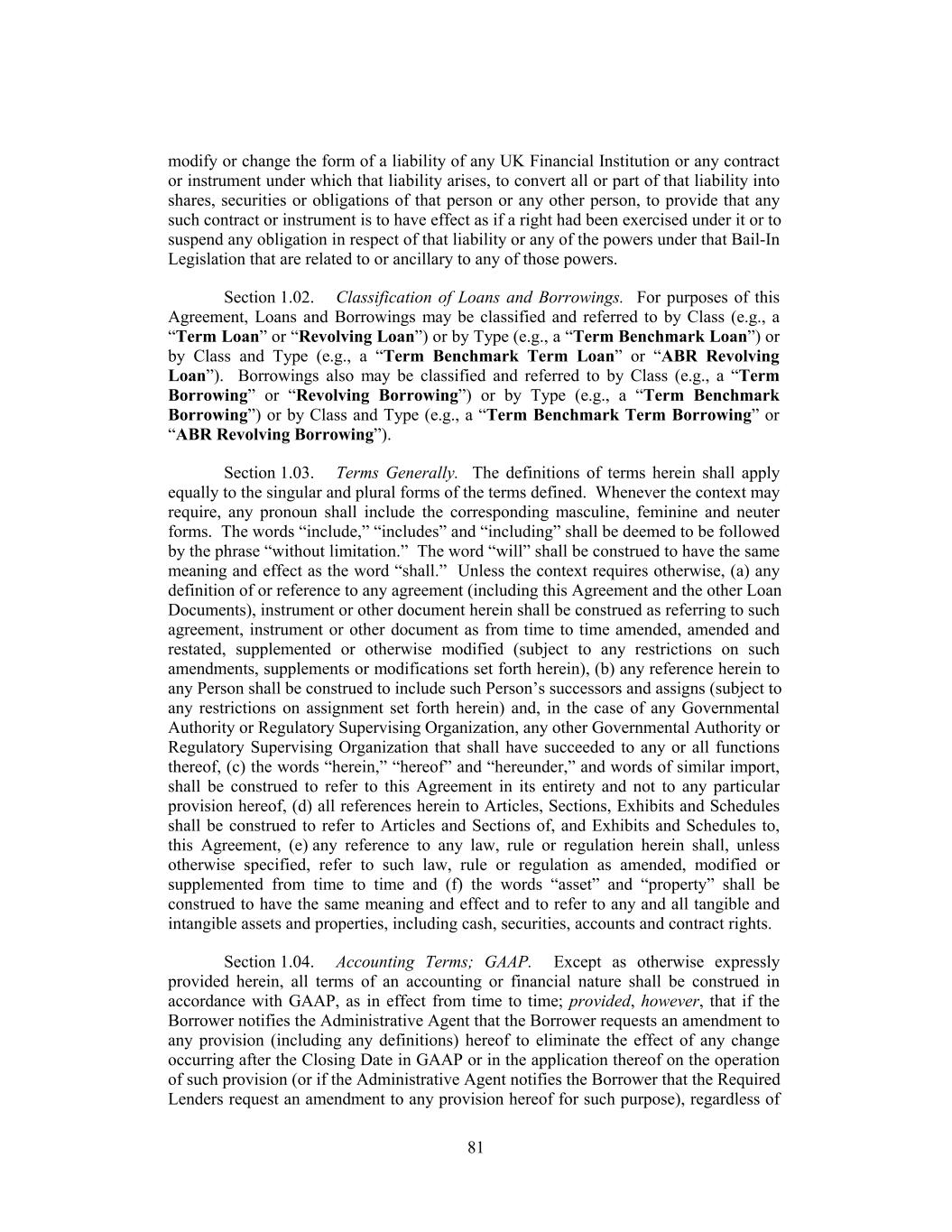modify or change the form of a liability of any UK Financial Institution or any contract or instrument under which that liability arises, to convert all or part of that liability into shares, securities or obligations of that person or any other person, to provide that any such contract or instrument is to have effect as if a right had been exercised under it or to suspend any obligation in respect of that liability or any of the powers under that Bail-In Legislation that are related to or ancillary to any of those powers. Section 1.02. Classification of Loans and Borrowings. For purposes of this Agreement, Loans and Borrowings may be classified and referred to by Class (e.g., a “Term Loan” or “Revolving Loan”) or by Type (e.g., a “Term Benchmark Loan”) or by Class and Type (e.g., a “Term Benchmark Term Loan” or “ABR Revolving Loan”). Borrowings also may be classified and referred to by Class (e.g., a “Term Borrowing” or “Revolving Borrowing”) or by Type (e.g., a “Term Benchmark Borrowing”) or by Class and Type (e.g., a “Term Benchmark Term Borrowing” or “ABR Revolving Borrowing”). Section 1.03. Terms Generally. The definitions of terms herein shall apply equally to the singular and plural forms of the terms defined. Whenever the context may require, any pronoun shall include the corresponding masculine, feminine and neuter forms. The words “include,” “includes” and “including” shall be deemed to be followed by the phrase “without limitation.” The word “will” shall be construed to have the same meaning and effect as the word “shall.” Unless the context requires otherwise, (a) any definition of or reference to any agreement (including this Agreement and the other Loan Documents), instrument or other document herein shall be construed as referring to such agreement, instrument or other document as from time to time amended, amended and restated, supplemented or otherwise modified (subject to any restrictions on such amendments, supplements or modifications set forth herein), (b) any reference herein to any Person shall be construed to include such Person’s successors and assigns (subject to any restrictions on assignment set forth herein) and, in the case of any Governmental Authority or Regulatory Supervising Organization, any other Governmental Authority or Regulatory Supervising Organization that shall have succeeded to any or all functions thereof, (c) the words “herein,” “hereof” and “hereunder,” and words of similar import, shall be construed to refer to this Agreement in its entirety and not to any particular provision hereof, (d) all references herein to Articles, Sections, Exhibits and Schedules shall be construed to refer to Articles and Sections of, and Exhibits and Schedules to, this Agreement, (e) any reference to any law, rule or regulation herein shall, unless otherwise specified, refer to such law, rule or regulation as amended, modified or supplemented from time to time and (f) the words “asset” and “property” shall be construed to have the same meaning and effect and to refer to any and all tangible and intangible assets and properties, including cash, securities, accounts and contract rights. Section 1.04. Accounting Terms; GAAP. Except as otherwise expressly provided herein, all terms of an accounting or financial nature shall be construed in accordance with GAAP, as in effect from time to time; provided, however, that if the Borrower notifies the Administrative Agent that the Borrower requests an amendment to any provision (including any definitions) hereof to eliminate the effect of any change occurring after the Closing Date in GAAP or in the application thereof on the operation of such provision (or if the Administrative Agent notifies the Borrower that the Required Lenders request an amendment to any provision hereof for such purpose), regardless of 81