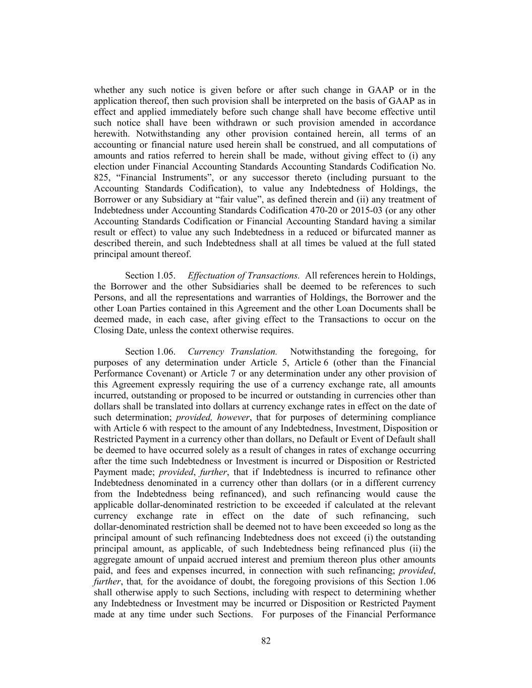 whether any such notice is given before or after such change in GAAP or in the application thereof, then such provision shall be interpreted on the basis of GAAP as in effect and applied immediately before such change shall have become effective until such notice shall have been withdrawn or such provision amended in accordance herewith. Notwithstanding any other provision contained herein, all terms of an accounting or financial nature used herein shall be construed, and all computations of amounts and ratios referred to herein shall be made, without giving effect to (i) any election under Financial Accounting Standards Accounting Standards Codification No. 825, “Financial Instruments”, or any successor thereto (including pursuant to the Accounting Standards Codification), to value any Indebtedness of Holdings, the Borrower or any Subsidiary at “fair value”, as defined therein and (ii) any treatment of Indebtedness under Accounting Standards Codification 470-20 or 2015-03 (or any other Accounting Standards Codification or Financial Accounting Standard having a similar result or effect) to value any such Indebtedness in a reduced or bifurcated manner as described therein, and such Indebtedness shall at all times be valued at the full stated principal amount thereof. Section 1.05. Effectuation of Transactions. All references herein to Holdings, the Borrower and the other Subsidiaries shall be deemed to be references to such Persons, and all the representations and warranties of Holdings, the Borrower and the other Loan Parties contained in this Agreement and the other Loan Documents shall be deemed made, in each case, after giving effect to the Transactions to occur on the Closing Date, unless the context otherwise requires. Section 1.06. Currency Translation. Notwithstanding the foregoing, for purposes of any determination under Article 5, Article 6 (other than the Financial Performance Covenant) or Article 7 or any determination under any other provision of this Agreement expressly requiring the use of a currency exchange rate, all amounts incurred, outstanding or proposed to be incurred or outstanding in currencies other than dollars shall be translated into dollars at currency exchange rates in effect on the date of such determination; provided, however, that for purposes of determining compliance with Article 6 with respect to the amount of any Indebtedness, Investment, Disposition or Restricted Payment in a currency other than dollars, no Default or Event of Default shall be deemed to have occurred solely as a result of changes in rates of exchange occurring after the time such Indebtedness or Investment is incurred or Disposition or Restricted Payment made; provided, further, that if Indebtedness is incurred to refinance other Indebtedness denominated in a currency other than dollars (or in a different currency from the Indebtedness being refinanced), and such refinancing would cause the applicable dollar-denominated restriction to be exceeded if calculated at the relevant currency exchange rate in effect on the date of such refinancing, such dollar-denominated restriction shall be deemed not to have been exceeded so long as the principal amount of such refinancing Indebtedness does not exceed (i) the outstanding principal amount, as applicable, of such Indebtedness being refinanced plus (ii) the aggregate amount of unpaid accrued interest and premium thereon plus other amounts paid, and fees and expenses incurred, in connection with such refinancing; provided, further, that, for the avoidance of doubt, the foregoing provisions of this Section 1.06 shall otherwise apply to such Sections, including with respect to determining whether any Indebtedness or Investment may be incurred or Disposition or Restricted Payment made at any time under such Sections. For purposes of the Financial Performance 82