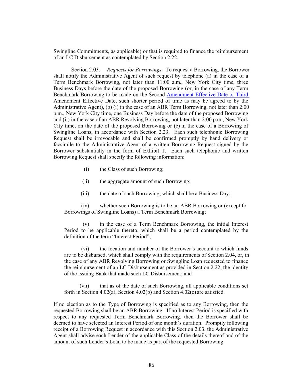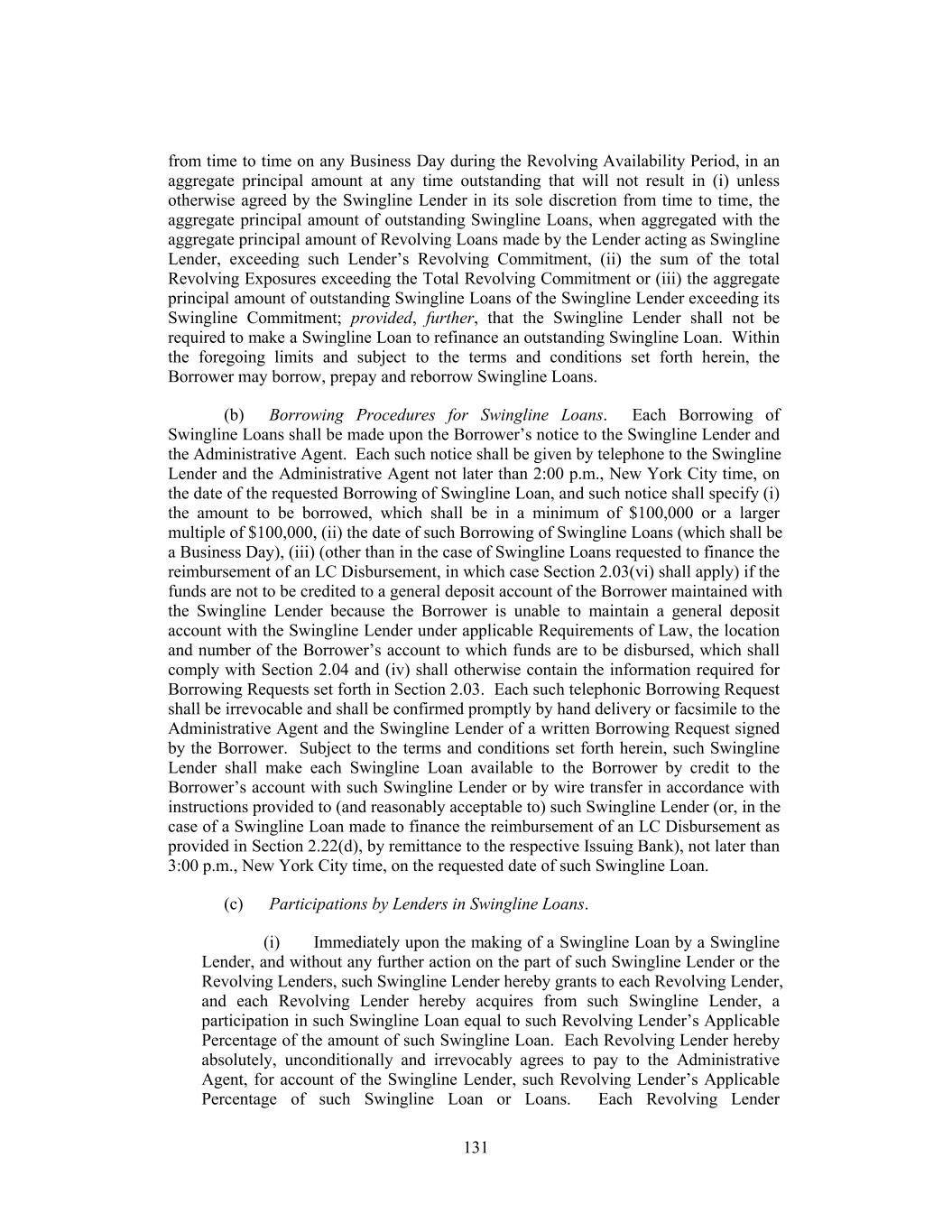 from time to time on any Business Day during the Revolving Availability Period, in an aggregate principal amount at any time outstanding that will not result in (i) unless otherwise agreed by the Swingline Lender in its sole discretion from time to time, the aggregate principal amount of outstanding Swingline Loans, when aggregated with the aggregate principal amount of Revolving Loans made by the Lender acting as Swingline Lender, exceeding such Lender’s Revolving Commitment, (ii) the sum of the total Revolving Exposures exceeding the Total Revolving Commitment or (iii) the aggregate principal amount of outstanding Swingline Loans of the Swingline Lender exceeding its Swingline Commitment; provided, further, that the Swingline Lender shall not be required to make a Swingline Loan to refinance an outstanding Swingline Loan. Within the foregoing limits and subject to the terms and conditions set forth herein, the Borrower may borrow, prepay and reborrow Swingline Loans. (b) Borrowing Procedures for Swingline Loans. Each Borrowing of Swingline Loans shall be made upon the Borrower’s notice to the Swingline Lender and the Administrative Agent. Each such notice shall be given by telephone to the Swingline Lender and the Administrative Agent not later than 2:00 p.m., New York City time, on the date of the requested Borrowing of Swingline Loan, and such notice shall specify (i) the amount to be borrowed, which shall be in a minimum of $100,000 or a larger multiple of $100,000, (ii) the date of such Borrowing of Swingline Loans (which shall be a Business Day), (iii) (other than in the case of Swingline Loans requested to finance the reimbursement of an LC Disbursement, in which case Section 2.03(vi) shall apply) if the funds are not to be credited to a general deposit account of the Borrower maintained with the Swingline Lender because the Borrower is unable to maintain a general deposit account with the Swingline Lender under applicable Requirements of Law, the location and number of the Borrower’s account to which funds are to be disbursed, which shall comply with Section 2.04 and (iv) shall otherwise contain the information required for Borrowing Requests set forth in Section 2.03. Each such telephonic Borrowing Request shall be irrevocable and shall be confirmed promptly by hand delivery or facsimile to the Administrative Agent and the Swingline Lender of a written Borrowing Request signed by the Borrower. Subject to the terms and conditions set forth herein, such Swingline Lender shall make each Swingline Loan available to the Borrower by credit to the Borrower’s account with such Swingline Lender or by wire transfer in accordance with instructions provided to (and reasonably acceptable to) such Swingline Lender (or, in the case of a Swingline Loan made to finance the reimbursement of an LC Disbursement as provided in Section 2.22(d), by remittance to the respective Issuing Bank), not later than 3:00 p.m., New York City time, on the requested date of such Swingline Loan. (c) Participations by Lenders in Swingline Loans. (i) Immediately upon the making of a Swingline Loan by a Swingline Lender, and without any further action on the part of such Swingline Lender or the Revolving Lenders, such Swingline Lender hereby grants to each Revolving Lender, and each Revolving Lender hereby acquires from such Swingline Lender, a participation in such Swingline Loan equal to such Revolving Lender’s Applicable Percentage of the amount of such Swingline Loan. Each Revolving Lender hereby absolutely, unconditionally and irrevocably agrees to pay to the Administrative Agent, for account of the Swingline Lender, such Revolving Lender’s Applicable Percentage of such Swingline Loan or Loans. Each Revolving Lender 131