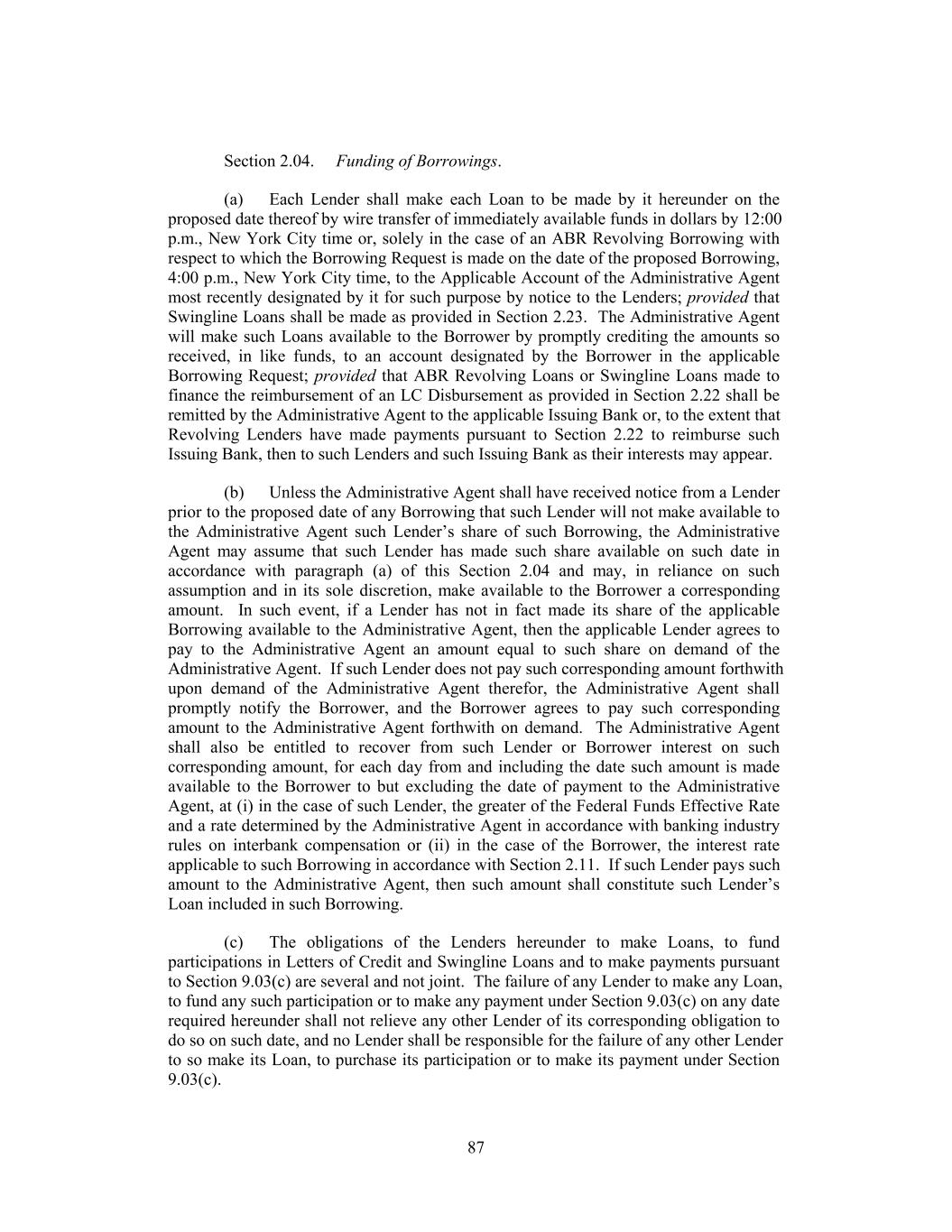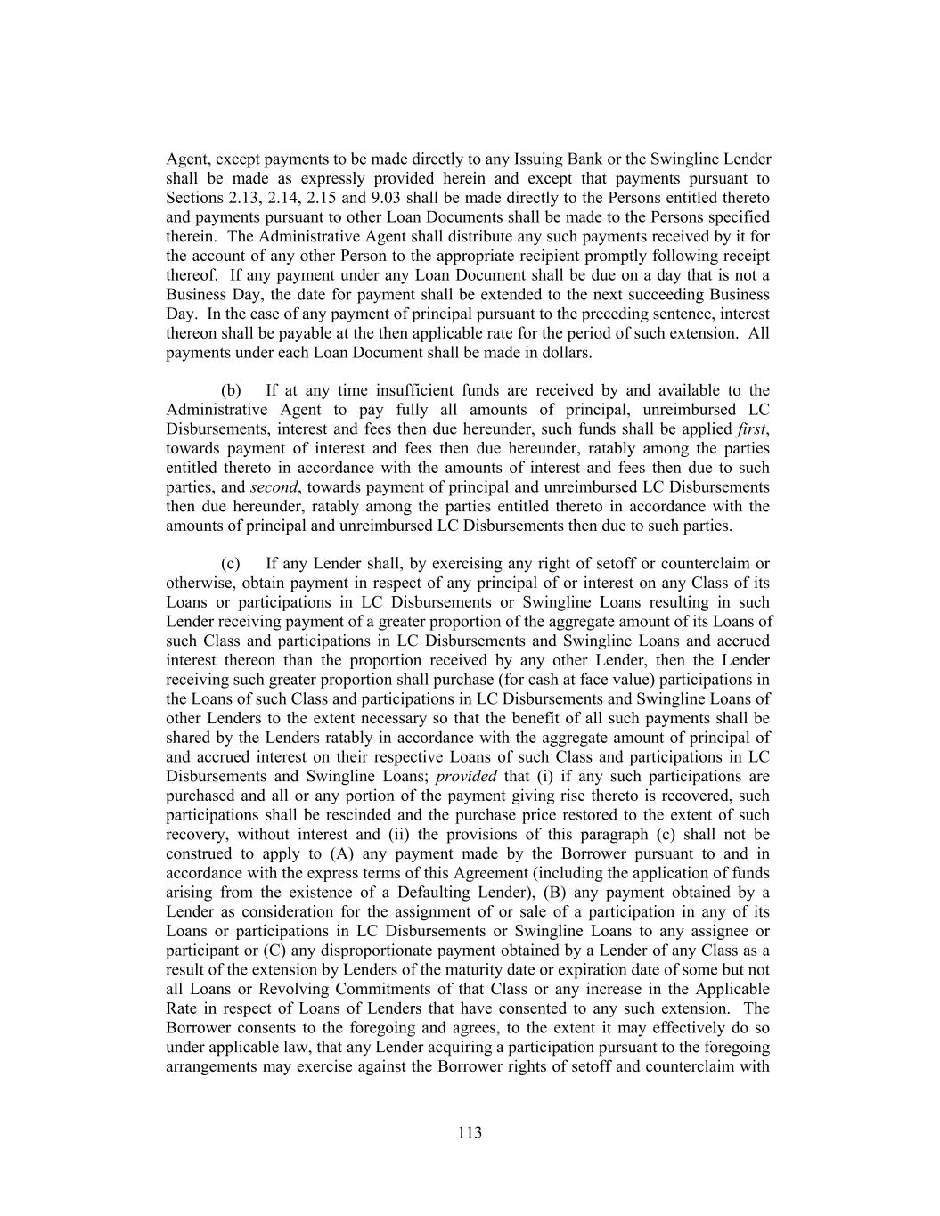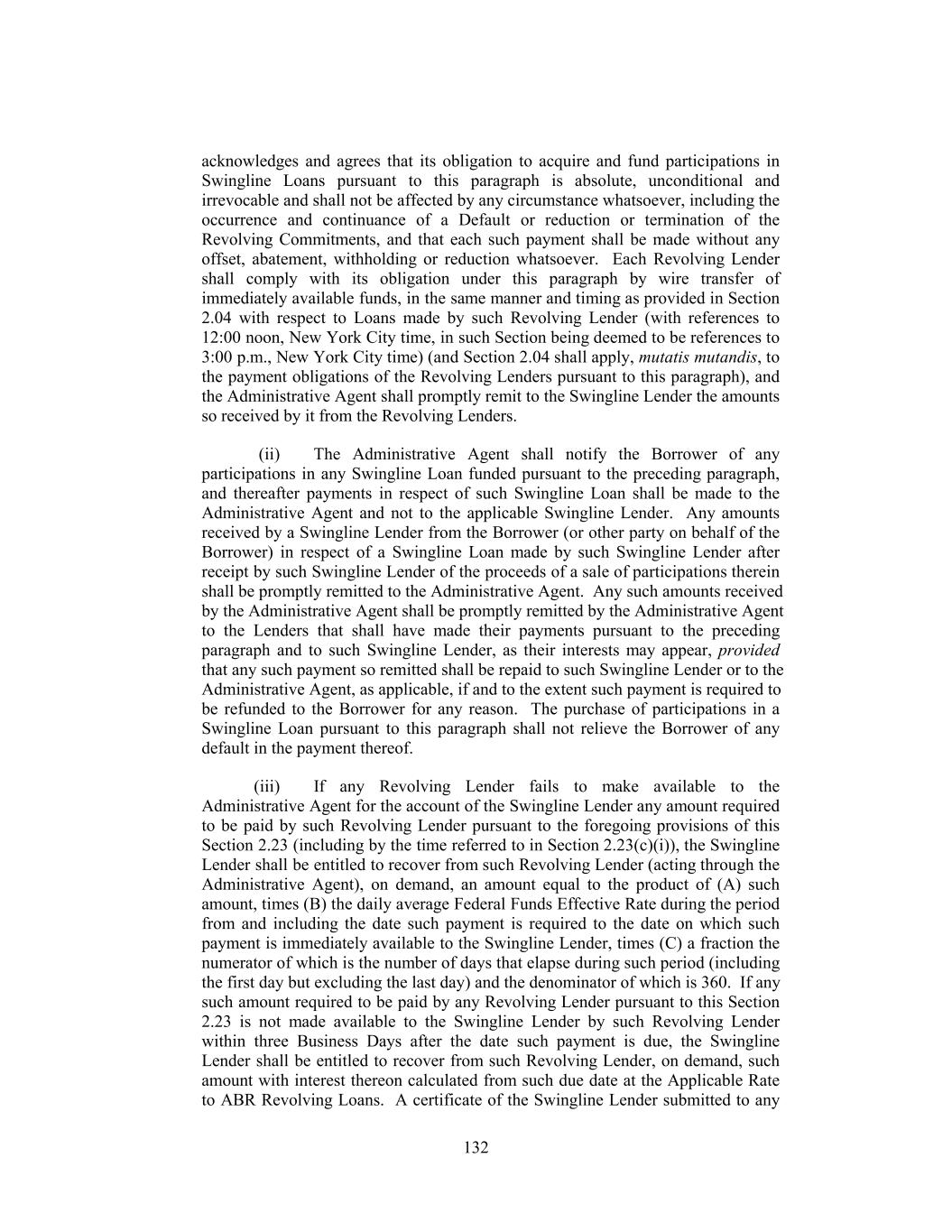 acknowledges and agrees that its obligation to acquire and fund participations in Swingline Loans pursuant to this paragraph is absolute, unconditional and irrevocable and shall not be affected by any circumstance whatsoever, including the occurrence and continuance of a Default or reduction or termination of the Revolving Commitments, and that each such payment shall be made without any offset, abatement, withholding or reduction whatsoever. Each Revolving Lender shall comply with its obligation under this paragraph by wire transfer of immediately available funds, in the same manner and timing as provided in Section 2.04 with respect to Loans made by such Revolving Lender (with references to 12:00 noon, New York City time, in such Section being deemed to be references to 3:00 p.m., New York City time) (and Section 2.04 shall apply, mutatis mutandis, to the payment obligations of the Revolving Lenders pursuant to this paragraph), and the Administrative Agent shall promptly remit to the Swingline Lender the amounts so received by it from the Revolving Lenders. (ii) The Administrative Agent shall notify the Borrower of any participations in any Swingline Loan funded pursuant to the preceding paragraph, and thereafter payments in respect of such Swingline Loan shall be made to the Administrative Agent and not to the applicable Swingline Lender. Any amounts received by a Swingline Lender from the Borrower (or other party on behalf of the Borrower) in respect of a Swingline Loan made by such Swingline Lender after receipt by such Swingline Lender of the proceeds of a sale of participations therein shall be promptly remitted to the Administrative Agent. Any such amounts received by the Administrative Agent shall be promptly remitted by the Administrative Agent to the Lenders that shall have made their payments pursuant to the preceding paragraph and to such Swingline Lender, as their interests may appear, provided that any such payment so remitted shall be repaid to such Swingline Lender or to the Administrative Agent, as applicable, if and to the extent such payment is required to be refunded to the Borrower for any reason. The purchase of participations in a Swingline Loan pursuant to this paragraph shall not relieve the Borrower of any default in the payment thereof. (iii) If any Revolving Lender fails to make available to the Administrative Agent for the account of the Swingline Lender any amount required to be paid by such Revolving Lender pursuant to the foregoing provisions of this Section 2.23 (including by the time referred to in Section 2.23(c)(i)), the Swingline Lender shall be entitled to recover from such Revolving Lender (acting through the Administrative Agent), on demand, an amount equal to the product of (A) such amount, times (B) the daily average Federal Funds Effective Rate during the period from and including the date such payment is required to the date on which such payment is immediately available to the Swingline Lender, times (C) a fraction the numerator of which is the number of days that elapse during such period (including the first day but excluding the last day) and the denominator of which is 360. If any such amount required to be paid by any Revolving Lender pursuant to this Section 2.23 is not made available to the Swingline Lender by such Revolving Lender within three Business Days after the date such payment is due, the Swingline Lender shall be entitled to recover from such Revolving Lender, on demand, such amount with interest thereon calculated from such due date at the Applicable Rate to ABR Revolving Loans. A certificate of the Swingline Lender submitted to any 132