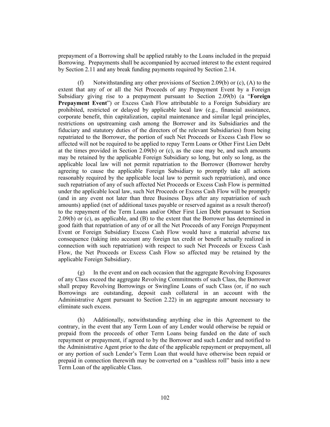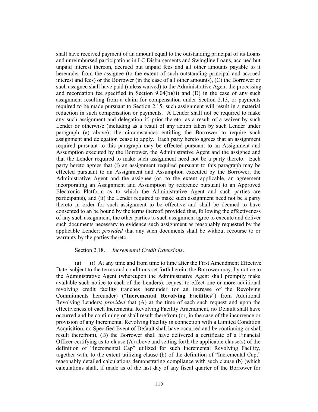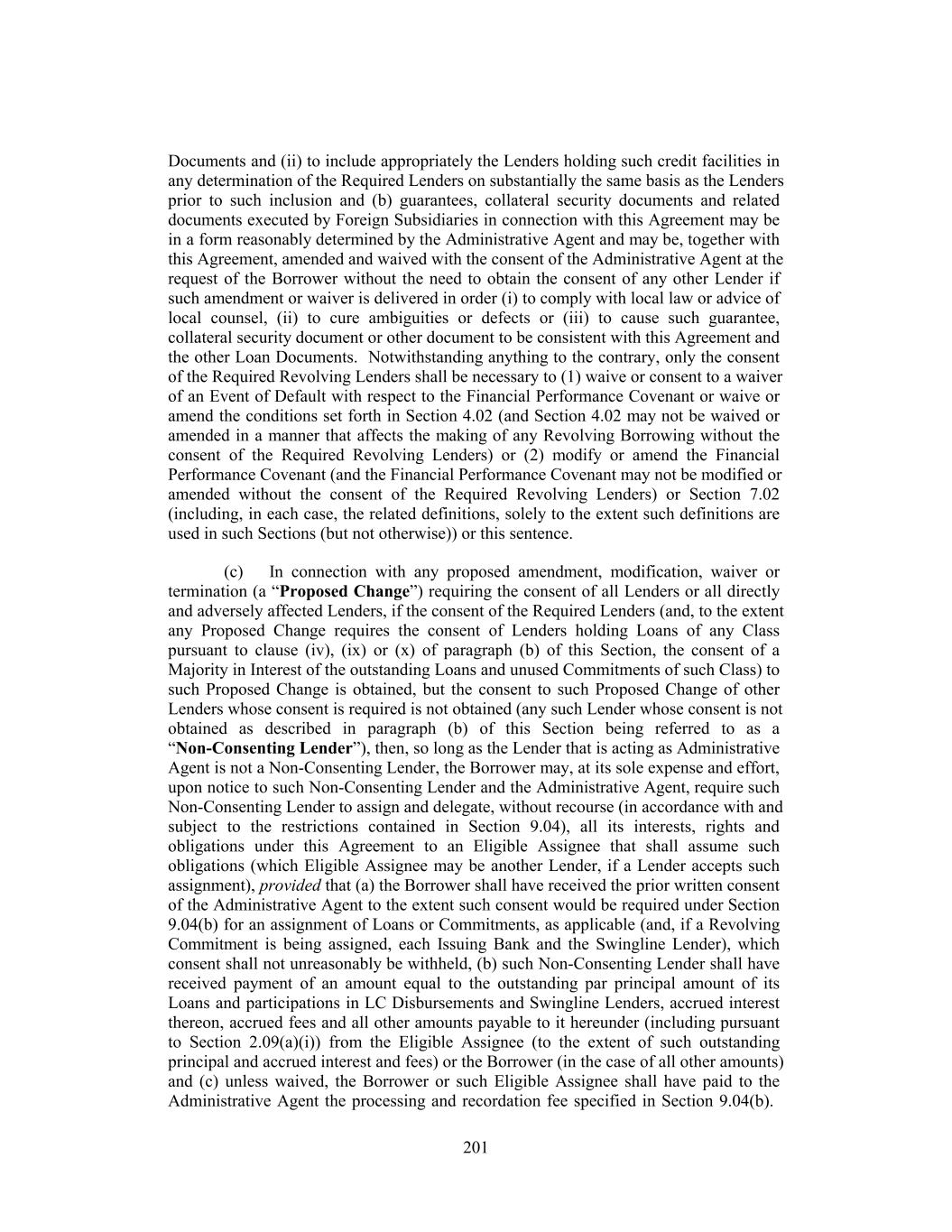 Documents and (ii) to include appropriately the Lenders holding such credit facilities in any determination of the Required Lenders on substantially the same basis as the Lenders prior to such inclusion and (b) guarantees, collateral security documents and related documents executed by Foreign Subsidiaries in connection with this Agreement may be in a form reasonably determined by the Administrative Agent and may be, together with this Agreement, amended and waived with the consent of the Administrative Agent at the request of the Borrower without the need to obtain the consent of any other Lender if such amendment or waiver is delivered in order (i) to comply with local law or advice of local counsel, (ii) to cure ambiguities or defects or (iii) to cause such guarantee, collateral security document or other document to be consistent with this Agreement and the other Loan Documents. Notwithstanding anything to the contrary, only the consent of the Required Revolving Lenders shall be necessary to (1) waive or consent to a waiver of an Event of Default with respect to the Financial Performance Covenant or waive or amend the conditions set forth in Section 4.02 (and Section 4.02 may not be waived or amended in a manner that affects the making of any Revolving Borrowing without the consent of the Required Revolving Lenders) or (2) modify or amend the Financial Performance Covenant (and the Financial Performance Covenant may not be modified or amended without the consent of the Required Revolving Lenders) or Section 7.02 (including, in each case, the related definitions, solely to the extent such definitions are used in such Sections (but not otherwise)) or this sentence. (c) In connection with any proposed amendment, modification, waiver or termination (a “Proposed Change”) requiring the consent of all Lenders or all directly and adversely affected Lenders, if the consent of the Required Lenders (and, to the extent any Proposed Change requires the consent of Lenders holding Loans of any Class pursuant to clause (iv), (ix) or (x) of paragraph (b) of this Section, the consent of a Majority in Interest of the outstanding Loans and unused Commitments of such Class) to such Proposed Change is obtained, but the consent to such Proposed Change of other Lenders whose consent is required is not obtained (any such Lender whose consent is not obtained as described in paragraph (b) of this Section being referred to as a “Non-Consenting Lender”), then, so long as the Lender that is acting as Administrative Agent is not a Non-Consenting Lender, the Borrower may, at its sole expense and effort, upon notice to such Non-Consenting Lender and the Administrative Agent, require such Non-Consenting Lender to assign and delegate, without recourse (in accordance with and subject to the restrictions contained in Section 9.04), all its interests, rights and obligations under this Agreement to an Eligible Assignee that shall assume such obligations (which Eligible Assignee may be another Lender, if a Lender accepts such assignment), provided that (a) the Borrower shall have received the prior written consent of the Administrative Agent to the extent such consent would be required under Section 9.04(b) for an assignment of Loans or Commitments, as applicable (and, if a Revolving Commitment is being assigned, each Issuing Bank and the Swingline Lender), which consent shall not unreasonably be withheld, (b) such Non-Consenting Lender shall have received payment of an amount equal to the outstanding par principal amount of its Loans and participations in LC Disbursements and Swingline Lenders, accrued interest thereon, accrued fees and all other amounts payable to it hereunder (including pursuant to Section 2.09(a)(i)) from the Eligible Assignee (to the extent of such outstanding principal and accrued interest and fees) or the Borrower (in the case of all other amounts) and (c) unless waived, the Borrower or such Eligible Assignee shall have paid to the Administrative Agent the processing and recordation fee specified in Section 9.04(b). 201