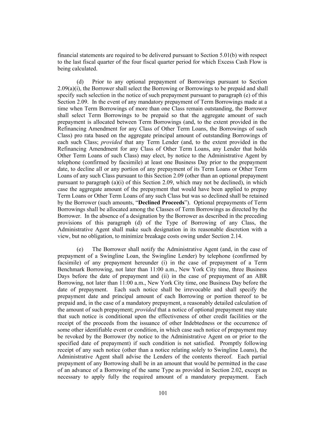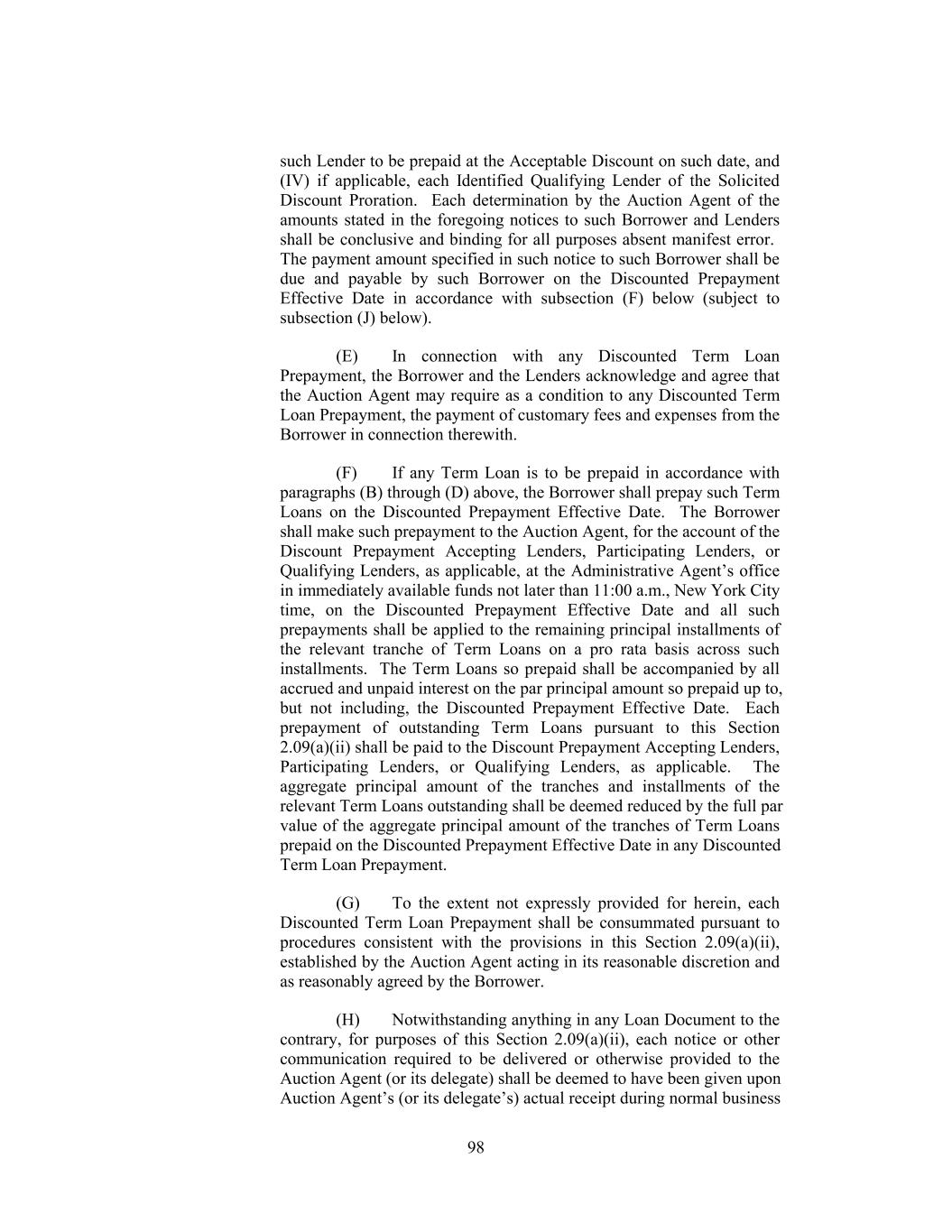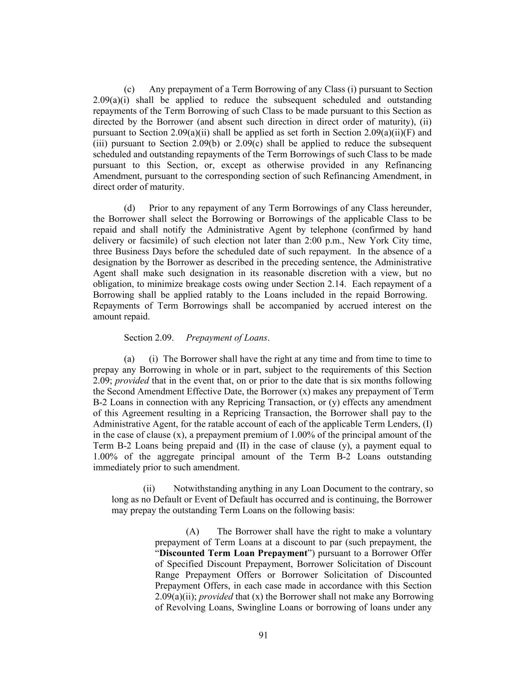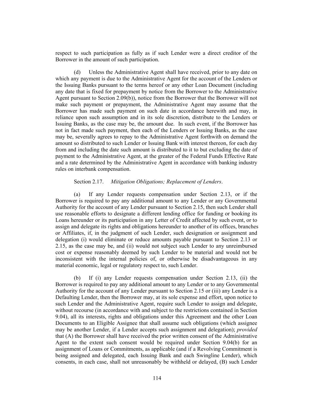 Documents and (ii) to include appropriately the Lenders holding such credit facilities in any determination of the Required Lenders on substantially the same basis as the Lenders prior to such inclusion and (b) guarantees, collateral security documents and related documents executed by Foreign Subsidiaries in connection with this Agreement may be in a form reasonably determined by the Administrative Agent and may be, together with this Agreement, amended and waived with the consent of the Administrative Agent at the request of the Borrower without the need to obtain the consent of any other Lender if such amendment or waiver is delivered in order (i) to comply with local law or advice of local counsel, (ii) to cure ambiguities or defects or (iii) to cause such guarantee, collateral security document or other document to be consistent with this Agreement and the other Loan Documents. Notwithstanding anything to the contrary, only the consent of the Required Revolving Lenders shall be necessary to (1) waive or consent to a waiver of an Event of Default with respect to the Financial Performance Covenant or waive or amend the conditions set forth in Section 4.02 (and Section 4.02 may not be waived or amended in a manner that affects the making of any Revolving Borrowing without the consent of the Required Revolving Lenders) or (2) modify or amend the Financial Performance Covenant (and the Financial Performance Covenant may not be modified or amended without the consent of the Required Revolving Lenders) or Section 7.02 (including, in each case, the related definitions, solely to the extent such definitions are used in such Sections (but not otherwise)) or this sentence. (c) In connection with any proposed amendment, modification, waiver or termination (a “Proposed Change”) requiring the consent of all Lenders or all directly and adversely affected Lenders, if the consent of the Required Lenders (and, to the extent any Proposed Change requires the consent of Lenders holding Loans of any Class pursuant to clause (iv), (ix) or (x) of paragraph (b) of this Section, the consent of a Majority in Interest of the outstanding Loans and unused Commitments of such Class) to such Proposed Change is obtained, but the consent to such Proposed Change of other Lenders whose consent is required is not obtained (any such Lender whose consent is not obtained as described in paragraph (b) of this Section being referred to as a “Non-Consenting Lender”), then, so long as the Lender that is acting as Administrative Agent is not a Non-Consenting Lender, the Borrower may, at its sole expense and effort, upon notice to such Non-Consenting Lender and the Administrative Agent, require such Non-Consenting Lender to assign and delegate, without recourse (in accordance with and subject to the restrictions contained in Section 9.04), all its interests, rights and obligations under this Agreement to an Eligible Assignee that shall assume such obligations (which Eligible Assignee may be another Lender, if a Lender accepts such assignment), provided that (a) the Borrower shall have received the prior written consent of the Administrative Agent to the extent such consent would be required under Section 9.04(b) for an assignment of Loans or Commitments, as applicable (and, if a Revolving Commitment is being assigned, each Issuing Bank and the Swingline Lender), which consent shall not unreasonably be withheld, (b) such Non-Consenting Lender shall have received payment of an amount equal to the outstanding par principal amount of its Loans and participations in LC Disbursements and Swingline Lenders, accrued interest thereon, accrued fees and all other amounts payable to it hereunder (including pursuant to Section 2.09(a)(i)) from the Eligible Assignee (to the extent of such outstanding principal and accrued interest and fees) or the Borrower (in the case of all other amounts) and (c) unless waived, the Borrower or such Eligible Assignee shall have paid to the Administrative Agent the processing and recordation fee specified in Section 9.04(b). 201