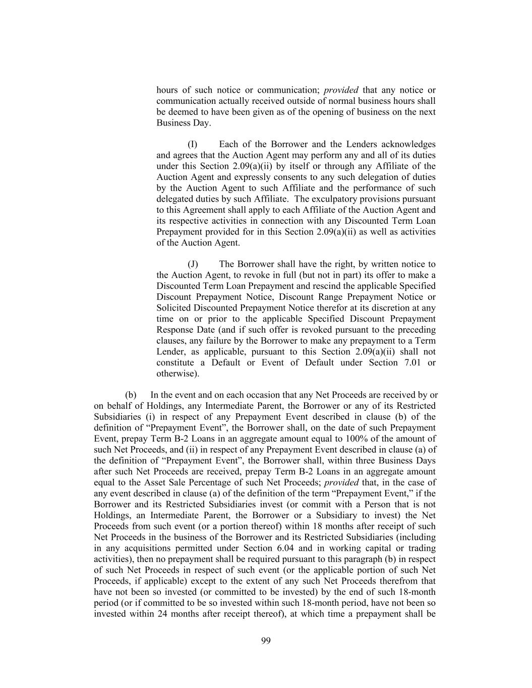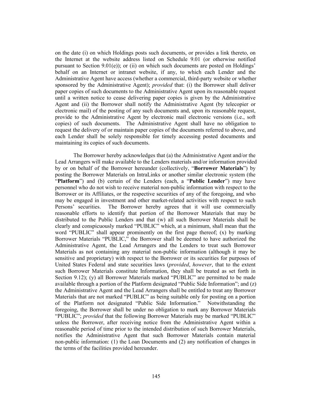 on the date (i) on which Holdings posts such documents, or provides a link thereto, on the Internet at the website address listed on Schedule 9.01 (or otherwise notified pursuant to Section 9.01(e)); or (ii) on which such documents are posted on Holdings’ behalf on an Internet or intranet website, if any, to which each Lender and the Administrative Agent have access (whether a commercial, third-party website or whether sponsored by the Administrative Agent); provided that: (i) the Borrower shall deliver paper copies of such documents to the Administrative Agent upon its reasonable request until a written notice to cease delivering paper copies is given by the Administrative Agent and (ii) the Borrower shall notify the Administrative Agent (by telecopier or electronic mail) of the posting of any such documents and, upon its reasonable request, provide to the Administrative Agent by electronic mail electronic versions (i.e., soft copies) of such documents. The Administrative Agent shall have no obligation to request the delivery of or maintain paper copies of the documents referred to above, and each Lender shall be solely responsible for timely accessing posted documents and maintaining its copies of such documents. The Borrower hereby acknowledges that (a) the Administrative Agent and/or the Lead Arrangers will make available to the Lenders materials and/or information provided by or on behalf of the Borrower hereunder (collectively, “Borrower Materials”) by posting the Borrower Materials on IntraLinks or another similar electronic system (the “Platform”) and (b) certain of the Lenders (each, a “Public Lender”) may have personnel who do not wish to receive material non-public information with respect to the Borrower or its Affiliates, or the respective securities of any of the foregoing, and who may be engaged in investment and other market-related activities with respect to such Persons’ securities. The Borrower hereby agrees that it will use commercially reasonable efforts to identify that portion of the Borrower Materials that may be distributed to the Public Lenders and that (w) all such Borrower Materials shall be clearly and conspicuously marked “PUBLIC” which, at a minimum, shall mean that the word “PUBLIC” shall appear prominently on the first page thereof; (x) by marking Borrower Materials “PUBLIC,” the Borrower shall be deemed to have authorized the Administrative Agent, the Lead Arrangers and the Lenders to treat such Borrower Materials as not containing any material non-public information (although it may be sensitive and proprietary) with respect to the Borrower or its securities for purposes of United States Federal and state securities laws (provided, however, that to the extent such Borrower Materials constitute Information, they shall be treated as set forth in Section 9.12); (y) all Borrower Materials marked “PUBLIC” are permitted to be made available through a portion of the Platform designated “Public Side Information”; and (z) the Administrative Agent and the Lead Arrangers shall be entitled to treat any Borrower Materials that are not marked “PUBLIC” as being suitable only for posting on a portion of the Platform not designated “Public Side Information.” Notwithstanding the foregoing, the Borrower shall be under no obligation to mark any Borrower Materials “PUBLIC”; provided that the following Borrower Materials may be marked “PUBLIC” unless the Borrower, after receiving notice from the Administrative Agent within a reasonable period of time prior to the intended distribution of such Borrower Materials, notifies the Administrative Agent that such Borrower Materials contain material non-public information: (1) the Loan Documents and (2) any notification of changes in the terms of the facilities provided hereunder. 145