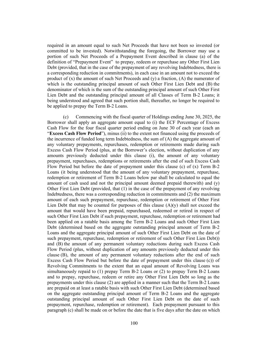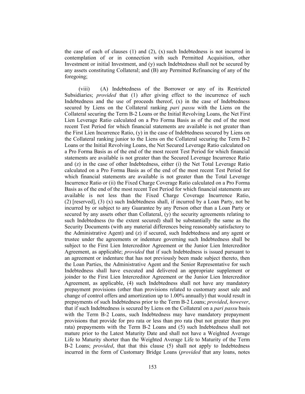 the case of each of clauses (1) and (2), (x) such Indebtedness is not incurred in contemplation of or in connection with such Permitted Acquisition, other Investment or initial Investment, and (y) such Indebtedness shall not be secured by any assets constituting Collateral; and (B) any Permitted Refinancing of any of the foregoing; (viii) (A) Indebtedness of the Borrower or any of its Restricted Subsidiaries; provided that (1) after giving effect to the incurrence of such Indebtedness and the use of proceeds thereof, (x) in the case of Indebtedness secured by Liens on the Collateral ranking pari passu with the Liens on the Collateral securing the Term B-2 Loans or the Initial Revolving Loans, the Net First Lien Leverage Ratio calculated on a Pro Forma Basis as of the end of the most recent Test Period for which financial statements are available is not greater than the First Lien Incurrence Ratio, (y) in the case of Indebtedness secured by Liens on the Collateral ranking junior to the Liens on the Collateral securing the Term B-2 Loans or the Initial Revolving Loans, the Net Secured Leverage Ratio calculated on a Pro Forma Basis as of the end of the most recent Test Period for which financial statements are available is not greater than the Secured Leverage Incurrence Ratio and (z) in the case of other Indebtedness, either (i) the Net Total Leverage Ratio calculated on a Pro Forma Basis as of the end of the most recent Test Period for which financial statements are available is not greater than the Total Leverage Incurrence Ratio or (ii) the Fixed Charge Coverage Ratio calculated on a Pro Forma Basis as of the end of the most recent Test Period for which financial statements are available is not less than the Fixed Charge Coverage Incurrence Ratio, (2) [reserved], (3) (x) such Indebtedness shall, if incurred by a Loan Party, not be incurred by or subject to any Guarantee by any Person other than a Loan Party or secured by any assets other than Collateral, (y) the security agreements relating to such Indebtedness (to the extent secured) shall be substantially the same as the Security Documents (with any material differences being reasonably satisfactory to the Administrative Agent) and (z) if secured, such Indebtedness and any agent or trustee under the agreements or indenture governing such Indebtedness shall be subject to the First Lien Intercreditor Agreement or the Junior Lien Intercreditor Agreement, as applicable; provided that if such Indebtedness is issued pursuant to an agreement or indenture that has not previously been made subject thereto, then the Loan Parties, the Administrative Agent and the Senior Representative for such Indebtedness shall have executed and delivered an appropriate supplement or joinder to the First Lien Intercreditor Agreement or the Junior Lien Intercreditor Agreement, as applicable, (4) such Indebtedness shall not have any mandatory prepayment provisions (other than provisions related to customary asset sale and change of control offers and amortization up to 1.00% annually) that would result in prepayments of such Indebtedness prior to the Term B-2 Loans; provided, however, that if such Indebtedness is secured by Liens on the Collateral on a pari passu basis with the Term B-2 Loans, such Indebtedness may have mandatory prepayment provisions that provide for pro rata or less than pro rata (but not greater than pro rata) prepayments with the Term B-2 Loans and (5) such Indebtedness shall not mature prior to the Latest Maturity Date and shall not have a Weighted Average Life to Maturity shorter than the Weighted Average Life to Maturity of the Term B-2 Loans; provided, that that this clause (5) shall not apply to Indebtedness incurred in the form of Customary Bridge Loans (provided that any loans, notes 153