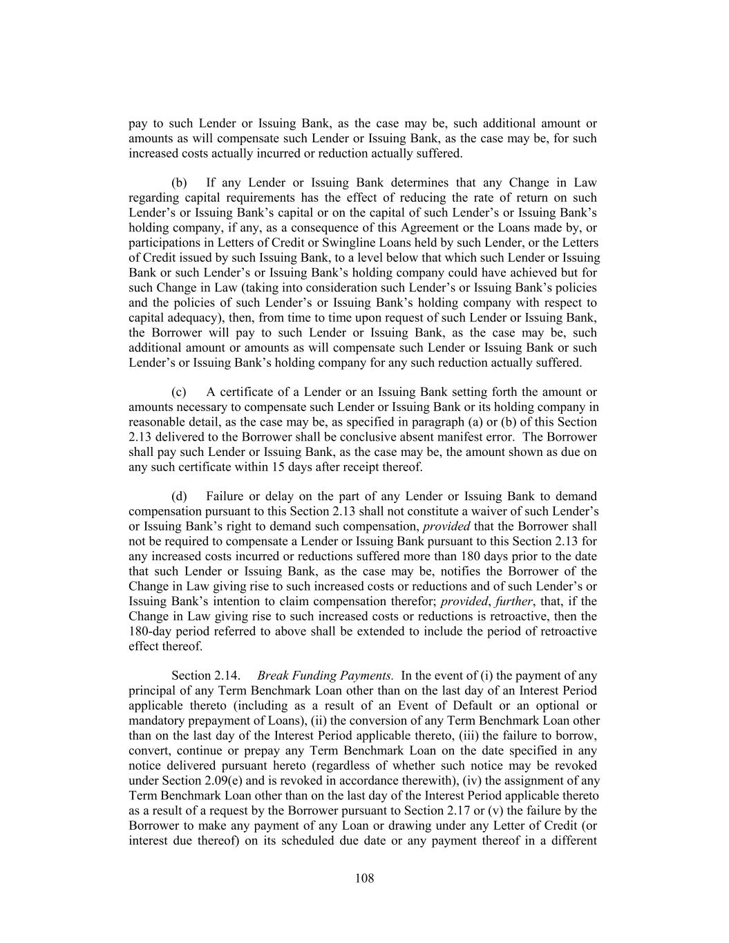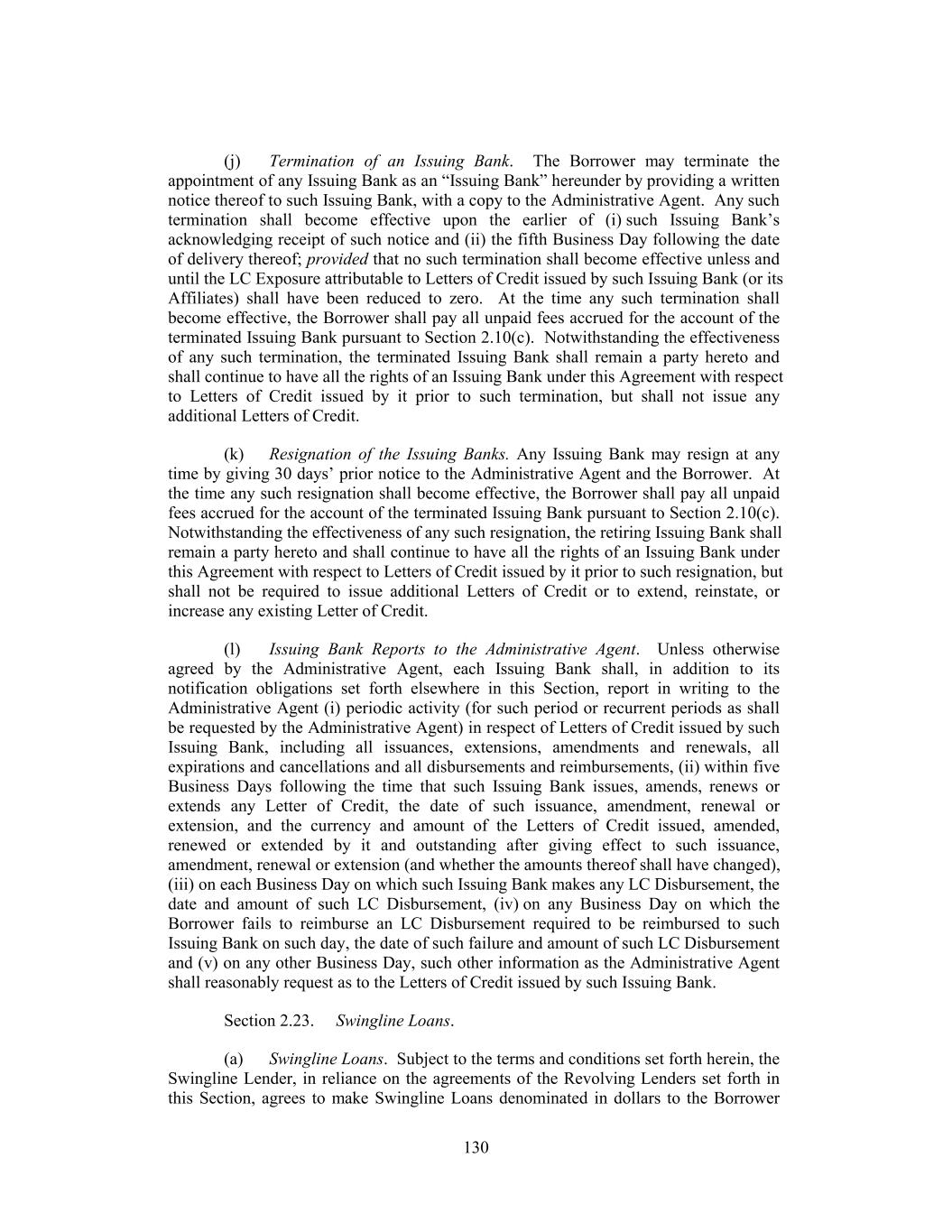 (j) Termination of an Issuing Bank. The Borrower may terminate the appointment of any Issuing Bank as an “Issuing Bank” hereunder by providing a written notice thereof to such Issuing Bank, with a copy to the Administrative Agent. Any such termination shall become effective upon the earlier of (i) such Issuing Bank’s acknowledging receipt of such notice and (ii) the fifth Business Day following the date of delivery thereof; provided that no such termination shall become effective unless and until the LC Exposure attributable to Letters of Credit issued by such Issuing Bank (or its Affiliates) shall have been reduced to zero. At the time any such termination shall become effective, the Borrower shall pay all unpaid fees accrued for the account of the terminated Issuing Bank pursuant to Section 2.10(c). Notwithstanding the effectiveness of any such termination, the terminated Issuing Bank shall remain a party hereto and shall continue to have all the rights of an Issuing Bank under this Agreement with respect to Letters of Credit issued by it prior to such termination, but shall not issue any additional Letters of Credit. (k) Resignation of the Issuing Banks. Any Issuing Bank may resign at any time by giving 30 days’ prior notice to the Administrative Agent and the Borrower. At the time any such resignation shall become effective, the Borrower shall pay all unpaid fees accrued for the account of the terminated Issuing Bank pursuant to Section 2.10(c). Notwithstanding the effectiveness of any such resignation, the retiring Issuing Bank shall remain a party hereto and shall continue to have all the rights of an Issuing Bank under this Agreement with respect to Letters of Credit issued by it prior to such resignation, but shall not be required to issue additional Letters of Credit or to extend, reinstate, or increase any existing Letter of Credit. (l) Issuing Bank Reports to the Administrative Agent. Unless otherwise agreed by the Administrative Agent, each Issuing Bank shall, in addition to its notification obligations set forth elsewhere in this Section, report in writing to the Administrative Agent (i) periodic activity (for such period or recurrent periods as shall be requested by the Administrative Agent) in respect of Letters of Credit issued by such Issuing Bank, including all issuances, extensions, amendments and renewals, all expirations and cancellations and all disbursements and reimbursements, (ii) within five Business Days following the time that such Issuing Bank issues, amends, renews or extends any Letter of Credit, the date of such issuance, amendment, renewal or extension, and the currency and amount of the Letters of Credit issued, amended, renewed or extended by it and outstanding after giving effect to such issuance, amendment, renewal or extension (and whether the amounts thereof shall have changed), (iii) on each Business Day on which such Issuing Bank makes any LC Disbursement, the date and amount of such LC Disbursement, (iv) on any Business Day on which the Borrower fails to reimburse an LC Disbursement required to be reimbursed to such Issuing Bank on such day, the date of such failure and amount of such LC Disbursement and (v) on any other Business Day, such other information as the Administrative Agent shall reasonably request as to the Letters of Credit issued by such Issuing Bank. Section 2.23. Swingline Loans. (a) Swingline Loans. Subject to the terms and conditions set forth herein, the Swingline Lender, in reliance on the agreements of the Revolving Lenders set forth in this Section, agrees to make Swingline Loans denominated in dollars to the Borrower 130