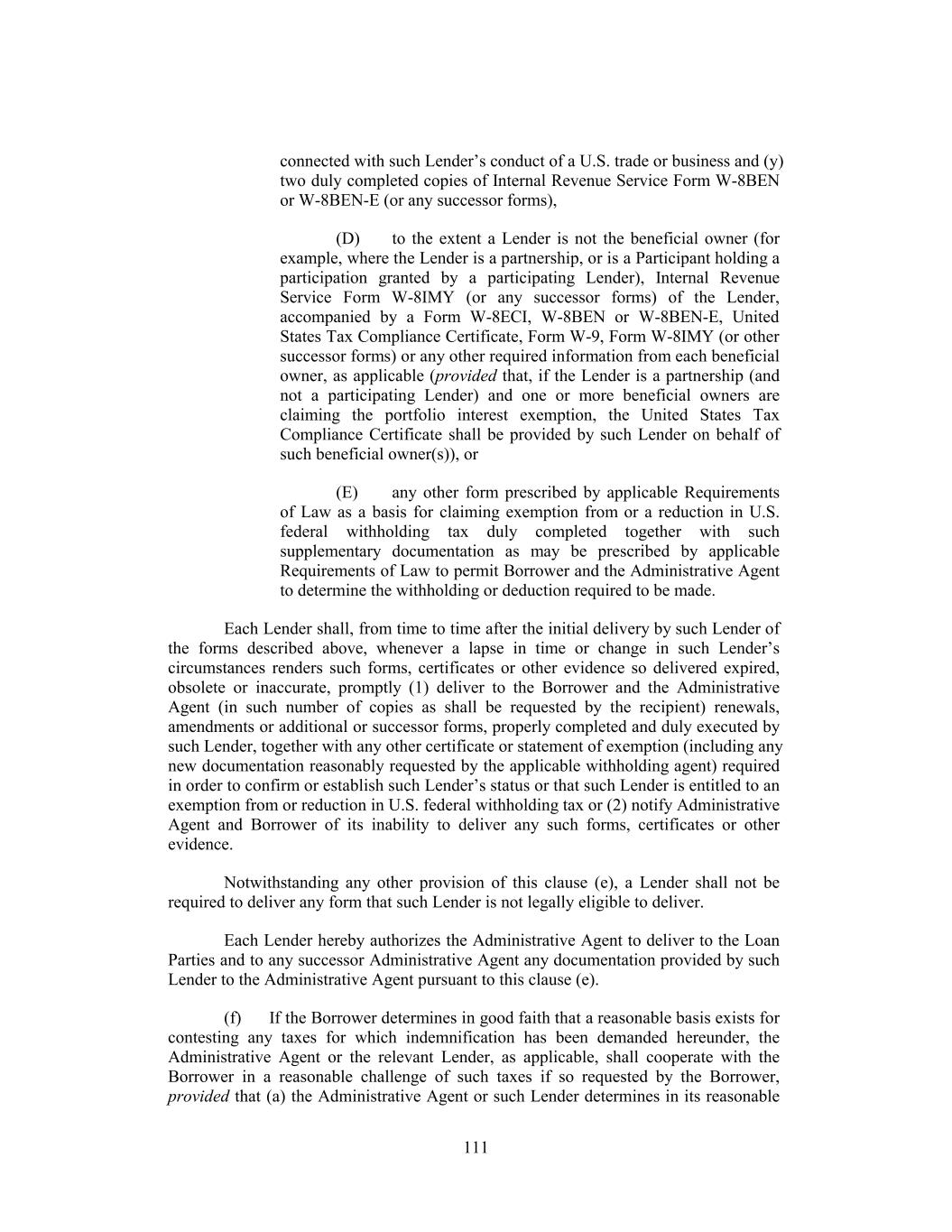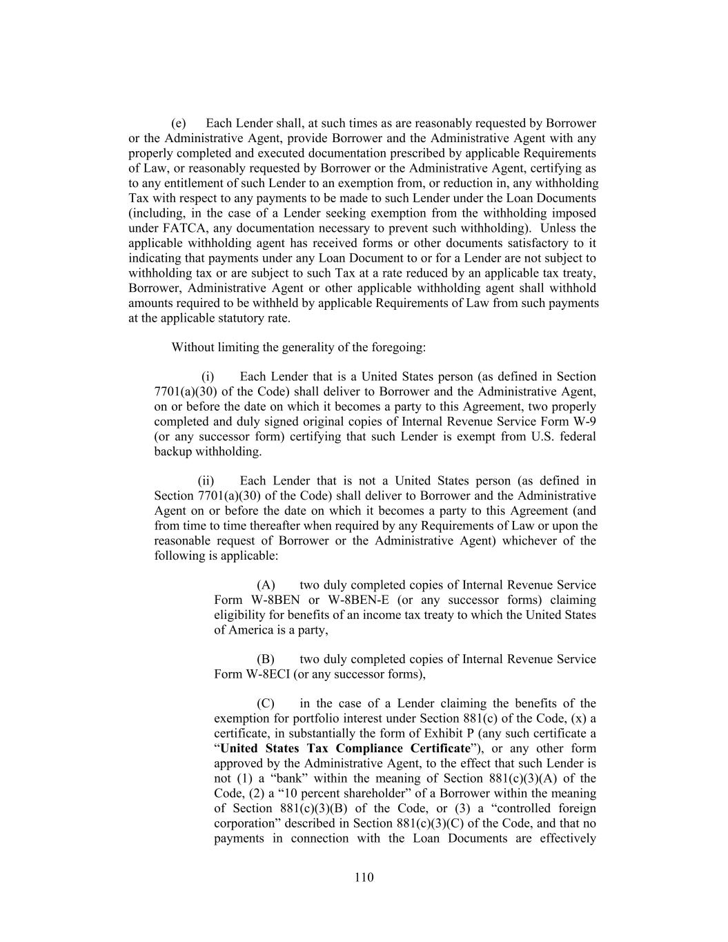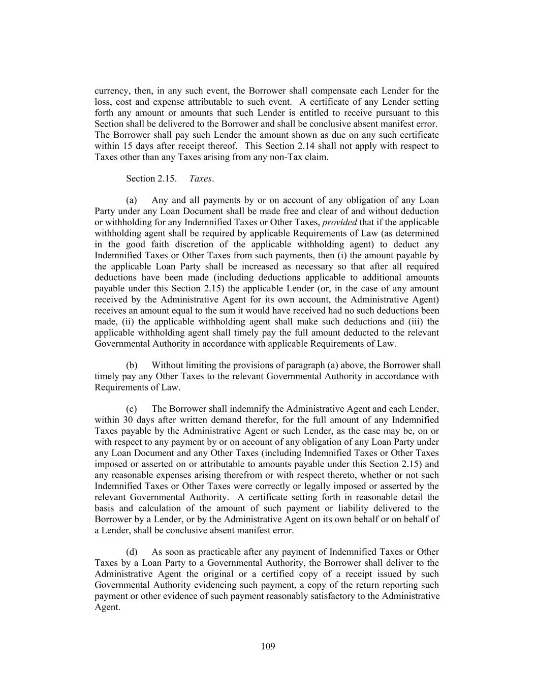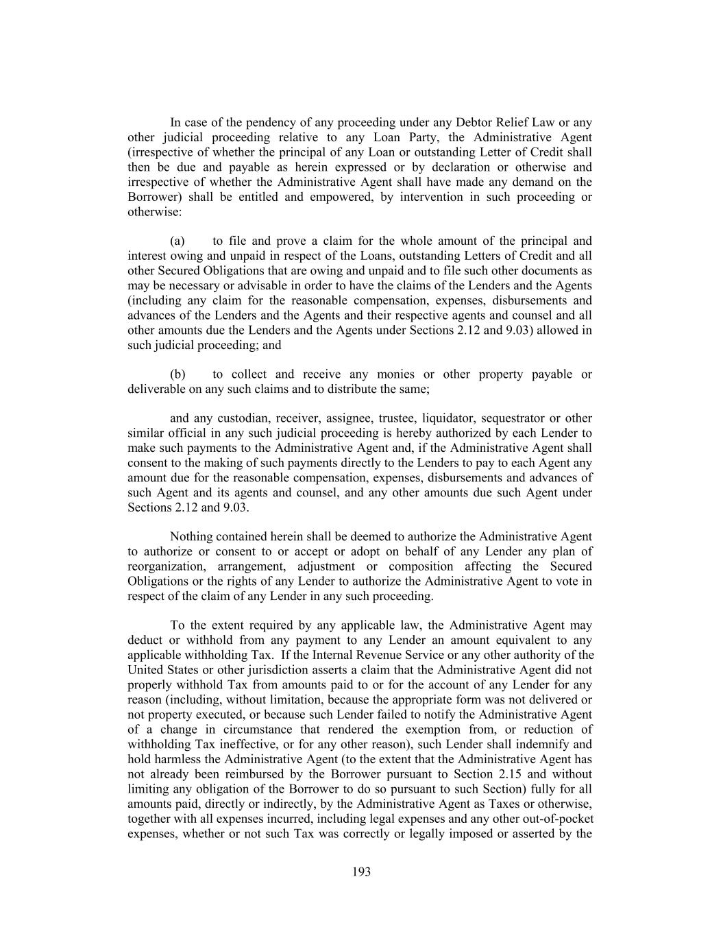 In case of the pendency of any proceeding under any Debtor Relief Law or any other judicial proceeding relative to any Loan Party, the Administrative Agent (irrespective of whether the principal of any Loan or outstanding Letter of Credit shall then be due and payable as herein expressed or by declaration or otherwise and irrespective of whether the Administrative Agent shall have made any demand on the Borrower) shall be entitled and empowered, by intervention in such proceeding or otherwise: (a) to file and prove a claim for the whole amount of the principal and interest owing and unpaid in respect of the Loans, outstanding Letters of Credit and all other Secured Obligations that are owing and unpaid and to file such other documents as may be necessary or advisable in order to have the claims of the Lenders and the Agents (including any claim for the reasonable compensation, expenses, disbursements and advances of the Lenders and the Agents and their respective agents and counsel and all other amounts due the Lenders and the Agents under Sections 2.12 and 9.03) allowed in such judicial proceeding; and (b) to collect and receive any monies or other property payable or deliverable on any such claims and to distribute the same; and any custodian, receiver, assignee, trustee, liquidator, sequestrator or other similar official in any such judicial proceeding is hereby authorized by each Lender to make such payments to the Administrative Agent and, if the Administrative Agent shall consent to the making of such payments directly to the Lenders to pay to each Agent any amount due for the reasonable compensation, expenses, disbursements and advances of such Agent and its agents and counsel, and any other amounts due such Agent under Sections 2.12 and 9.03. Nothing contained herein shall be deemed to authorize the Administrative Agent to authorize or consent to or accept or adopt on behalf of any Lender any plan of reorganization, arrangement, adjustment or composition affecting the Secured Obligations or the rights of any Lender to authorize the Administrative Agent to vote in respect of the claim of any Lender in any such proceeding. To the extent required by any applicable law, the Administrative Agent may deduct or withhold from any payment to any Lender an amount equivalent to any applicable withholding Tax. If the Internal Revenue Service or any other authority of the United States or other jurisdiction asserts a claim that the Administrative Agent did not properly withhold Tax from amounts paid to or for the account of any Lender for any reason (including, without limitation, because the appropriate form was not delivered or not property executed, or because such Lender failed to notify the Administrative Agent of a change in circumstance that rendered the exemption from, or reduction of withholding Tax ineffective, or for any other reason), such Lender shall indemnify and hold harmless the Administrative Agent (to the extent that the Administrative Agent has not already been reimbursed by the Borrower pursuant to Section 2.15 and without limiting any obligation of the Borrower to do so pursuant to such Section) fully for all amounts paid, directly or indirectly, by the Administrative Agent as Taxes or otherwise, together with all expenses incurred, including legal expenses and any other out-of-pocket expenses, whether or not such Tax was correctly or legally imposed or asserted by the 193