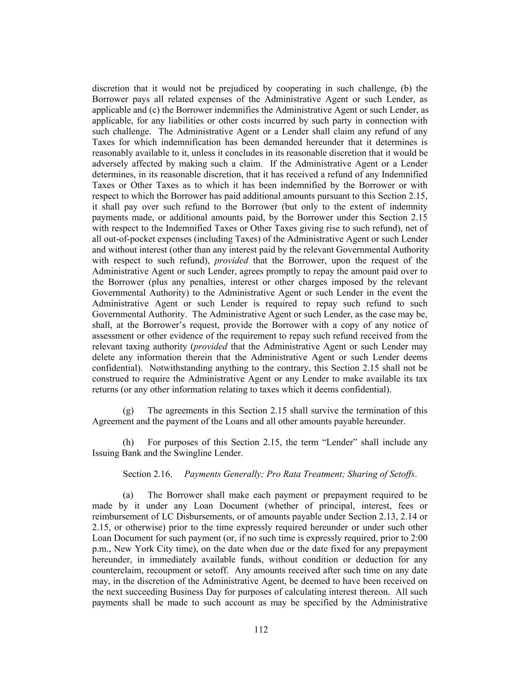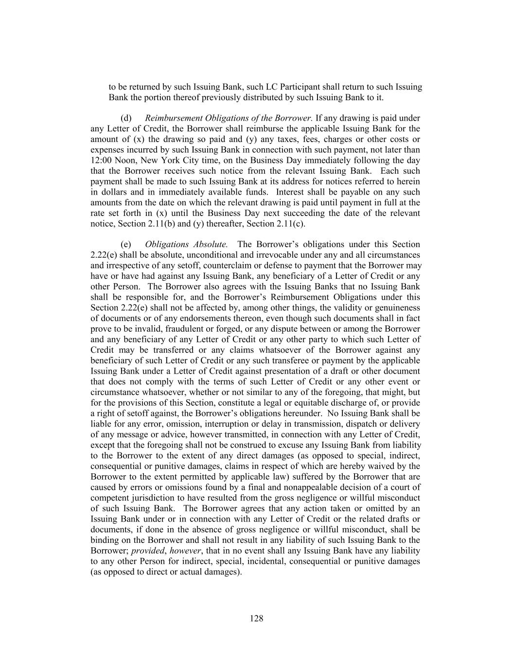 to be returned by such Issuing Bank, such LC Participant shall return to such Issuing Bank the portion thereof previously distributed by such Issuing Bank to it. (d) Reimbursement Obligations of the Borrower. If any drawing is paid under any Letter of Credit, the Borrower shall reimburse the applicable Issuing Bank for the amount of (x) the drawing so paid and (y) any taxes, fees, charges or other costs or expenses incurred by such Issuing Bank in connection with such payment, not later than 12:00 Noon, New York City time, on the Business Day immediately following the day that the Borrower receives such notice from the relevant Issuing Bank. Each such payment shall be made to such Issuing Bank at its address for notices referred to herein in dollars and in immediately available funds. Interest shall be payable on any such amounts from the date on which the relevant drawing is paid until payment in full at the rate set forth in (x) until the Business Day next succeeding the date of the relevant notice, Section 2.11(b) and (y) thereafter, Section 2.11(c). (e) Obligations Absolute. The Borrower’s obligations under this Section 2.22(e) shall be absolute, unconditional and irrevocable under any and all circumstances and irrespective of any setoff, counterclaim or defense to payment that the Borrower may have or have had against any Issuing Bank, any beneficiary of a Letter of Credit or any other Person. The Borrower also agrees with the Issuing Banks that no Issuing Bank shall be responsible for, and the Borrower’s Reimbursement Obligations under this Section 2.22(e) shall not be affected by, among other things, the validity or genuineness of documents or of any endorsements thereon, even though such documents shall in fact prove to be invalid, fraudulent or forged, or any dispute between or among the Borrower and any beneficiary of any Letter of Credit or any other party to which such Letter of Credit may be transferred or any claims whatsoever of the Borrower against any beneficiary of such Letter of Credit or any such transferee or payment by the applicable Issuing Bank under a Letter of Credit against presentation of a draft or other document that does not comply with the terms of such Letter of Credit or any other event or circumstance whatsoever, whether or not similar to any of the foregoing, that might, but for the provisions of this Section, constitute a legal or equitable discharge of, or provide a right of setoff against, the Borrower’s obligations hereunder. No Issuing Bank shall be liable for any error, omission, interruption or delay in transmission, dispatch or delivery of any message or advice, however transmitted, in connection with any Letter of Credit, except that the foregoing shall not be construed to excuse any Issuing Bank from liability to the Borrower to the extent of any direct damages (as opposed to special, indirect, consequential or punitive damages, claims in respect of which are hereby waived by the Borrower to the extent permitted by applicable law) suffered by the Borrower that are caused by errors or omissions found by a final and nonappealable decision of a court of competent jurisdiction to have resulted from the gross negligence or willful misconduct of such Issuing Bank. The Borrower agrees that any action taken or omitted by an Issuing Bank under or in connection with any Letter of Credit or the related drafts or documents, if done in the absence of gross negligence or willful misconduct, shall be binding on the Borrower and shall not result in any liability of such Issuing Bank to the Borrower; provided, however, that in no event shall any Issuing Bank have any liability to any other Person for indirect, special, incidental, consequential or punitive damages (as opposed to direct or actual damages). 128