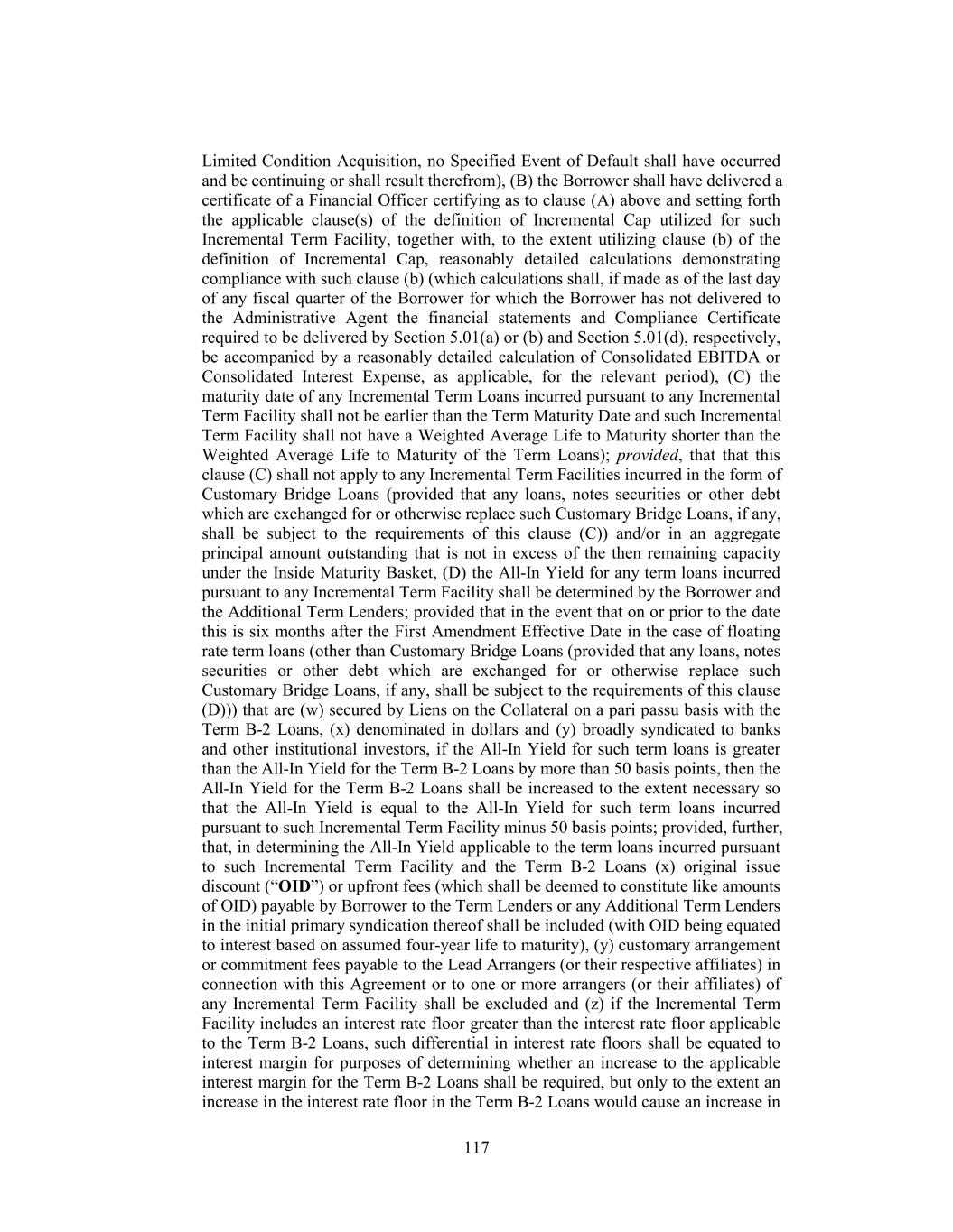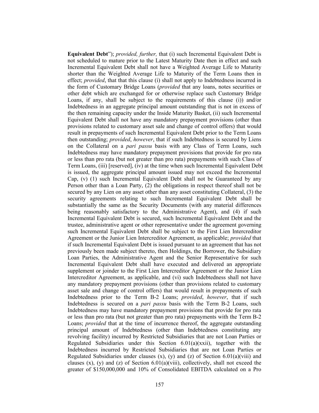 Equivalent Debt”); provided, further, that (i) such Incremental Equivalent Debt is not scheduled to mature prior to the Latest Maturity Date then in effect and such Incremental Equivalent Debt shall not have a Weighted Average Life to Maturity shorter than the Weighted Average Life to Maturity of the Term Loans then in effect; provided, that that this clause (i) shall not apply to Indebtedness incurred in the form of Customary Bridge Loans (provided that any loans, notes securities or other debt which are exchanged for or otherwise replace such Customary Bridge Loans, if any, shall be subject to the requirements of this clause (i)) and/or Indebtedness in an aggregate principal amount outstanding that is not in excess of the then remaining capacity under the Inside Maturity Basket, (ii) such Incremental Equivalent Debt shall not have any mandatory prepayment provisions (other than provisions related to customary asset sale and change of control offers) that would result in prepayments of such Incremental Equivalent Debt prior to the Term Loans then outstanding; provided, however, that if such Indebtedness is secured by Liens on the Collateral on a pari passu basis with any Class of Term Loans, such Indebtedness may have mandatory prepayment provisions that provide for pro rata or less than pro rata (but not greater than pro rata) prepayments with such Class of Term Loans, (iii) [reserved], (iv) at the time when such Incremental Equivalent Debt is issued, the aggregate principal amount issued may not exceed the Incremental Cap, (v) (1) such Incremental Equivalent Debt shall not be Guaranteed by any Person other than a Loan Party, (2) the obligations in respect thereof shall not be secured by any Lien on any asset other than any asset constituting Collateral, (3) the security agreements relating to such Incremental Equivalent Debt shall be substantially the same as the Security Documents (with any material differences being reasonably satisfactory to the Administrative Agent), and (4) if such Incremental Equivalent Debt is secured, such Incremental Equivalent Debt and the trustee, administrative agent or other representative under the agreement governing such Incremental Equivalent Debt shall be subject to the First Lien Intercreditor Agreement or the Junior Lien Intercreditor Agreement, as applicable; provided that if such Incremental Equivalent Debt is issued pursuant to an agreement that has not previously been made subject thereto, then Holdings, the Borrower, the Subsidiary Loan Parties, the Administrative Agent and the Senior Representative for such Incremental Equivalent Debt shall have executed and delivered an appropriate supplement or joinder to the First Lien Intercreditor Agreement or the Junior Lien Intercreditor Agreement, as applicable, and (vi) such Indebtedness shall not have any mandatory prepayment provisions (other than provisions related to customary asset sale and change of control offers) that would result in prepayments of such Indebtedness prior to the Term B-2 Loans; provided, however, that if such Indebtedness is secured on a pari passu basis with the Term B-2 Loans, such Indebtedness may have mandatory prepayment provisions that provide for pro rata or less than pro rata (but not greater than pro rata) prepayments with the Term B-2 Loans; provided that at the time of incurrence thereof, the aggregate outstanding principal amount of Indebtedness (other than Indebtedness constituting any revolving facility) incurred by Restricted Subsidiaries that are not Loan Parties or Regulated Subsidiaries under this Section 6.01(a)(xxii), together with the Indebtedness incurred by Restricted Subsidiaries that are not Loan Parties or Regulated Subsidiaries under clauses (x), (y) and (z) of Section 6.01(a)(viii) and clauses (x), (y) and (z) of Section 6.01(a)(viii), collectively, shall not exceed the greater of $150,000,000 and 10% of Consolidated EBITDA calculated on a Pro 157