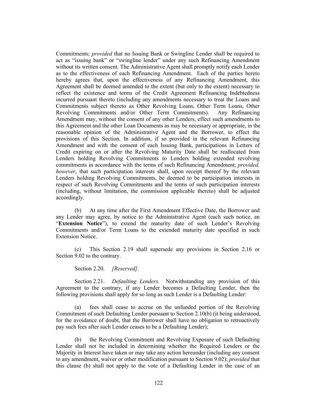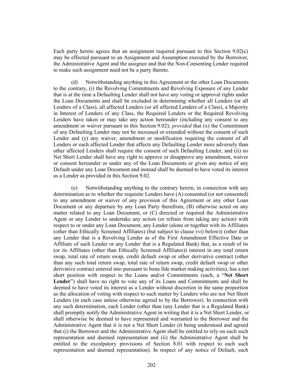 Each party hereto agrees that an assignment required pursuant to this Section 9.02(c) may be effected pursuant to an Assignment and Assumption executed by the Borrower, the Administrative Agent and the assignee and that the Non-Consenting Lender required to make such assignment need not be a party thereto. (d) Notwithstanding anything in this Agreement or the other Loan Documents to the contrary, (i) the Revolving Commitments and Revolving Exposure of any Lender that is at the time a Defaulting Lender shall not have any voting or approval rights under the Loan Documents and shall be excluded in determining whether all Lenders (or all Lenders of a Class), all affected Lenders (or all affected Lenders of a Class), a Majority in Interest of Lenders of any Class, the Required Lenders or the Required Revolving Lenders have taken or may take any action hereunder (including any consent to any amendment or waiver pursuant to this Section 9.02); provided that (x) the Commitment of any Defaulting Lender may not be increased or extended without the consent of such Lender and (y) any waiver, amendment or modification requiring the consent of all Lenders or each affected Lender that affects any Defaulting Lender more adversely than other affected Lenders shall require the consent of such Defaulting Lender, and (ii) no Net Short Lender shall have any right to approve or disapprove any amendment, waiver or consent hereunder or under any of the Loan Documents or given any notice of any Default under any Loan Document and instead shall be deemed to have voted its interest as a Lender as provided in this Section 9.02. (e) Notwithstanding anything to the contrary herein, in connection with any determination as to whether the requisite Lenders have (A) consented (or not consented) to any amendment or waiver of any provision of this Agreement or any other Loan Document or any departure by any Loan Party therefrom, (B) otherwise acted on any matter related to any Loan Document, or (C) directed or required the Administrative Agent or any Lender to undertake any action (or refrain from taking any action) with respect to or under any Loan Document, any Lender (alone or together with its Affiliates (other than Ethically Screened Affiliates) (but subject to clause (vi) below)) (other than any Lender that is a Revolving Lender as of the First Amendment Effective Date or Affiliate of such Lender or any Lender that is a Regulated Bank) that, as a result of its (or its Affiliates (other than Ethically Screened Affiliates)) interest in any total return swap, total rate of return swap, credit default swap or other derivative contract (other than any such total return swap, total rate of return swap, credit default swap or other derivative contract entered into pursuant to bona fide market making activities), has a net short position with respect to the Loans and/or Commitments (each, a “Net Short Lender”) shall have no right to vote any of its Loans and Commitments and shall be deemed to have voted its interest as a Lender without discretion in the same proportion as the allocation of voting with respect to such matter by Lenders who are not Net Short Lenders (in each case unless otherwise agreed to by the Borrower). In connection with any such determination, each Lender (other than (any Lender that is a Regulated Bank) shall promptly notify the Administrative Agent in writing that it is a Net Short Lender, or shall otherwise be deemed to have represented and warranted to the Borrower and the Administrative Agent that it is not a Net Short Lender (it being understood and agreed that (i) the Borrower and the Administrative Agent shall be entitled to rely on each such representation and deemed representation and (ii) the Administrative Agent shall be entitled to the exculpatory provisions of Section 8.01 with respect to each such representation and deemed representation). In respect of any notice of Default, such 202