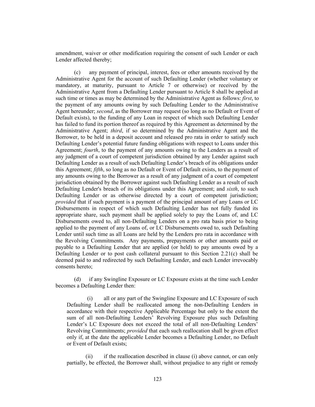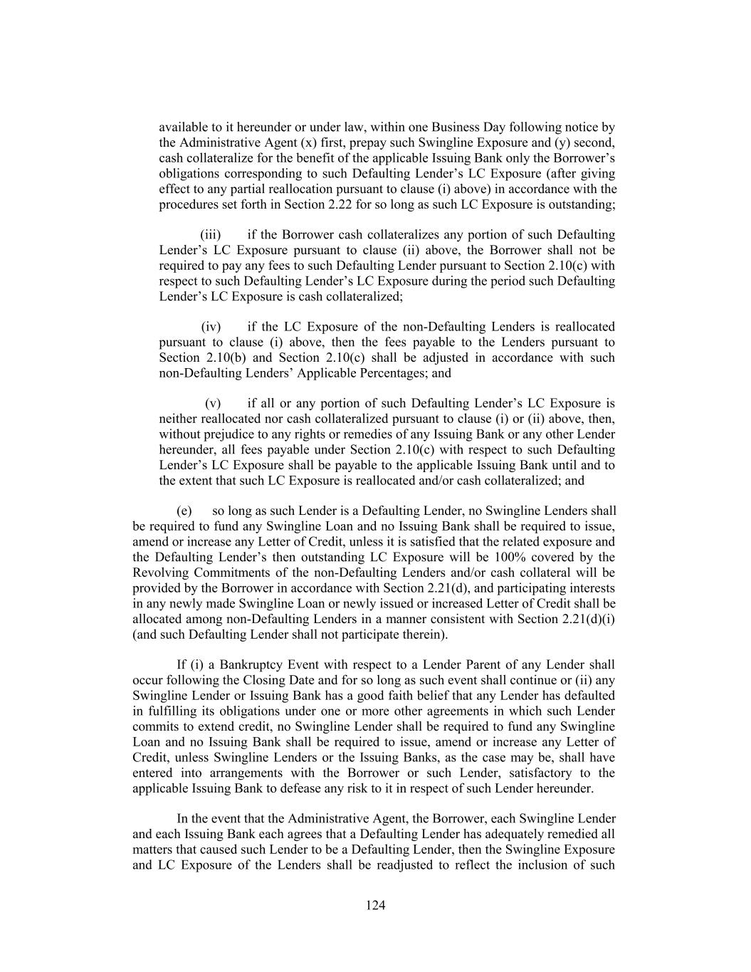 available to it hereunder or under law, within one Business Day following notice by the Administrative Agent (x) first, prepay such Swingline Exposure and (y) second, cash collateralize for the benefit of the applicable Issuing Bank only the Borrower’s obligations corresponding to such Defaulting Lender’s LC Exposure (after giving effect to any partial reallocation pursuant to clause (i) above) in accordance with the procedures set forth in Section 2.22 for so long as such LC Exposure is outstanding; (iii) if the Borrower cash collateralizes any portion of such Defaulting Lender’s LC Exposure pursuant to clause (ii) above, the Borrower shall not be required to pay any fees to such Defaulting Lender pursuant to Section 2.10(c) with respect to such Defaulting Lender’s LC Exposure during the period such Defaulting Lender’s LC Exposure is cash collateralized; (iv) if the LC Exposure of the non-Defaulting Lenders is reallocated pursuant to clause (i) above, then the fees payable to the Lenders pursuant to Section 2.10(b) and Section 2.10(c) shall be adjusted in accordance with such non-Defaulting Lenders’ Applicable Percentages; and (v) if all or any portion of such Defaulting Lender’s LC Exposure is neither reallocated nor cash collateralized pursuant to clause (i) or (ii) above, then, without prejudice to any rights or remedies of any Issuing Bank or any other Lender hereunder, all fees payable under Section 2.10(c) with respect to such Defaulting Lender’s LC Exposure shall be payable to the applicable Issuing Bank until and to the extent that such LC Exposure is reallocated and/or cash collateralized; and (e) so long as such Lender is a Defaulting Lender, no Swingline Lenders shall be required to fund any Swingline Loan and no Issuing Bank shall be required to issue, amend or increase any Letter of Credit, unless it is satisfied that the related exposure and the Defaulting Lender’s then outstanding LC Exposure will be 100% covered by the Revolving Commitments of the non-Defaulting Lenders and/or cash collateral will be provided by the Borrower in accordance with Section 2.21(d), and participating interests in any newly made Swingline Loan or newly issued or increased Letter of Credit shall be allocated among non-Defaulting Lenders in a manner consistent with Section 2.21(d)(i) (and such Defaulting Lender shall not participate therein). If (i) a Bankruptcy Event with respect to a Lender Parent of any Lender shall occur following the Closing Date and for so long as such event shall continue or (ii) any Swingline Lender or Issuing Bank has a good faith belief that any Lender has defaulted in fulfilling its obligations under one or more other agreements in which such Lender commits to extend credit, no Swingline Lender shall be required to fund any Swingline Loan and no Issuing Bank shall be required to issue, amend or increase any Letter of Credit, unless Swingline Lenders or the Issuing Banks, as the case may be, shall have entered into arrangements with the Borrower or such Lender, satisfactory to the applicable Issuing Bank to defease any risk to it in respect of such Lender hereunder. In the event that the Administrative Agent, the Borrower, each Swingline Lender and each Issuing Bank each agrees that a Defaulting Lender has adequately remedied all matters that caused such Lender to be a Defaulting Lender, then the Swingline Exposure and LC Exposure of the Lenders shall be readjusted to reflect the inclusion of such 124