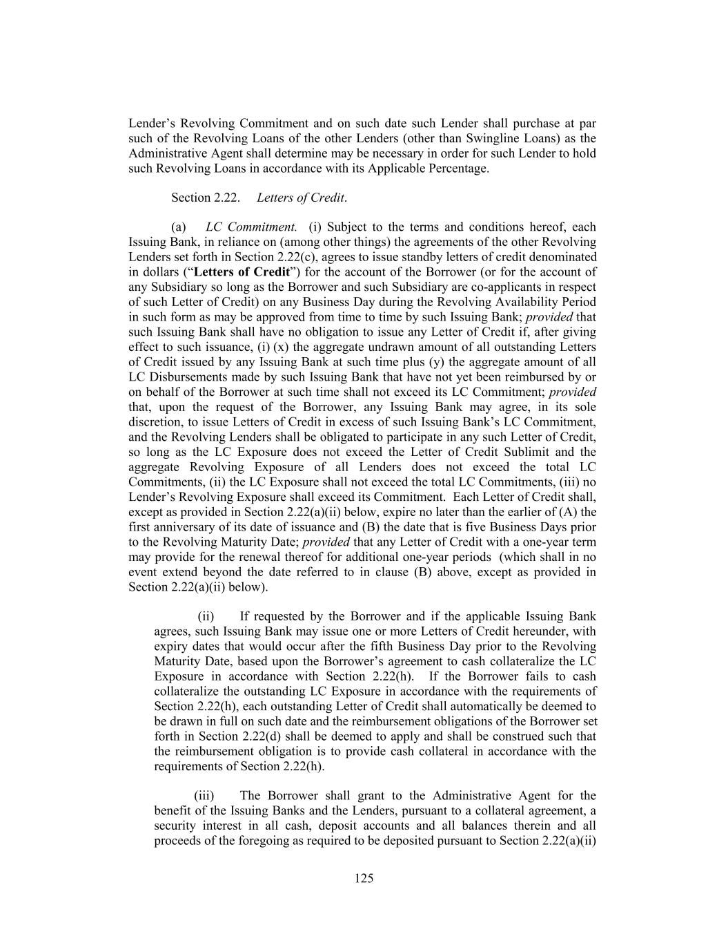 Lender’s Revolving Commitment and on such date such Lender shall purchase at par such of the Revolving Loans of the other Lenders (other than Swingline Loans) as the Administrative Agent shall determine may be necessary in order for such Lender to hold such Revolving Loans in accordance with its Applicable Percentage. Section 2.22. Letters of Credit. (a) LC Commitment. (i) Subject to the terms and conditions hereof, each Issuing Bank, in reliance on (among other things) the agreements of the other Revolving Lenders set forth in Section 2.22(c), agrees to issue standby letters of credit denominated in dollars (“Letters of Credit”) for the account of the Borrower (or for the account of any Subsidiary so long as the Borrower and such Subsidiary are co-applicants in respect of such Letter of Credit) on any Business Day during the Revolving Availability Period in such form as may be approved from time to time by such Issuing Bank; provided that such Issuing Bank shall have no obligation to issue any Letter of Credit if, after giving effect to such issuance, (i) (x) the aggregate undrawn amount of all outstanding Letters of Credit issued by any Issuing Bank at such time plus (y) the aggregate amount of all LC Disbursements made by such Issuing Bank that have not yet been reimbursed by or on behalf of the Borrower at such time shall not exceed its LC Commitment; provided that, upon the request of the Borrower, any Issuing Bank may agree, in its sole discretion, to issue Letters of Credit in excess of such Issuing Bank’s LC Commitment, and the Revolving Lenders shall be obligated to participate in any such Letter of Credit, so long as the LC Exposure does not exceed the Letter of Credit Sublimit and the aggregate Revolving Exposure of all Lenders does not exceed the total LC Commitments, (ii) the LC Exposure shall not exceed the total LC Commitments, (iii) no Lender’s Revolving Exposure shall exceed its Commitment. Each Letter of Credit shall, except as provided in Section 2.22(a)(ii) below, expire no later than the earlier of (A) the first anniversary of its date of issuance and (B) the date that is five Business Days prior to the Revolving Maturity Date; provided that any Letter of Credit with a one-year term may provide for the renewal thereof for additional one-year periods (which shall in no event extend beyond the date referred to in clause (B) above, except as provided in Section 2.22(a)(ii) below). (ii) If requested by the Borrower and if the applicable Issuing Bank agrees, such Issuing Bank may issue one or more Letters of Credit hereunder, with expiry dates that would occur after the fifth Business Day prior to the Revolving Maturity Date, based upon the Borrower’s agreement to cash collateralize the LC Exposure in accordance with Section 2.22(h). If the Borrower fails to cash collateralize the outstanding LC Exposure in accordance with the requirements of Section 2.22(h), each outstanding Letter of Credit shall automatically be deemed to be drawn in full on such date and the reimbursement obligations of the Borrower set forth in Section 2.22(d) shall be deemed to apply and shall be construed such that the reimbursement obligation is to provide cash collateral in accordance with the requirements of Section 2.22(h). (iii) The Borrower shall grant to the Administrative Agent for the benefit of the Issuing Banks and the Lenders, pursuant to a collateral agreement, a security interest in all cash, deposit accounts and all balances therein and all proceeds of the foregoing as required to be deposited pursuant to Section 2.22(a)(ii) 125
