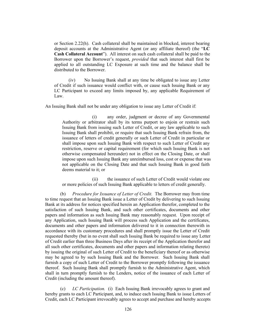 or Section 2.22(h). Cash collateral shall be maintained in blocked, interest bearing deposit accounts at the Administrative Agent (or any affiliate thereof) (the “LC Cash Collateral Account”). All interest on such cash collateral shall be paid to the Borrower upon the Borrower’s request, provided that such interest shall first be applied to all outstanding LC Exposure at such time and the balance shall be distributed to the Borrower. (iv) No Issuing Bank shall at any time be obligated to issue any Letter of Credit if such issuance would conflict with, or cause such Issuing Bank or any LC Participant to exceed any limits imposed by, any applicable Requirement of Law. An Issuing Bank shall not be under any obligation to issue any Letter of Credit if: (i) any order, judgment or decree of any Governmental Authority or arbitrator shall by its terms purport to enjoin or restrain such Issuing Bank from issuing such Letter of Credit, or any law applicable to such Issuing Bank shall prohibit, or require that such Issuing Bank refrain from, the issuance of letters of credit generally or such Letter of Credit in particular or shall impose upon such Issuing Bank with respect to such Letter of Credit any restriction, reserve or capital requirement (for which such Issuing Bank is not otherwise compensated hereunder) not in effect on the Closing Date, or shall impose upon such Issuing Bank any unreimbursed loss, cost or expense that was not applicable on the Closing Date and that such Issuing Bank in good faith deems material to it; or (ii) the issuance of such Letter of Credit would violate one or more policies of such Issuing Bank applicable to letters of credit generally. (b) Procedure for Issuance of Letter of Credit. The Borrower may from time to time request that an Issuing Bank issue a Letter of Credit by delivering to such Issuing Bank at its address for notices specified herein an Application therefor, completed to the satisfaction of such Issuing Bank, and such other certificates, documents and other papers and information as such Issuing Bank may reasonably request. Upon receipt of any Application, such Issuing Bank will process such Application and the certificates, documents and other papers and information delivered to it in connection therewith in accordance with its customary procedures and shall promptly issue the Letter of Credit requested thereby (but in no event shall such Issuing Bank be required to issue any Letter of Credit earlier than three Business Days after its receipt of the Application therefor and all such other certificates, documents and other papers and information relating thereto) by issuing the original of such Letter of Credit to the beneficiary thereof or as otherwise may be agreed to by such Issuing Bank and the Borrower. Such Issuing Bank shall furnish a copy of such Letter of Credit to the Borrower promptly following the issuance thereof. Such Issuing Bank shall promptly furnish to the Administrative Agent, which shall in turn promptly furnish to the Lenders, notice of the issuance of each Letter of Credit (including the amount thereof). (c) LC Participation. (i) Each Issuing Bank irrevocably agrees to grant and hereby grants to each LC Participant, and, to induce each Issuing Bank to issue Letters of Credit, each LC Participant irrevocably agrees to accept and purchase and hereby accepts 126
