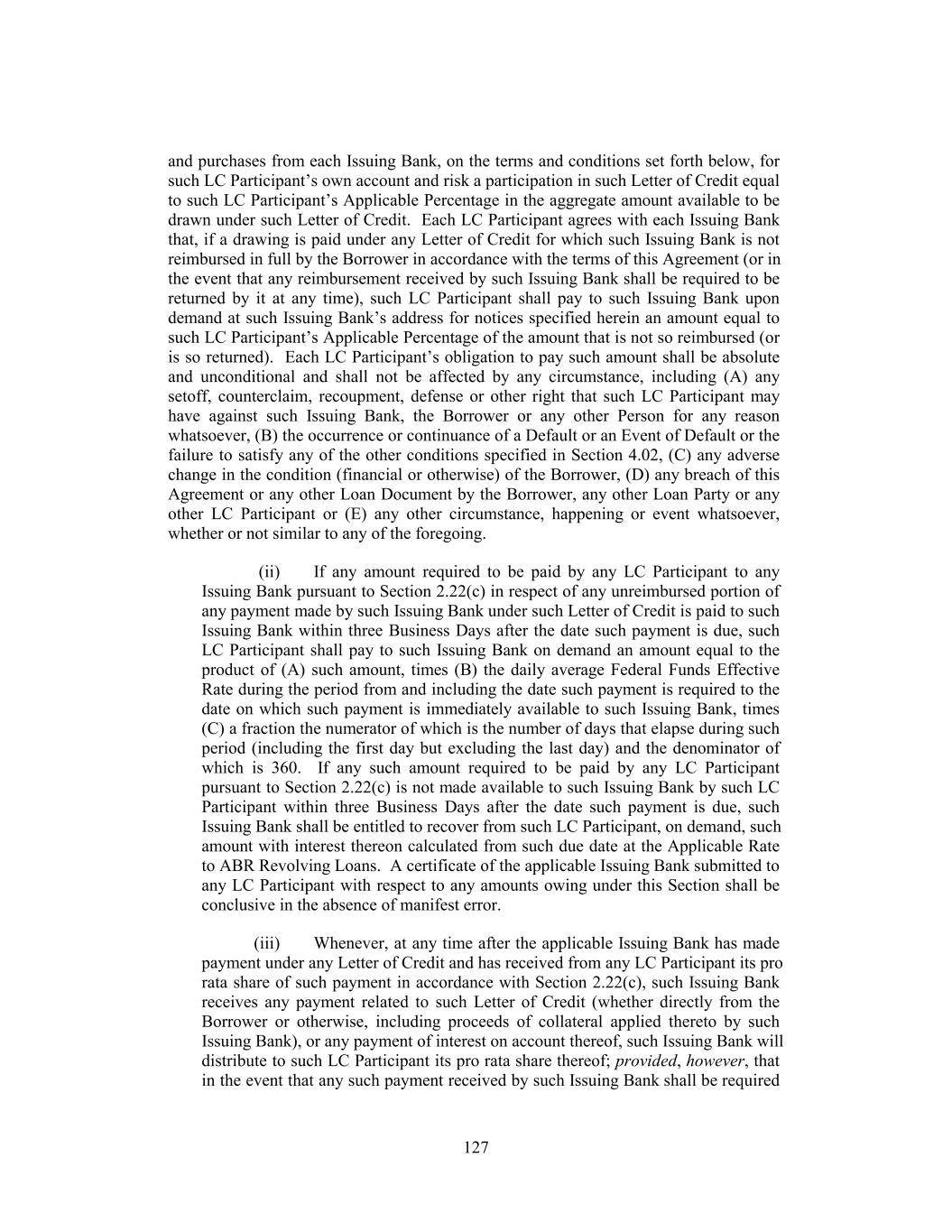 and purchases from each Issuing Bank, on the terms and conditions set forth below, for such LC Participant’s own account and risk a participation in such Letter of Credit equal to such LC Participant’s Applicable Percentage in the aggregate amount available to be drawn under such Letter of Credit. Each LC Participant agrees with each Issuing Bank that, if a drawing is paid under any Letter of Credit for which such Issuing Bank is not reimbursed in full by the Borrower in accordance with the terms of this Agreement (or in the event that any reimbursement received by such Issuing Bank shall be required to be returned by it at any time), such LC Participant shall pay to such Issuing Bank upon demand at such Issuing Bank’s address for notices specified herein an amount equal to such LC Participant’s Applicable Percentage of the amount that is not so reimbursed (or is so returned). Each LC Participant’s obligation to pay such amount shall be absolute and unconditional and shall not be affected by any circumstance, including (A) any setoff, counterclaim, recoupment, defense or other right that such LC Participant may have against such Issuing Bank, the Borrower or any other Person for any reason whatsoever, (B) the occurrence or continuance of a Default or an Event of Default or the failure to satisfy any of the other conditions specified in Section 4.02, (C) any adverse change in the condition (financial or otherwise) of the Borrower, (D) any breach of this Agreement or any other Loan Document by the Borrower, any other Loan Party or any other LC Participant or (E) any other circumstance, happening or event whatsoever, whether or not similar to any of the foregoing. (ii) If any amount required to be paid by any LC Participant to any Issuing Bank pursuant to Section 2.22(c) in respect of any unreimbursed portion of any payment made by such Issuing Bank under such Letter of Credit is paid to such Issuing Bank within three Business Days after the date such payment is due, such LC Participant shall pay to such Issuing Bank on demand an amount equal to the product of (A) such amount, times (B) the daily average Federal Funds Effective Rate during the period from and including the date such payment is required to the date on which such payment is immediately available to such Issuing Bank, times (C) a fraction the numerator of which is the number of days that elapse during such period (including the first day but excluding the last day) and the denominator of which is 360. If any such amount required to be paid by any LC Participant pursuant to Section 2.22(c) is not made available to such Issuing Bank by such LC Participant within three Business Days after the date such payment is due, such Issuing Bank shall be entitled to recover from such LC Participant, on demand, such amount with interest thereon calculated from such due date at the Applicable Rate to ABR Revolving Loans. A certificate of the applicable Issuing Bank submitted to any LC Participant with respect to any amounts owing under this Section shall be conclusive in the absence of manifest error. (iii) Whenever, at any time after the applicable Issuing Bank has made payment under any Letter of Credit and has received from any LC Participant its pro rata share of such payment in accordance with Section 2.22(c), such Issuing Bank receives any payment related to such Letter of Credit (whether directly from the Borrower or otherwise, including proceeds of collateral applied thereto by such Issuing Bank), or any payment of interest on account thereof, such Issuing Bank will distribute to such LC Participant its pro rata share thereof; provided, however, that in the event that any such payment received by such Issuing Bank shall be required 127