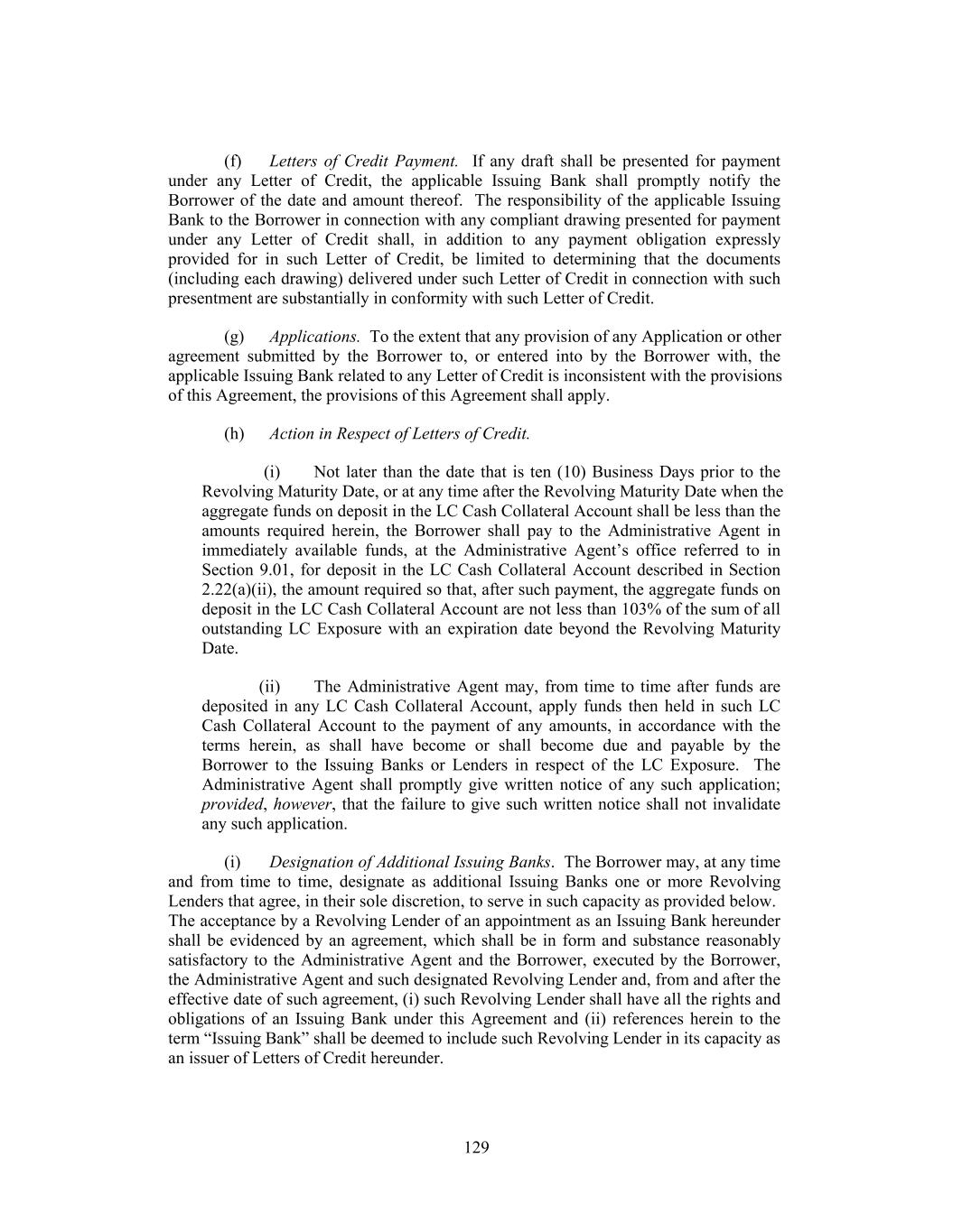 (f) Letters of Credit Payment. If any draft shall be presented for payment under any Letter of Credit, the applicable Issuing Bank shall promptly notify the Borrower of the date and amount thereof. The responsibility of the applicable Issuing Bank to the Borrower in connection with any compliant drawing presented for payment under any Letter of Credit shall, in addition to any payment obligation expressly provided for in such Letter of Credit, be limited to determining that the documents (including each drawing) delivered under such Letter of Credit in connection with such presentment are substantially in conformity with such Letter of Credit. (g) Applications. To the extent that any provision of any Application or other agreement submitted by the Borrower to, or entered into by the Borrower with, the applicable Issuing Bank related to any Letter of Credit is inconsistent with the provisions of this Agreement, the provisions of this Agreement shall apply. (h) Action in Respect of Letters of Credit. (i) Not later than the date that is ten (10) Business Days prior to the Revolving Maturity Date, or at any time after the Revolving Maturity Date when the aggregate funds on deposit in the LC Cash Collateral Account shall be less than the amounts required herein, the Borrower shall pay to the Administrative Agent in immediately available funds, at the Administrative Agent’s office referred to in Section 9.01, for deposit in the LC Cash Collateral Account described in Section 2.22(a)(ii), the amount required so that, after such payment, the aggregate funds on deposit in the LC Cash Collateral Account are not less than 103% of the sum of all outstanding LC Exposure with an expiration date beyond the Revolving Maturity Date. (ii) The Administrative Agent may, from time to time after funds are deposited in any LC Cash Collateral Account, apply funds then held in such LC Cash Collateral Account to the payment of any amounts, in accordance with the terms herein, as shall have become or shall become due and payable by the Borrower to the Issuing Banks or Lenders in respect of the LC Exposure. The Administrative Agent shall promptly give written notice of any such application; provided, however, that the failure to give such written notice shall not invalidate any such application. (i) Designation of Additional Issuing Banks. The Borrower may, at any time and from time to time, designate as additional Issuing Banks one or more Revolving Lenders that agree, in their sole discretion, to serve in such capacity as provided below. The acceptance by a Revolving Lender of an appointment as an Issuing Bank hereunder shall be evidenced by an agreement, which shall be in form and substance reasonably satisfactory to the Administrative Agent and the Borrower, executed by the Borrower, the Administrative Agent and such designated Revolving Lender and, from and after the effective date of such agreement, (i) such Revolving Lender shall have all the rights and obligations of an Issuing Bank under this Agreement and (ii) references herein to the term “Issuing Bank” shall be deemed to include such Revolving Lender in its capacity as an issuer of Letters of Credit hereunder. 129