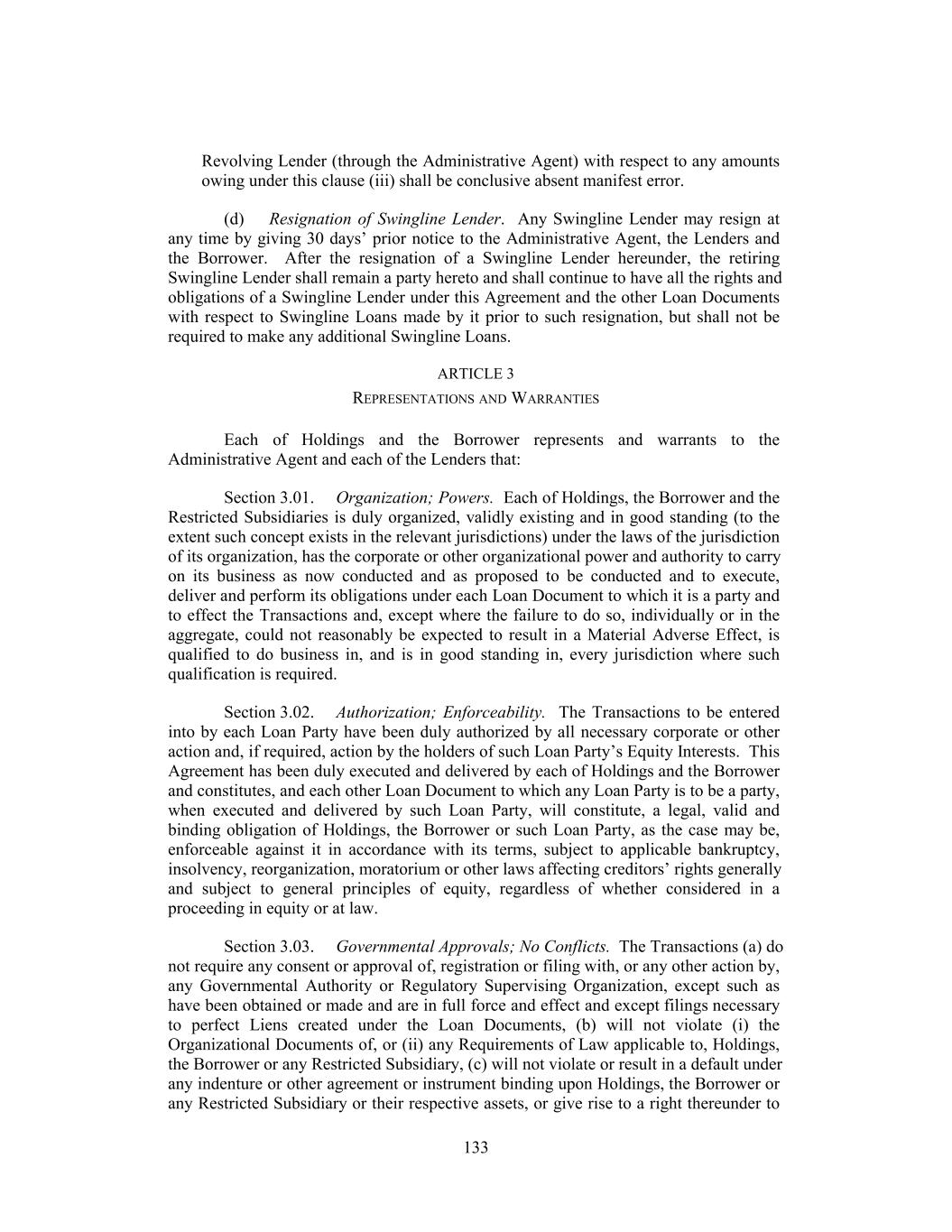 Revolving Lender (through the Administrative Agent) with respect to any amounts owing under this clause (iii) shall be conclusive absent manifest error. (d) Resignation of Swingline Lender. Any Swingline Lender may resign at any time by giving 30 days’ prior notice to the Administrative Agent, the Lenders and the Borrower. After the resignation of a Swingline Lender hereunder, the retiring Swingline Lender shall remain a party hereto and shall continue to have all the rights and obligations of a Swingline Lender under this Agreement and the other Loan Documents with respect to Swingline Loans made by it prior to such resignation, but shall not be required to make any additional Swingline Loans. ARTICLE 3 REPRESENTATIONS AND WARRANTIES Each of Holdings and the Borrower represents and warrants to the Administrative Agent and each of the Lenders that: Section 3.01. Organization; Powers. Each of Holdings, the Borrower and the Restricted Subsidiaries is duly organized, validly existing and in good standing (to the extent such concept exists in the relevant jurisdictions) under the laws of the jurisdiction of its organization, has the corporate or other organizational power and authority to carry on its business as now conducted and as proposed to be conducted and to execute, deliver and perform its obligations under each Loan Document to which it is a party and to effect the Transactions and, except where the failure to do so, individually or in the aggregate, could not reasonably be expected to result in a Material Adverse Effect, is qualified to do business in, and is in good standing in, every jurisdiction where such qualification is required. Section 3.02. Authorization; Enforceability. The Transactions to be entered into by each Loan Party have been duly authorized by all necessary corporate or other action and, if required, action by the holders of such Loan Party’s Equity Interests. This Agreement has been duly executed and delivered by each of Holdings and the Borrower and constitutes, and each other Loan Document to which any Loan Party is to be a party, when executed and delivered by such Loan Party, will constitute, a legal, valid and binding obligation of Holdings, the Borrower or such Loan Party, as the case may be, enforceable against it in accordance with its terms, subject to applicable bankruptcy, insolvency, reorganization, moratorium or other laws affecting creditors’ rights generally and subject to general principles of equity, regardless of whether considered in a proceeding in equity or at law. Section 3.03. Governmental Approvals; No Conflicts. The Transactions (a) do not require any consent or approval of, registration or filing with, or any other action by, any Governmental Authority or Regulatory Supervising Organization, except such as have been obtained or made and are in full force and effect and except filings necessary to perfect Liens created under the Loan Documents, (b) will not violate (i) the Organizational Documents of, or (ii) any Requirements of Law applicable to, Holdings, the Borrower or any Restricted Subsidiary, (c) will not violate or result in a default under any indenture or other agreement or instrument binding upon Holdings, the Borrower or any Restricted Subsidiary or their respective assets, or give rise to a right thereunder to 133