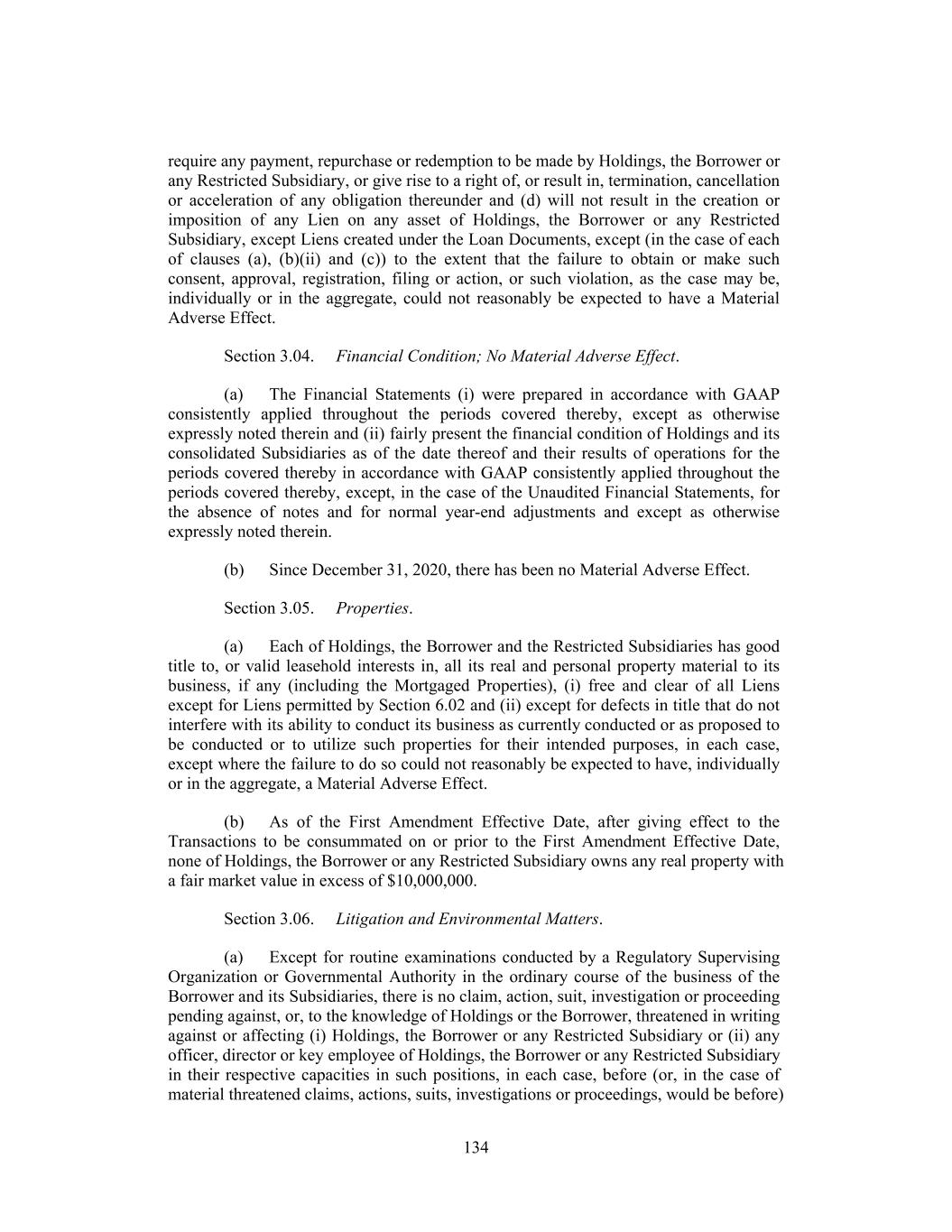 require any payment, repurchase or redemption to be made by Holdings, the Borrower or any Restricted Subsidiary, or give rise to a right of, or result in, termination, cancellation or acceleration of any obligation thereunder and (d) will not result in the creation or imposition of any Lien on any asset of Holdings, the Borrower or any Restricted Subsidiary, except Liens created under the Loan Documents, except (in the case of each of clauses (a), (b)(ii) and (c)) to the extent that the failure to obtain or make such consent, approval, registration, filing or action, or such violation, as the case may be, individually or in the aggregate, could not reasonably be expected to have a Material Adverse Effect. Section 3.04. Financial Condition; No Material Adverse Effect. (a) The Financial Statements (i) were prepared in accordance with GAAP consistently applied throughout the periods covered thereby, except as otherwise expressly noted therein and (ii) fairly present the financial condition of Holdings and its consolidated Subsidiaries as of the date thereof and their results of operations for the periods covered thereby in accordance with GAAP consistently applied throughout the periods covered thereby, except, in the case of the Unaudited Financial Statements, for the absence of notes and for normal year-end adjustments and except as otherwise expressly noted therein. (b) Since December 31, 2020, there has been no Material Adverse Effect. Section 3.05. Properties. (a) Each of Holdings, the Borrower and the Restricted Subsidiaries has good title to, or valid leasehold interests in, all its real and personal property material to its business, if any (including the Mortgaged Properties), (i) free and clear of all Liens except for Liens permitted by Section 6.02 and (ii) except for defects in title that do not interfere with its ability to conduct its business as currently conducted or as proposed to be conducted or to utilize such properties for their intended purposes, in each case, except where the failure to do so could not reasonably be expected to have, individually or in the aggregate, a Material Adverse Effect. (b) As of the First Amendment Effective Date, after giving effect to the Transactions to be consummated on or prior to the First Amendment Effective Date, none of Holdings, the Borrower or any Restricted Subsidiary owns any real property with a fair market value in excess of $10,000,000. Section 3.06. Litigation and Environmental Matters. (a) Except for routine examinations conducted by a Regulatory Supervising Organization or Governmental Authority in the ordinary course of the business of the Borrower and its Subsidiaries, there is no claim, action, suit, investigation or proceeding pending against, or, to the knowledge of Holdings or the Borrower, threatened in writing against or affecting (i) Holdings, the Borrower or any Restricted Subsidiary or (ii) any officer, director or key employee of Holdings, the Borrower or any Restricted Subsidiary in their respective capacities in such positions, in each case, before (or, in the case of material threatened claims, actions, suits, investigations or proceedings, would be before) 134