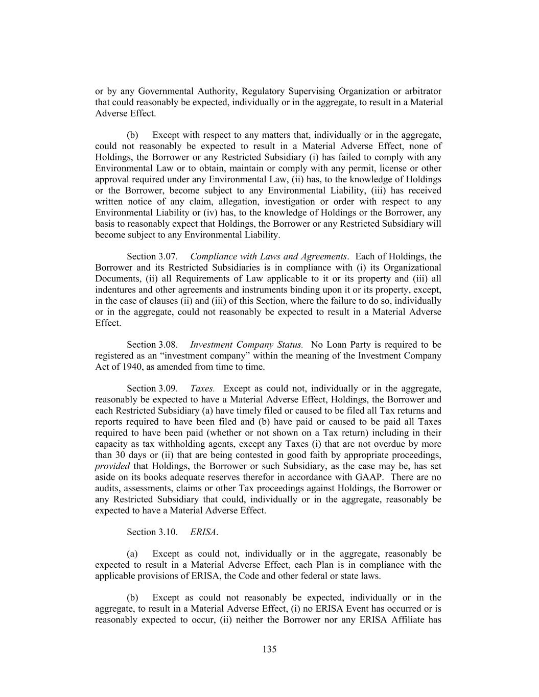 or by any Governmental Authority, Regulatory Supervising Organization or arbitrator that could reasonably be expected, individually or in the aggregate, to result in a Material Adverse Effect. (b) Except with respect to any matters that, individually or in the aggregate, could not reasonably be expected to result in a Material Adverse Effect, none of Holdings, the Borrower or any Restricted Subsidiary (i) has failed to comply with any Environmental Law or to obtain, maintain or comply with any permit, license or other approval required under any Environmental Law, (ii) has, to the knowledge of Holdings or the Borrower, become subject to any Environmental Liability, (iii) has received written notice of any claim, allegation, investigation or order with respect to any Environmental Liability or (iv) has, to the knowledge of Holdings or the Borrower, any basis to reasonably expect that Holdings, the Borrower or any Restricted Subsidiary will become subject to any Environmental Liability. Section 3.07. Compliance with Laws and Agreements. Each of Holdings, the Borrower and its Restricted Subsidiaries is in compliance with (i) its Organizational Documents, (ii) all Requirements of Law applicable to it or its property and (iii) all indentures and other agreements and instruments binding upon it or its property, except, in the case of clauses (ii) and (iii) of this Section, where the failure to do so, individually or in the aggregate, could not reasonably be expected to result in a Material Adverse Effect. Section 3.08. Investment Company Status. No Loan Party is required to be registered as an “investment company” within the meaning of the Investment Company Act of 1940, as amended from time to time. Section 3.09. Taxes. Except as could not, individually or in the aggregate, reasonably be expected to have a Material Adverse Effect, Holdings, the Borrower and each Restricted Subsidiary (a) have timely filed or caused to be filed all Tax returns and reports required to have been filed and (b) have paid or caused to be paid all Taxes required to have been paid (whether or not shown on a Tax return) including in their capacity as tax withholding agents, except any Taxes (i) that are not overdue by more than 30 days or (ii) that are being contested in good faith by appropriate proceedings, provided that Holdings, the Borrower or such Subsidiary, as the case may be, has set aside on its books adequate reserves therefor in accordance with GAAP. There are no audits, assessments, claims or other Tax proceedings against Holdings, the Borrower or any Restricted Subsidiary that could, individually or in the aggregate, reasonably be expected to have a Material Adverse Effect. Section 3.10. ERISA. (a) Except as could not, individually or in the aggregate, reasonably be expected to result in a Material Adverse Effect, each Plan is in compliance with the applicable provisions of ERISA, the Code and other federal or state laws. (b) Except as could not reasonably be expected, individually or in the aggregate, to result in a Material Adverse Effect, (i) no ERISA Event has occurred or is reasonably expected to occur, (ii) neither the Borrower nor any ERISA Affiliate has 135