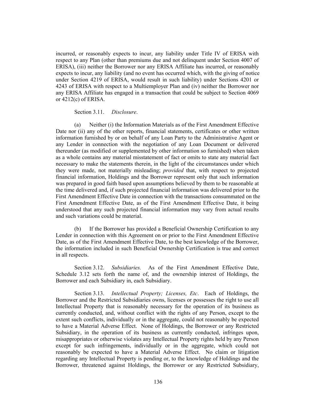 incurred, or reasonably expects to incur, any liability under Title IV of ERISA with respect to any Plan (other than premiums due and not delinquent under Section 4007 of ERISA), (iii) neither the Borrower nor any ERISA Affiliate has incurred, or reasonably expects to incur, any liability (and no event has occurred which, with the giving of notice under Section 4219 of ERISA, would result in such liability) under Sections 4201 or 4243 of ERISA with respect to a Multiemployer Plan and (iv) neither the Borrower nor any ERISA Affiliate has engaged in a transaction that could be subject to Section 4069 or 4212(c) of ERISA. Section 3.11. Disclosure. (a) Neither (i) the Information Materials as of the First Amendment Effective Date nor (ii) any of the other reports, financial statements, certificates or other written information furnished by or on behalf of any Loan Party to the Administrative Agent or any Lender in connection with the negotiation of any Loan Document or delivered thereunder (as modified or supplemented by other information so furnished) when taken as a whole contains any material misstatement of fact or omits to state any material fact necessary to make the statements therein, in the light of the circumstances under which they were made, not materially misleading; provided that, with respect to projected financial information, Holdings and the Borrower represent only that such information was prepared in good faith based upon assumptions believed by them to be reasonable at the time delivered and, if such projected financial information was delivered prior to the First Amendment Effective Date in connection with the transactions consummated on the First Amendment Effective Date, as of the First Amendment Effective Date, it being understood that any such projected financial information may vary from actual results and such variations could be material. (b) If the Borrower has provided a Beneficial Ownership Certification to any Lender in connection with this Agreement on or prior to the First Amendment Effective Date, as of the First Amendment Effective Date, to the best knowledge of the Borrower, the information included in such Beneficial Ownership Certification is true and correct in all respects. Section 3.12. Subsidiaries. As of the First Amendment Effective Date, Schedule 3.12 sets forth the name of, and the ownership interest of Holdings, the Borrower and each Subsidiary in, each Subsidiary. Section 3.13. Intellectual Property; Licenses, Etc. Each of Holdings, the Borrower and the Restricted Subsidiaries owns, licenses or possesses the right to use all Intellectual Property that is reasonably necessary for the operation of its business as currently conducted, and, without conflict with the rights of any Person, except to the extent such conflicts, individually or in the aggregate, could not reasonably be expected to have a Material Adverse Effect. None of Holdings, the Borrower or any Restricted Subsidiary, in the operation of its business as currently conducted, infringes upon, misappropriates or otherwise violates any Intellectual Property rights held by any Person except for such infringements, individually or in the aggregate, which could not reasonably be expected to have a Material Adverse Effect. No claim or litigation regarding any Intellectual Property is pending or, to the knowledge of Holdings and the Borrower, threatened against Holdings, the Borrower or any Restricted Subsidiary, 136