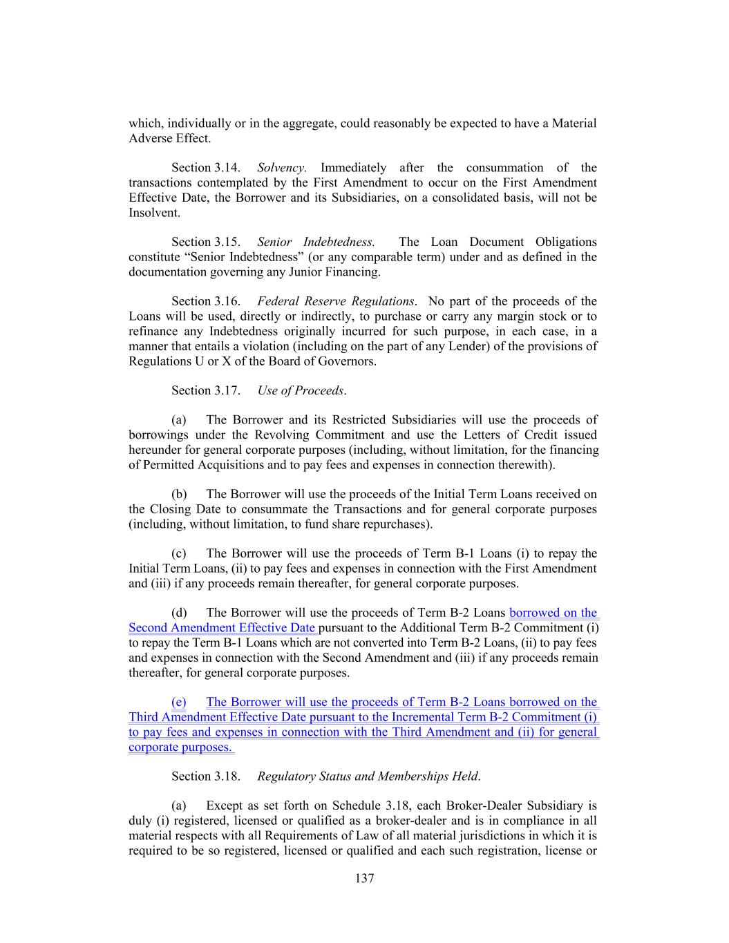 which, individually or in the aggregate, could reasonably be expected to have a Material Adverse Effect. Section 3.14. Solvency. Immediately after the consummation of the transactions contemplated by the First Amendment to occur on the First Amendment Effective Date, the Borrower and its Subsidiaries, on a consolidated basis, will not be Insolvent. Section 3.15. Senior Indebtedness. The Loan Document Obligations constitute “Senior Indebtedness” (or any comparable term) under and as defined in the documentation governing any Junior Financing. Section 3.16. Federal Reserve Regulations. No part of the proceeds of the Loans will be used, directly or indirectly, to purchase or carry any margin stock or to refinance any Indebtedness originally incurred for such purpose, in each case, in a manner that entails a violation (including on the part of any Lender) of the provisions of Regulations U or X of the Board of Governors. Section 3.17. Use of Proceeds. (a) The Borrower and its Restricted Subsidiaries will use the proceeds of borrowings under the Revolving Commitment and use the Letters of Credit issued hereunder for general corporate purposes (including, without limitation, for the financing of Permitted Acquisitions and to pay fees and expenses in connection therewith). (b) The Borrower will use the proceeds of the Initial Term Loans received on the Closing Date to consummate the Transactions and for general corporate purposes (including, without limitation, to fund share repurchases). (c) The Borrower will use the proceeds of Term B-1 Loans (i) to repay the Initial Term Loans, (ii) to pay fees and expenses in connection with the First Amendment and (iii) if any proceeds remain thereafter, for general corporate purposes. (d) The Borrower will use the proceeds of Term B-2 Loans borrowed on the Second Amendment Effective Date pursuant to the Additional Term B-2 Commitment (i) to repay the Term B-1 Loans which are not converted into Term B-2 Loans, (ii) to pay fees and expenses in connection with the Second Amendment and (iii) if any proceeds remain thereafter, for general corporate purposes. (e) The Borrower will use the proceeds of Term B-2 Loans borrowed on the Third Amendment Effective Date pursuant to the Incremental Term B-2 Commitment (i) to pay fees and expenses in connection with the Third Amendment and (ii) for general corporate purposes. Section 3.18. Regulatory Status and Memberships Held. (a) Except as set forth on Schedule 3.18, each Broker-Dealer Subsidiary is duly (i) registered, licensed or qualified as a broker-dealer and is in compliance in all material respects with all Requirements of Law of all material jurisdictions in which it is required to be so registered, licensed or qualified and each such registration, license or 137