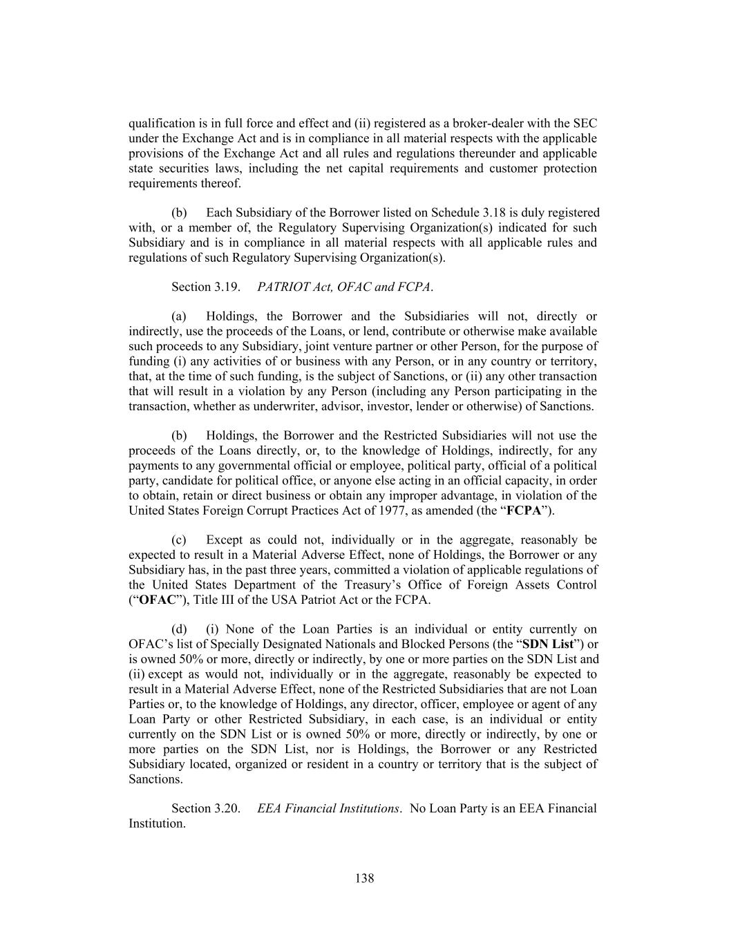 qualification is in full force and effect and (ii) registered as a broker-dealer with the SEC under the Exchange Act and is in compliance in all material respects with the applicable provisions of the Exchange Act and all rules and regulations thereunder and applicable state securities laws, including the net capital requirements and customer protection requirements thereof. (b) Each Subsidiary of the Borrower listed on Schedule 3.18 is duly registered with, or a member of, the Regulatory Supervising Organization(s) indicated for such Subsidiary and is in compliance in all material respects with all applicable rules and regulations of such Regulatory Supervising Organization(s). Section 3.19. PATRIOT Act, OFAC and FCPA. (a) Holdings, the Borrower and the Subsidiaries will not, directly or indirectly, use the proceeds of the Loans, or lend, contribute or otherwise make available such proceeds to any Subsidiary, joint venture partner or other Person, for the purpose of funding (i) any activities of or business with any Person, or in any country or territory, that, at the time of such funding, is the subject of Sanctions, or (ii) any other transaction that will result in a violation by any Person (including any Person participating in the transaction, whether as underwriter, advisor, investor, lender or otherwise) of Sanctions. (b) Holdings, the Borrower and the Restricted Subsidiaries will not use the proceeds of the Loans directly, or, to the knowledge of Holdings, indirectly, for any payments to any governmental official or employee, political party, official of a political party, candidate for political office, or anyone else acting in an official capacity, in order to obtain, retain or direct business or obtain any improper advantage, in violation of the United States Foreign Corrupt Practices Act of 1977, as amended (the “FCPA”). (c) Except as could not, individually or in the aggregate, reasonably be expected to result in a Material Adverse Effect, none of Holdings, the Borrower or any Subsidiary has, in the past three years, committed a violation of applicable regulations of the United States Department of the Treasury’s Office of Foreign Assets Control (“OFAC”), Title III of the USA Patriot Act or the FCPA. (d) (i) None of the Loan Parties is an individual or entity currently on OFAC’s list of Specially Designated Nationals and Blocked Persons (the “SDN List”) or is owned 50% or more, directly or indirectly, by one or more parties on the SDN List and (ii) except as would not, individually or in the aggregate, reasonably be expected to result in a Material Adverse Effect, none of the Restricted Subsidiaries that are not Loan Parties or, to the knowledge of Holdings, any director, officer, employee or agent of any Loan Party or other Restricted Subsidiary, in each case, is an individual or entity currently on the SDN List or is owned 50% or more, directly or indirectly, by one or more parties on the SDN List, nor is Holdings, the Borrower or any Restricted Subsidiary located, organized or resident in a country or territory that is the subject of Sanctions. Section 3.20. EEA Financial Institutions. No Loan Party is an EEA Financial Institution. 138