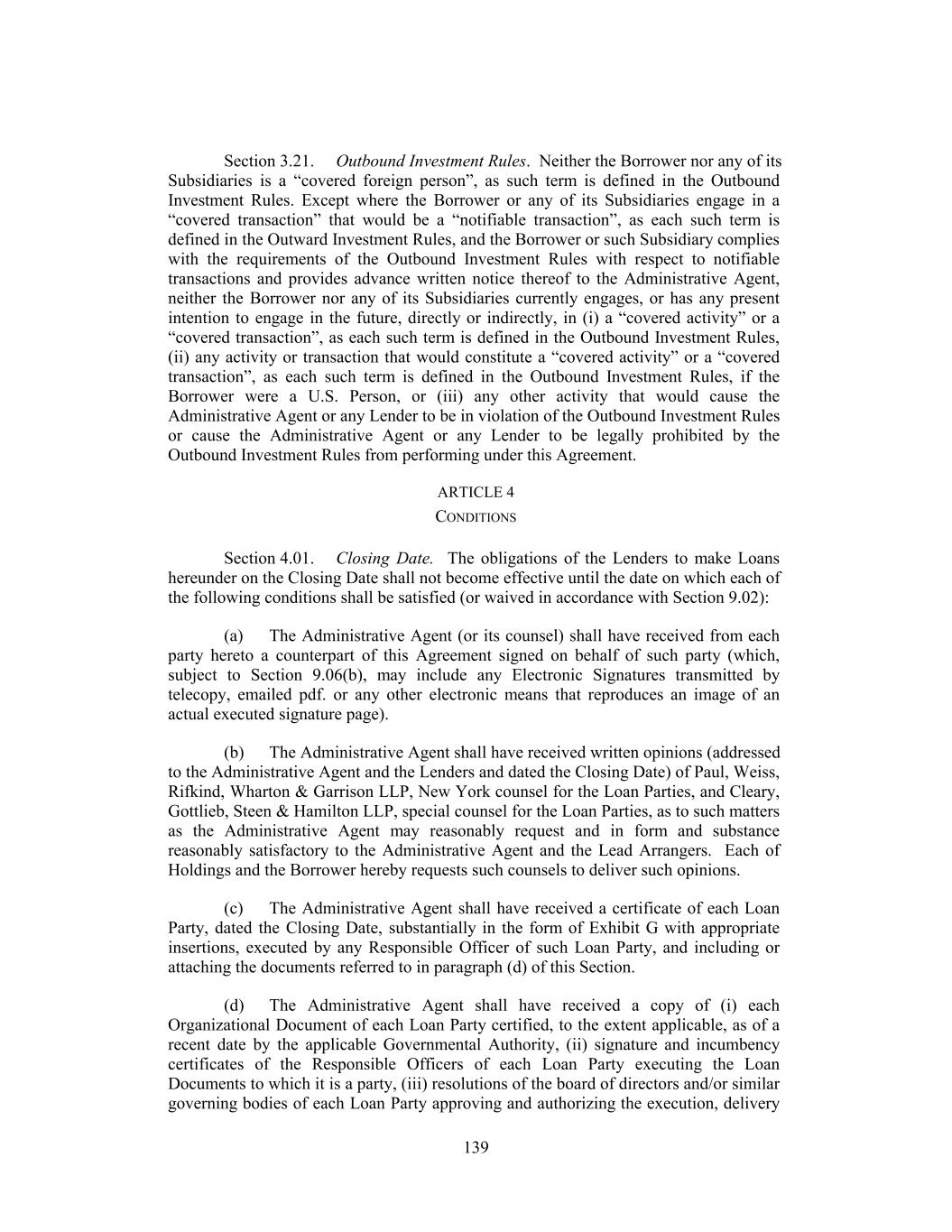 Section 3.21. Outbound Investment Rules. Neither the Borrower nor any of its Subsidiaries is a “covered foreign person”, as such term is defined in the Outbound Investment Rules. Except where the Borrower or any of its Subsidiaries engage in a “covered transaction” that would be a “notifiable transaction”, as each such term is defined in the Outward Investment Rules, and the Borrower or such Subsidiary complies with the requirements of the Outbound Investment Rules with respect to notifiable transactions and provides advance written notice thereof to the Administrative Agent, neither the Borrower nor any of its Subsidiaries currently engages, or has any present intention to engage in the future, directly or indirectly, in (i) a “covered activity” or a “covered transaction”, as each such term is defined in the Outbound Investment Rules, (ii) any activity or transaction that would constitute a “covered activity” or a “covered transaction”, as each such term is defined in the Outbound Investment Rules, if the Borrower were a U.S. Person, or (iii) any other activity that would cause the Administrative Agent or any Lender to be in violation of the Outbound Investment Rules or cause the Administrative Agent or any Lender to be legally prohibited by the Outbound Investment Rules from performing under this Agreement. ARTICLE 4 CONDITIONS Section 4.01. Closing Date. The obligations of the Lenders to make Loans hereunder on the Closing Date shall not become effective until the date on which each of the following conditions shall be satisfied (or waived in accordance with Section 9.02): (a) The Administrative Agent (or its counsel) shall have received from each party hereto a counterpart of this Agreement signed on behalf of such party (which, subject to Section 9.06(b), may include any Electronic Signatures transmitted by telecopy, emailed pdf. or any other electronic means that reproduces an image of an actual executed signature page). (b) The Administrative Agent shall have received written opinions (addressed to the Administrative Agent and the Lenders and dated the Closing Date) of Paul, Weiss, Rifkind, Wharton & Garrison LLP, New York counsel for the Loan Parties, and Cleary, Gottlieb, Steen & Hamilton LLP, special counsel for the Loan Parties, as to such matters as the Administrative Agent may reasonably request and in form and substance reasonably satisfactory to the Administrative Agent and the Lead Arrangers. Each of Holdings and the Borrower hereby requests such counsels to deliver such opinions. (c) The Administrative Agent shall have received a certificate of each Loan Party, dated the Closing Date, substantially in the form of Exhibit G with appropriate insertions, executed by any Responsible Officer of such Loan Party, and including or attaching the documents referred to in paragraph (d) of this Section. (d) The Administrative Agent shall have received a copy of (i) each Organizational Document of each Loan Party certified, to the extent applicable, as of a recent date by the applicable Governmental Authority, (ii) signature and incumbency certificates of the Responsible Officers of each Loan Party executing the Loan Documents to which it is a party, (iii) resolutions of the board of directors and/or similar governing bodies of each Loan Party approving and authorizing the execution, delivery 139