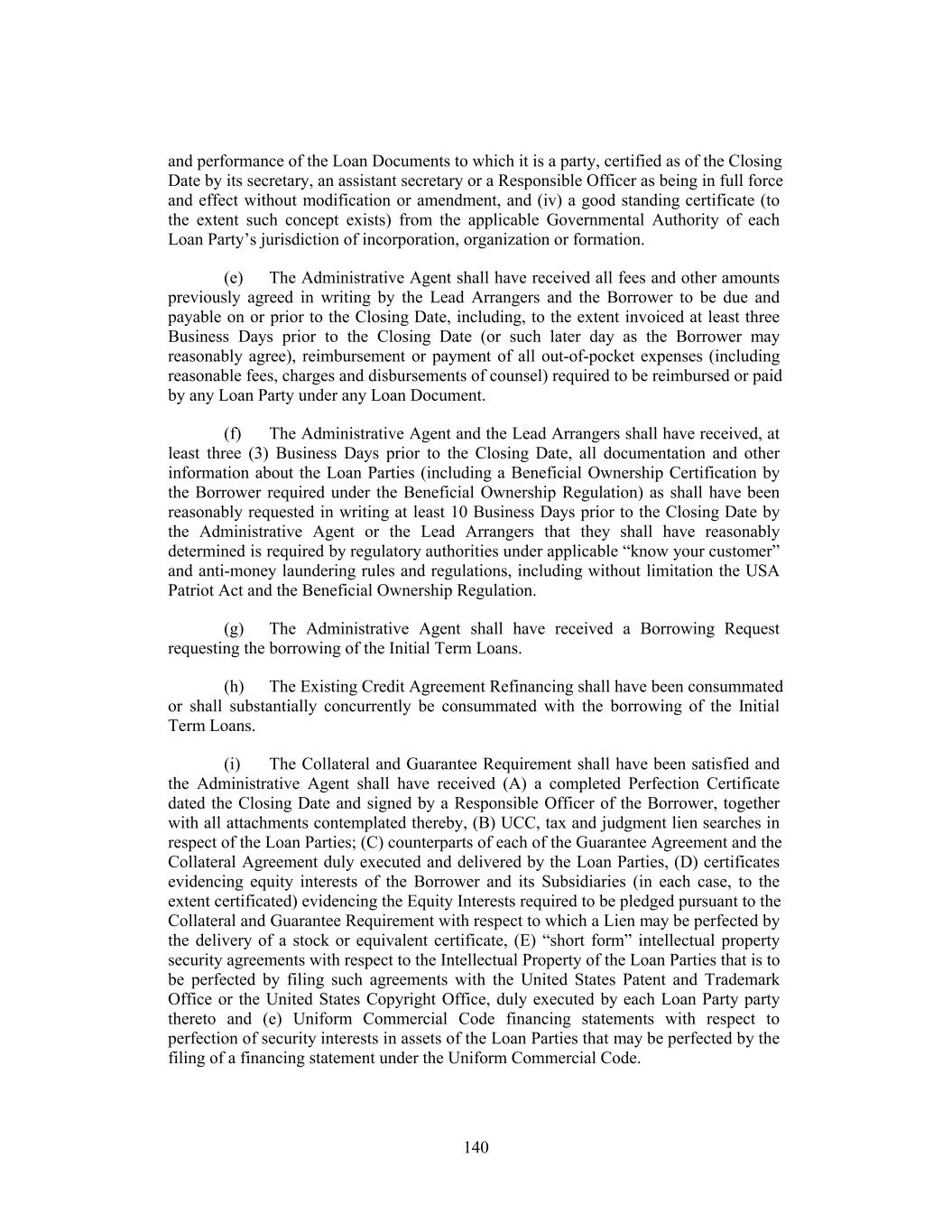 and performance of the Loan Documents to which it is a party, certified as of the Closing Date by its secretary, an assistant secretary or a Responsible Officer as being in full force and effect without modification or amendment, and (iv) a good standing certificate (to the extent such concept exists) from the applicable Governmental Authority of each Loan Party’s jurisdiction of incorporation, organization or formation. (e) The Administrative Agent shall have received all fees and other amounts previously agreed in writing by the Lead Arrangers and the Borrower to be due and payable on or prior to the Closing Date, including, to the extent invoiced at least three Business Days prior to the Closing Date (or such later day as the Borrower may reasonably agree), reimbursement or payment of all out-of-pocket expenses (including reasonable fees, charges and disbursements of counsel) required to be reimbursed or paid by any Loan Party under any Loan Document. (f) The Administrative Agent and the Lead Arrangers shall have received, at least three (3) Business Days prior to the Closing Date, all documentation and other information about the Loan Parties (including a Beneficial Ownership Certification by the Borrower required under the Beneficial Ownership Regulation) as shall have been reasonably requested in writing at least 10 Business Days prior to the Closing Date by the Administrative Agent or the Lead Arrangers that they shall have reasonably determined is required by regulatory authorities under applicable “know your customer” and anti-money laundering rules and regulations, including without limitation the USA Patriot Act and the Beneficial Ownership Regulation. (g) The Administrative Agent shall have received a Borrowing Request requesting the borrowing of the Initial Term Loans. (h) The Existing Credit Agreement Refinancing shall have been consummated or shall substantially concurrently be consummated with the borrowing of the Initial Term Loans. (i) The Collateral and Guarantee Requirement shall have been satisfied and the Administrative Agent shall have received (A) a completed Perfection Certificate dated the Closing Date and signed by a Responsible Officer of the Borrower, together with all attachments contemplated thereby, (B) UCC, tax and judgment lien searches in respect of the Loan Parties; (C) counterparts of each of the Guarantee Agreement and the Collateral Agreement duly executed and delivered by the Loan Parties, (D) certificates evidencing equity interests of the Borrower and its Subsidiaries (in each case, to the extent certificated) evidencing the Equity Interests required to be pledged pursuant to the Collateral and Guarantee Requirement with respect to which a Lien may be perfected by the delivery of a stock or equivalent certificate, (E) “short form” intellectual property security agreements with respect to the Intellectual Property of the Loan Parties that is to be perfected by filing such agreements with the United States Patent and Trademark Office or the United States Copyright Office, duly executed by each Loan Party party thereto and (e) Uniform Commercial Code financing statements with respect to perfection of security interests in assets of the Loan Parties that may be perfected by the filing of a financing statement under the Uniform Commercial Code. 140