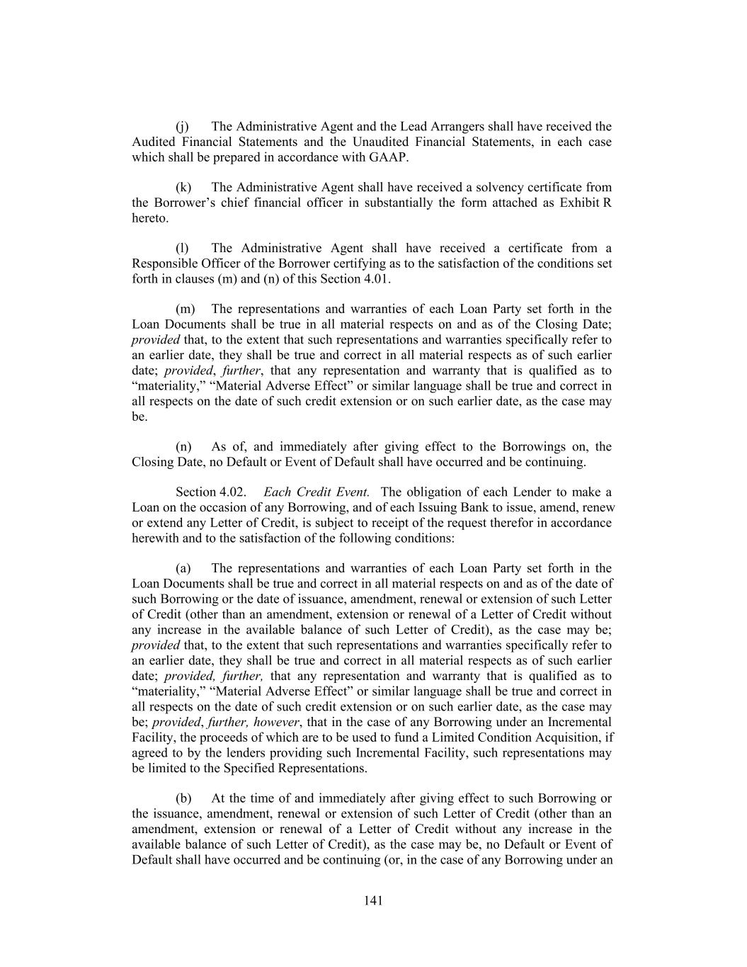 (j) The Administrative Agent and the Lead Arrangers shall have received the Audited Financial Statements and the Unaudited Financial Statements, in each case which shall be prepared in accordance with GAAP. (k) The Administrative Agent shall have received a solvency certificate from the Borrower’s chief financial officer in substantially the form attached as Exhibit R hereto. (l) The Administrative Agent shall have received a certificate from a Responsible Officer of the Borrower certifying as to the satisfaction of the conditions set forth in clauses (m) and (n) of this Section 4.01. (m) The representations and warranties of each Loan Party set forth in the Loan Documents shall be true in all material respects on and as of the Closing Date; provided that, to the extent that such representations and warranties specifically refer to an earlier date, they shall be true and correct in all material respects as of such earlier date; provided, further, that any representation and warranty that is qualified as to “materiality,” “Material Adverse Effect” or similar language shall be true and correct in all respects on the date of such credit extension or on such earlier date, as the case may be. (n) As of, and immediately after giving effect to the Borrowings on, the Closing Date, no Default or Event of Default shall have occurred and be continuing. Section 4.02. Each Credit Event. The obligation of each Lender to make a Loan on the occasion of any Borrowing, and of each Issuing Bank to issue, amend, renew or extend any Letter of Credit, is subject to receipt of the request therefor in accordance herewith and to the satisfaction of the following conditions: (a) The representations and warranties of each Loan Party set forth in the Loan Documents shall be true and correct in all material respects on and as of the date of such Borrowing or the date of issuance, amendment, renewal or extension of such Letter of Credit (other than an amendment, extension or renewal of a Letter of Credit without any increase in the available balance of such Letter of Credit), as the case may be; provided that, to the extent that such representations and warranties specifically refer to an earlier date, they shall be true and correct in all material respects as of such earlier date; provided, further, that any representation and warranty that is qualified as to “materiality,” “Material Adverse Effect” or similar language shall be true and correct in all respects on the date of such credit extension or on such earlier date, as the case may be; provided, further, however, that in the case of any Borrowing under an Incremental Facility, the proceeds of which are to be used to fund a Limited Condition Acquisition, if agreed to by the lenders providing such Incremental Facility, such representations may be limited to the Specified Representations. (b) At the time of and immediately after giving effect to such Borrowing or the issuance, amendment, renewal or extension of such Letter of Credit (other than an amendment, extension or renewal of a Letter of Credit without any increase in the available balance of such Letter of Credit), as the case may be, no Default or Event of Default shall have occurred and be continuing (or, in the case of any Borrowing under an 141