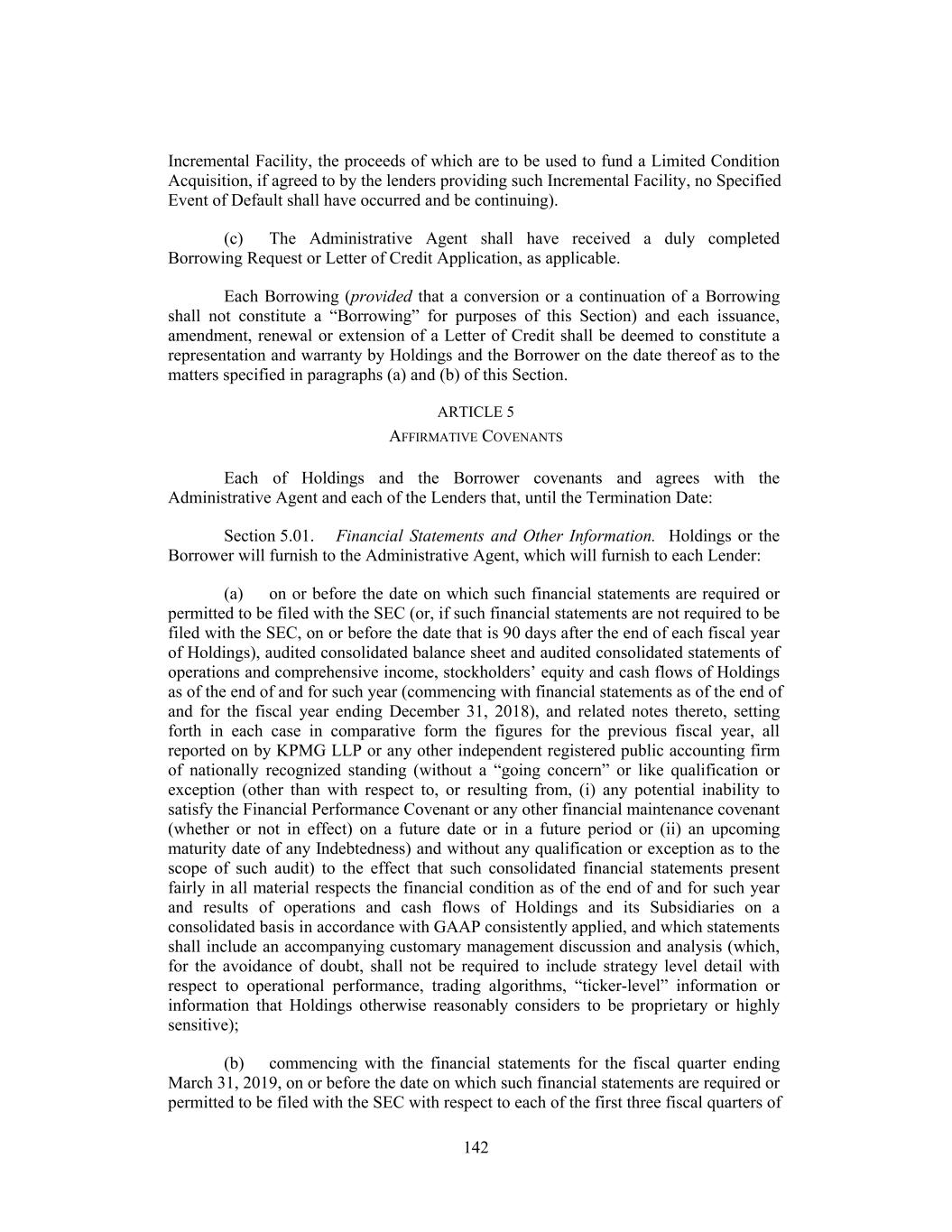 Incremental Facility, the proceeds of which are to be used to fund a Limited Condition Acquisition, if agreed to by the lenders providing such Incremental Facility, no Specified Event of Default shall have occurred and be continuing). (c) The Administrative Agent shall have received a duly completed Borrowing Request or Letter of Credit Application, as applicable. Each Borrowing (provided that a conversion or a continuation of a Borrowing shall not constitute a “Borrowing” for purposes of this Section) and each issuance, amendment, renewal or extension of a Letter of Credit shall be deemed to constitute a representation and warranty by Holdings and the Borrower on the date thereof as to the matters specified in paragraphs (a) and (b) of this Section. ARTICLE 5 AFFIRMATIVE COVENANTS Each of Holdings and the Borrower covenants and agrees with the Administrative Agent and each of the Lenders that, until the Termination Date: Section 5.01. Financial Statements and Other Information. Holdings or the Borrower will furnish to the Administrative Agent, which will furnish to each Lender: (a) on or before the date on which such financial statements are required or permitted to be filed with the SEC (or, if such financial statements are not required to be filed with the SEC, on or before the date that is 90 days after the end of each fiscal year of Holdings), audited consolidated balance sheet and audited consolidated statements of operations and comprehensive income, stockholders’ equity and cash flows of Holdings as of the end of and for such year (commencing with financial statements as of the end of and for the fiscal year ending December 31, 2018), and related notes thereto, setting forth in each case in comparative form the figures for the previous fiscal year, all reported on by KPMG LLP or any other independent registered public accounting firm of nationally recognized standing (without a “going concern” or like qualification or exception (other than with respect to, or resulting from, (i) any potential inability to satisfy the Financial Performance Covenant or any other financial maintenance covenant (whether or not in effect) on a future date or in a future period or (ii) an upcoming maturity date of any Indebtedness) and without any qualification or exception as to the scope of such audit) to the effect that such consolidated financial statements present fairly in all material respects the financial condition as of the end of and for such year and results of operations and cash flows of Holdings and its Subsidiaries on a consolidated basis in accordance with GAAP consistently applied, and which statements shall include an accompanying customary management discussion and analysis (which, for the avoidance of doubt, shall not be required to include strategy level detail with respect to operational performance, trading algorithms, “ticker-level” information or information that Holdings otherwise reasonably considers to be proprietary or highly sensitive); (b) commencing with the financial statements for the fiscal quarter ending March 31, 2019, on or before the date on which such financial statements are required or permitted to be filed with the SEC with respect to each of the first three fiscal quarters of 142