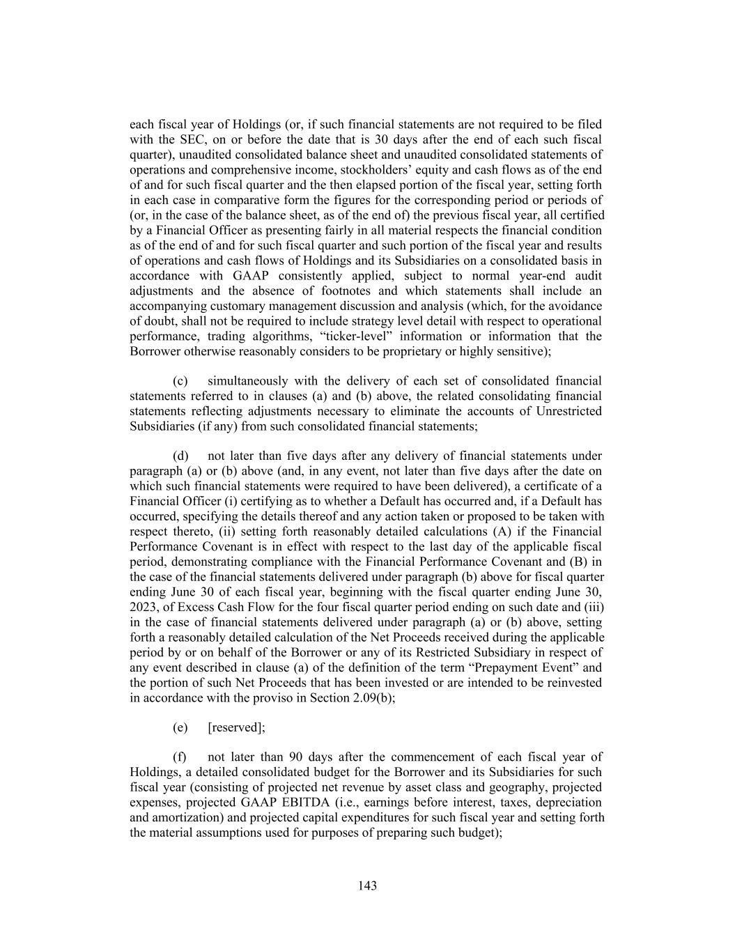 each fiscal year of Holdings (or, if such financial statements are not required to be filed with the SEC, on or before the date that is 30 days after the end of each such fiscal quarter), unaudited consolidated balance sheet and unaudited consolidated statements of operations and comprehensive income, stockholders’ equity and cash flows as of the end of and for such fiscal quarter and the then elapsed portion of the fiscal year, setting forth in each case in comparative form the figures for the corresponding period or periods of (or, in the case of the balance sheet, as of the end of) the previous fiscal year, all certified by a Financial Officer as presenting fairly in all material respects the financial condition as of the end of and for such fiscal quarter and such portion of the fiscal year and results of operations and cash flows of Holdings and its Subsidiaries on a consolidated basis in accordance with GAAP consistently applied, subject to normal year-end audit adjustments and the absence of footnotes and which statements shall include an accompanying customary management discussion and analysis (which, for the avoidance of doubt, shall not be required to include strategy level detail with respect to operational performance, trading algorithms, “ticker-level” information or information that the Borrower otherwise reasonably considers to be proprietary or highly sensitive); (c) simultaneously with the delivery of each set of consolidated financial statements referred to in clauses (a) and (b) above, the related consolidating financial statements reflecting adjustments necessary to eliminate the accounts of Unrestricted Subsidiaries (if any) from such consolidated financial statements; (d) not later than five days after any delivery of financial statements under paragraph (a) or (b) above (and, in any event, not later than five days after the date on which such financial statements were required to have been delivered), a certificate of a Financial Officer (i) certifying as to whether a Default has occurred and, if a Default has occurred, specifying the details thereof and any action taken or proposed to be taken with respect thereto, (ii) setting forth reasonably detailed calculations (A) if the Financial Performance Covenant is in effect with respect to the last day of the applicable fiscal period, demonstrating compliance with the Financial Performance Covenant and (B) in the case of the financial statements delivered under paragraph (b) above for fiscal quarter ending June 30 of each fiscal year, beginning with the fiscal quarter ending June 30, 2023, of Excess Cash Flow for the four fiscal quarter period ending on such date and (iii) in the case of financial statements delivered under paragraph (a) or (b) above, setting forth a reasonably detailed calculation of the Net Proceeds received during the applicable period by or on behalf of the Borrower or any of its Restricted Subsidiary in respect of any event described in clause (a) of the definition of the term “Prepayment Event” and the portion of such Net Proceeds that has been invested or are intended to be reinvested in accordance with the proviso in Section 2.09(b); (e) [reserved]; (f) not later than 90 days after the commencement of each fiscal year of Holdings, a detailed consolidated budget for the Borrower and its Subsidiaries for such fiscal year (consisting of projected net revenue by asset class and geography, projected expenses, projected GAAP EBITDA (i.e., earnings before interest, taxes, depreciation and amortization) and projected capital expenditures for such fiscal year and setting forth the material assumptions used for purposes of preparing such budget); 143