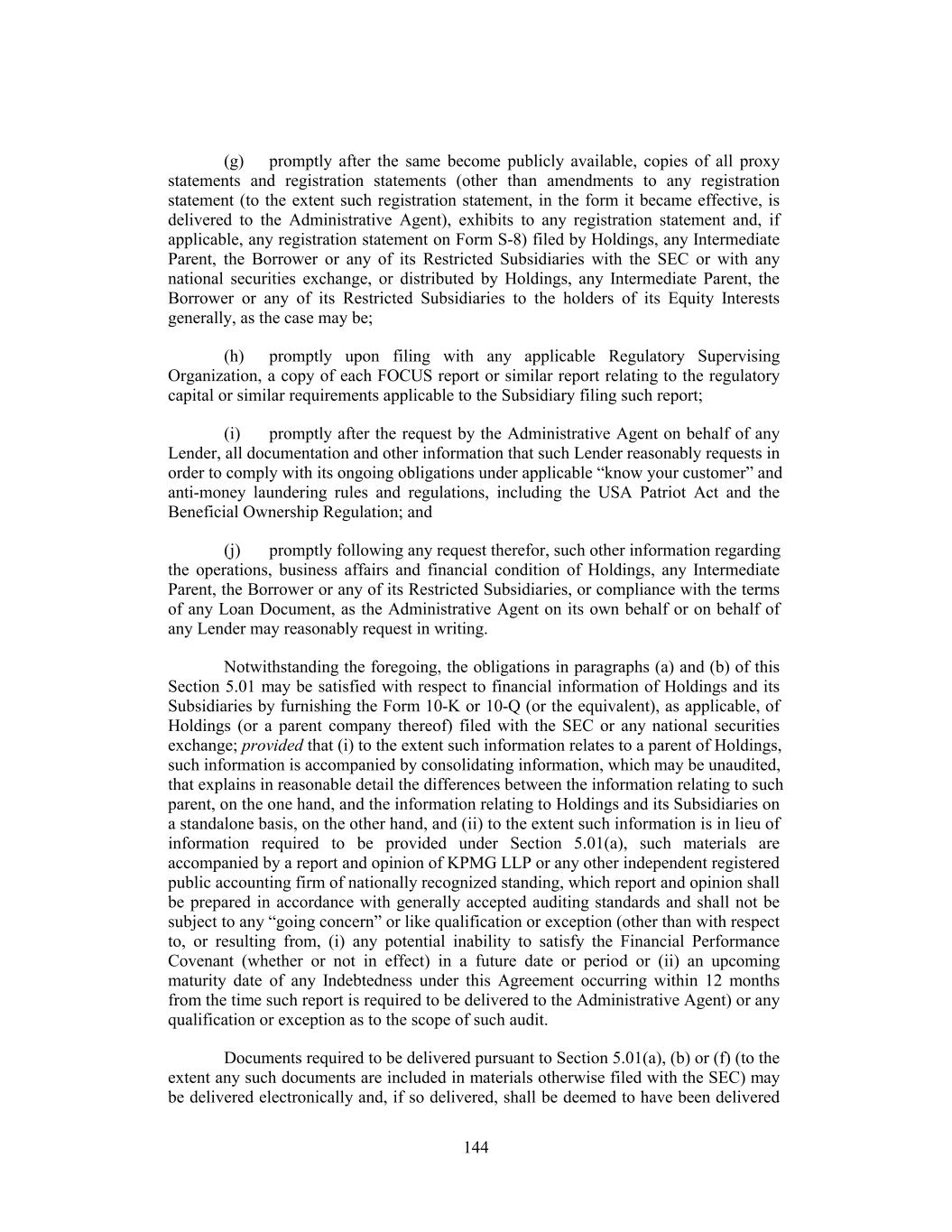 (g) promptly after the same become publicly available, copies of all proxy statements and registration statements (other than amendments to any registration statement (to the extent such registration statement, in the form it became effective, is delivered to the Administrative Agent), exhibits to any registration statement and, if applicable, any registration statement on Form S-8) filed by Holdings, any Intermediate Parent, the Borrower or any of its Restricted Subsidiaries with the SEC or with any national securities exchange, or distributed by Holdings, any Intermediate Parent, the Borrower or any of its Restricted Subsidiaries to the holders of its Equity Interests generally, as the case may be; (h) promptly upon filing with any applicable Regulatory Supervising Organization, a copy of each FOCUS report or similar report relating to the regulatory capital or similar requirements applicable to the Subsidiary filing such report; (i) promptly after the request by the Administrative Agent on behalf of any Lender, all documentation and other information that such Lender reasonably requests in order to comply with its ongoing obligations under applicable “know your customer” and anti-money laundering rules and regulations, including the USA Patriot Act and the Beneficial Ownership Regulation; and (j) promptly following any request therefor, such other information regarding the operations, business affairs and financial condition of Holdings, any Intermediate Parent, the Borrower or any of its Restricted Subsidiaries, or compliance with the terms of any Loan Document, as the Administrative Agent on its own behalf or on behalf of any Lender may reasonably request in writing. Notwithstanding the foregoing, the obligations in paragraphs (a) and (b) of this Section 5.01 may be satisfied with respect to financial information of Holdings and its Subsidiaries by furnishing the Form 10-K or 10-Q (or the equivalent), as applicable, of Holdings (or a parent company thereof) filed with the SEC or any national securities exchange; provided that (i) to the extent such information relates to a parent of Holdings, such information is accompanied by consolidating information, which may be unaudited, that explains in reasonable detail the differences between the information relating to such parent, on the one hand, and the information relating to Holdings and its Subsidiaries on a standalone basis, on the other hand, and (ii) to the extent such information is in lieu of information required to be provided under Section 5.01(a), such materials are accompanied by a report and opinion of KPMG LLP or any other independent registered public accounting firm of nationally recognized standing, which report and opinion shall be prepared in accordance with generally accepted auditing standards and shall not be subject to any “going concern” or like qualification or exception (other than with respect to, or resulting from, (i) any potential inability to satisfy the Financial Performance Covenant (whether or not in effect) in a future date or period or (ii) an upcoming maturity date of any Indebtedness under this Agreement occurring within 12 months from the time such report is required to be delivered to the Administrative Agent) or any qualification or exception as to the scope of such audit. Documents required to be delivered pursuant to Section 5.01(a), (b) or (f) (to the extent any such documents are included in materials otherwise filed with the SEC) may be delivered electronically and, if so delivered, shall be deemed to have been delivered 144