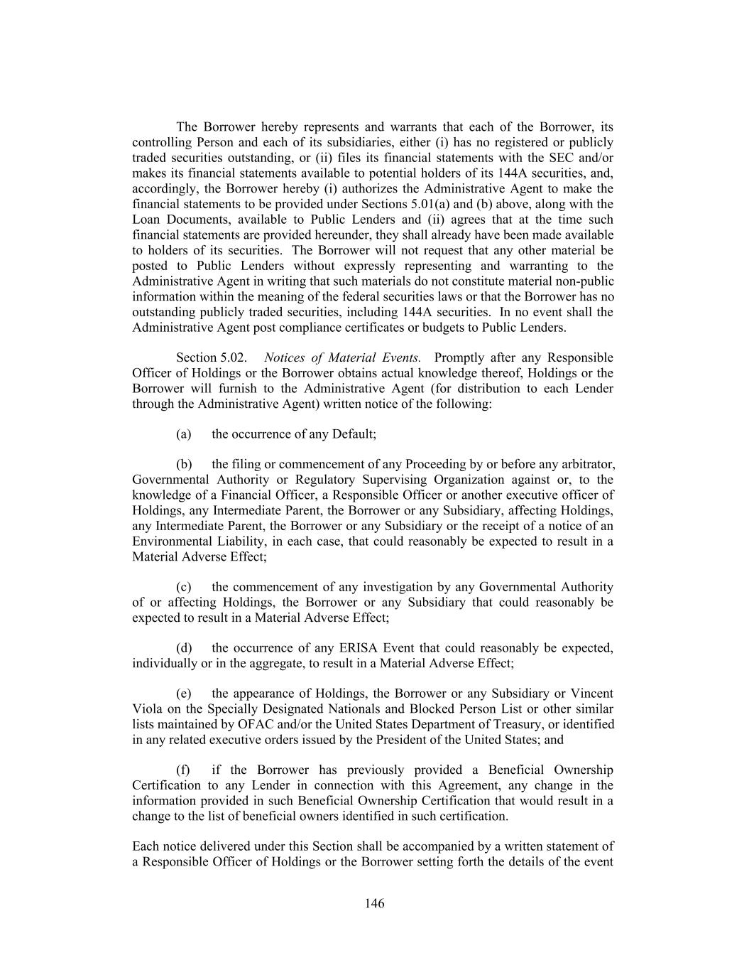 The Borrower hereby represents and warrants that each of the Borrower, its controlling Person and each of its subsidiaries, either (i) has no registered or publicly traded securities outstanding, or (ii) files its financial statements with the SEC and/or makes its financial statements available to potential holders of its 144A securities, and, accordingly, the Borrower hereby (i) authorizes the Administrative Agent to make the financial statements to be provided under Sections 5.01(a) and (b) above, along with the Loan Documents, available to Public Lenders and (ii) agrees that at the time such financial statements are provided hereunder, they shall already have been made available to holders of its securities. The Borrower will not request that any other material be posted to Public Lenders without expressly representing and warranting to the Administrative Agent in writing that such materials do not constitute material non-public information within the meaning of the federal securities laws or that the Borrower has no outstanding publicly traded securities, including 144A securities. In no event shall the Administrative Agent post compliance certificates or budgets to Public Lenders. Section 5.02. Notices of Material Events. Promptly after any Responsible Officer of Holdings or the Borrower obtains actual knowledge thereof, Holdings or the Borrower will furnish to the Administrative Agent (for distribution to each Lender through the Administrative Agent) written notice of the following: (a) the occurrence of any Default; (b) the filing or commencement of any Proceeding by or before any arbitrator, Governmental Authority or Regulatory Supervising Organization against or, to the knowledge of a Financial Officer, a Responsible Officer or another executive officer of Holdings, any Intermediate Parent, the Borrower or any Subsidiary, affecting Holdings, any Intermediate Parent, the Borrower or any Subsidiary or the receipt of a notice of an Environmental Liability, in each case, that could reasonably be expected to result in a Material Adverse Effect; (c) the commencement of any investigation by any Governmental Authority of or affecting Holdings, the Borrower or any Subsidiary that could reasonably be expected to result in a Material Adverse Effect; (d) the occurrence of any ERISA Event that could reasonably be expected, individually or in the aggregate, to result in a Material Adverse Effect; (e) the appearance of Holdings, the Borrower or any Subsidiary or Vincent Viola on the Specially Designated Nationals and Blocked Person List or other similar lists maintained by OFAC and/or the United States Department of Treasury, or identified in any related executive orders issued by the President of the United States; and (f) if the Borrower has previously provided a Beneficial Ownership Certification to any Lender in connection with this Agreement, any change in the information provided in such Beneficial Ownership Certification that would result in a change to the list of beneficial owners identified in such certification. Each notice delivered under this Section shall be accompanied by a written statement of a Responsible Officer of Holdings or the Borrower setting forth the details of the event 146