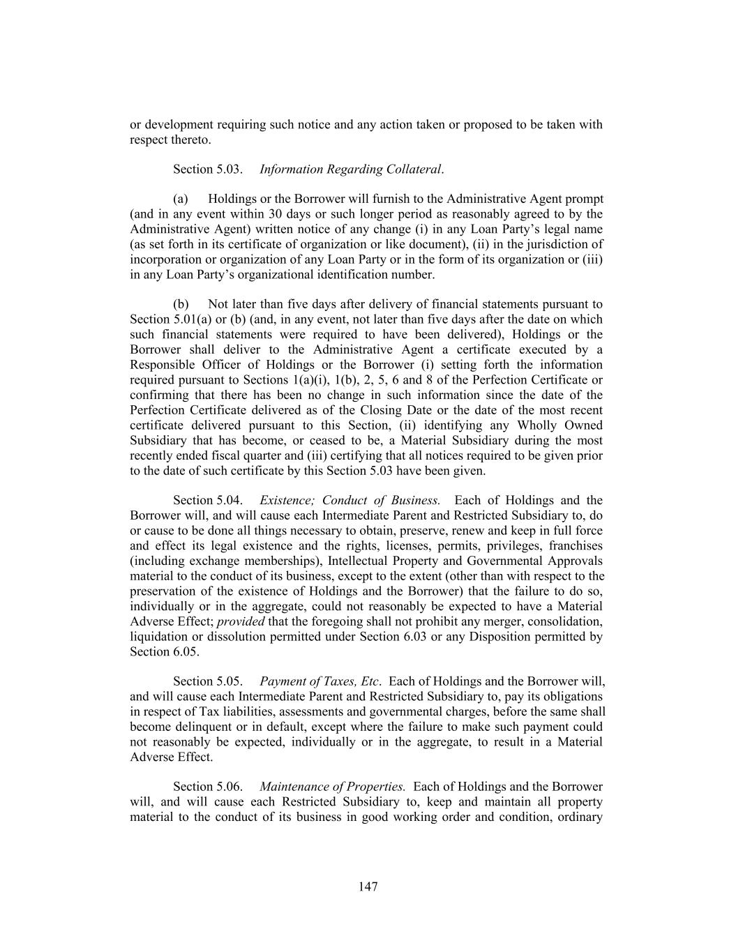 or development requiring such notice and any action taken or proposed to be taken with respect thereto. Section 5.03. Information Regarding Collateral. (a) Holdings or the Borrower will furnish to the Administrative Agent prompt (and in any event within 30 days or such longer period as reasonably agreed to by the Administrative Agent) written notice of any change (i) in any Loan Party’s legal name (as set forth in its certificate of organization or like document), (ii) in the jurisdiction of incorporation or organization of any Loan Party or in the form of its organization or (iii) in any Loan Party’s organizational identification number. (b) Not later than five days after delivery of financial statements pursuant to Section 5.01(a) or (b) (and, in any event, not later than five days after the date on which such financial statements were required to have been delivered), Holdings or the Borrower shall deliver to the Administrative Agent a certificate executed by a Responsible Officer of Holdings or the Borrower (i) setting forth the information required pursuant to Sections 1(a)(i), 1(b), 2, 5, 6 and 8 of the Perfection Certificate or confirming that there has been no change in such information since the date of the Perfection Certificate delivered as of the Closing Date or the date of the most recent certificate delivered pursuant to this Section, (ii) identifying any Wholly Owned Subsidiary that has become, or ceased to be, a Material Subsidiary during the most recently ended fiscal quarter and (iii) certifying that all notices required to be given prior to the date of such certificate by this Section 5.03 have been given. Section 5.04. Existence; Conduct of Business. Each of Holdings and the Borrower will, and will cause each Intermediate Parent and Restricted Subsidiary to, do or cause to be done all things necessary to obtain, preserve, renew and keep in full force and effect its legal existence and the rights, licenses, permits, privileges, franchises (including exchange memberships), Intellectual Property and Governmental Approvals material to the conduct of its business, except to the extent (other than with respect to the preservation of the existence of Holdings and the Borrower) that the failure to do so, individually or in the aggregate, could not reasonably be expected to have a Material Adverse Effect; provided that the foregoing shall not prohibit any merger, consolidation, liquidation or dissolution permitted under Section 6.03 or any Disposition permitted by Section 6.05. Section 5.05. Payment of Taxes, Etc. Each of Holdings and the Borrower will, and will cause each Intermediate Parent and Restricted Subsidiary to, pay its obligations in respect of Tax liabilities, assessments and governmental charges, before the same shall become delinquent or in default, except where the failure to make such payment could not reasonably be expected, individually or in the aggregate, to result in a Material Adverse Effect. Section 5.06. Maintenance of Properties. Each of Holdings and the Borrower will, and will cause each Restricted Subsidiary to, keep and maintain all property material to the conduct of its business in good working order and condition, ordinary 147