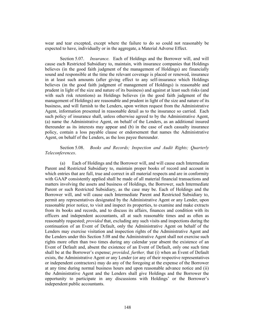 wear and tear excepted, except where the failure to do so could not reasonably be expected to have, individually or in the aggregate, a Material Adverse Effect. Section 5.07. Insurance. Each of Holdings and the Borrower will, and will cause each Restricted Subsidiary to, maintain, with insurance companies that Holdings believes (in the good faith judgment of the management of Holdings) are financially sound and responsible at the time the relevant coverage is placed or renewed, insurance in at least such amounts (after giving effect to any self-insurance which Holdings believes (in the good faith judgment of management of Holdings) is reasonable and prudent in light of the size and nature of its business) and against at least such risks (and with such risk retentions) as Holdings believes (in the good faith judgment of the management of Holdings) are reasonable and prudent in light of the size and nature of its business, and will furnish to the Lenders, upon written request from the Administrative Agent, information presented in reasonable detail as to the insurance so carried. Each such policy of insurance shall, unless otherwise agreed to by the Administrative Agent, (a) name the Administrative Agent, on behalf of the Lenders, as an additional insured thereunder as its interests may appear and (b) in the case of each casualty insurance policy, contain a loss payable clause or endorsement that names the Administrative Agent, on behalf of the Lenders, as the loss payee thereunder. Section 5.08. Books and Records; Inspection and Audit Rights; Quarterly Teleconferences. (a) Each of Holdings and the Borrower will, and will cause each Intermediate Parent and Restricted Subsidiary to, maintain proper books of record and account in which entries that are full, true and correct in all material respects and are in conformity with GAAP consistently applied shall be made of all material financial transactions and matters involving the assets and business of Holdings, the Borrower, such Intermediate Parent or such Restricted Subsidiary, as the case may be. Each of Holdings and the Borrower will, and will cause each Intermediate Parent and Restricted Subsidiary to, permit any representatives designated by the Administrative Agent or any Lender, upon reasonable prior notice, to visit and inspect its properties, to examine and make extracts from its books and records, and to discuss its affairs, finances and condition with its officers and independent accountants, all at such reasonable times and as often as reasonably requested; provided that, excluding any such visits and inspections during the continuation of an Event of Default, only the Administrative Agent on behalf of the Lenders may exercise visitation and inspection rights of the Administrative Agent and the Lenders under this Section 5.08 and the Administrative Agent shall not exercise such rights more often than two times during any calendar year absent the existence of an Event of Default and, absent the existence of an Event of Default, only one such time shall be at the Borrower’s expense; provided, further, that (i) when an Event of Default exists, the Administrative Agent or any Lender (or any of their respective representatives or independent contractors) may do any of the foregoing at the expense of the Borrower at any time during normal business hours and upon reasonable advance notice and (ii) the Administrative Agent and the Lenders shall give Holdings and the Borrower the opportunity to participate in any discussions with Holdings’ or the Borrower’s independent public accountants. 148