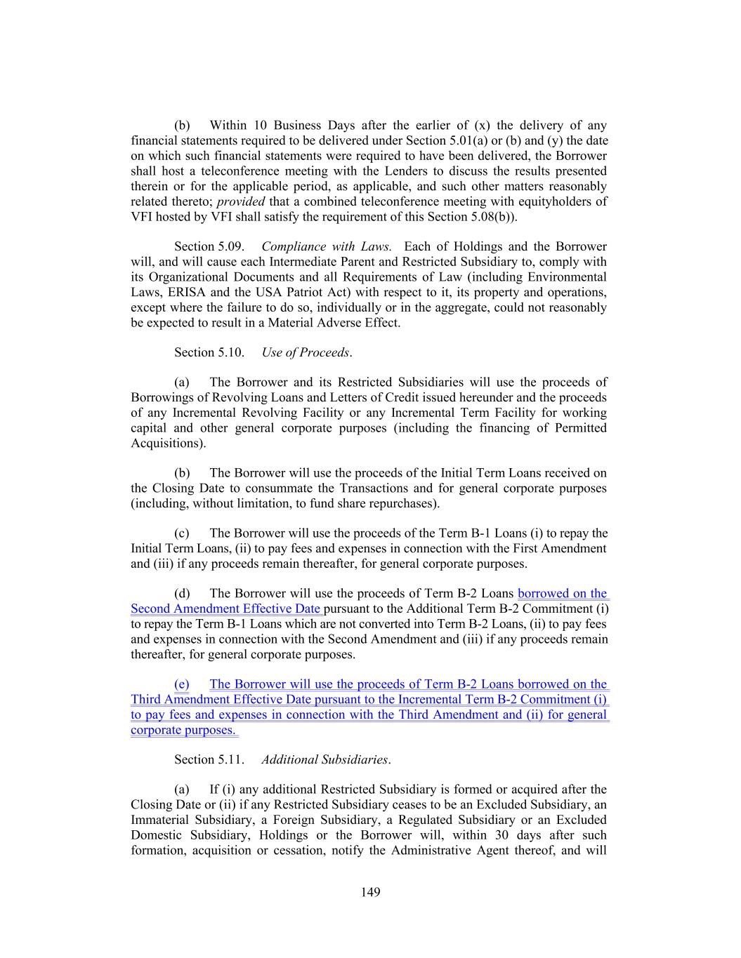 (b) Within 10 Business Days after the earlier of (x) the delivery of any financial statements required to be delivered under Section 5.01(a) or (b) and (y) the date on which such financial statements were required to have been delivered, the Borrower shall host a teleconference meeting with the Lenders to discuss the results presented therein or for the applicable period, as applicable, and such other matters reasonably related thereto; provided that a combined teleconference meeting with equityholders of VFI hosted by VFI shall satisfy the requirement of this Section 5.08(b)). Section 5.09. Compliance with Laws. Each of Holdings and the Borrower will, and will cause each Intermediate Parent and Restricted Subsidiary to, comply with its Organizational Documents and all Requirements of Law (including Environmental Laws, ERISA and the USA Patriot Act) with respect to it, its property and operations, except where the failure to do so, individually or in the aggregate, could not reasonably be expected to result in a Material Adverse Effect. Section 5.10. Use of Proceeds. (a) The Borrower and its Restricted Subsidiaries will use the proceeds of Borrowings of Revolving Loans and Letters of Credit issued hereunder and the proceeds of any Incremental Revolving Facility or any Incremental Term Facility for working capital and other general corporate purposes (including the financing of Permitted Acquisitions). (b) The Borrower will use the proceeds of the Initial Term Loans received on the Closing Date to consummate the Transactions and for general corporate purposes (including, without limitation, to fund share repurchases). (c) The Borrower will use the proceeds of the Term B-1 Loans (i) to repay the Initial Term Loans, (ii) to pay fees and expenses in connection with the First Amendment and (iii) if any proceeds remain thereafter, for general corporate purposes. (d) The Borrower will use the proceeds of Term B-2 Loans borrowed on the Second Amendment Effective Date pursuant to the Additional Term B-2 Commitment (i) to repay the Term B-1 Loans which are not converted into Term B-2 Loans, (ii) to pay fees and expenses in connection with the Second Amendment and (iii) if any proceeds remain thereafter, for general corporate purposes. (e) The Borrower will use the proceeds of Term B-2 Loans borrowed on the Third Amendment Effective Date pursuant to the Incremental Term B-2 Commitment (i) to pay fees and expenses in connection with the Third Amendment and (ii) for general corporate purposes. Section 5.11. Additional Subsidiaries. (a) If (i) any additional Restricted Subsidiary is formed or acquired after the Closing Date or (ii) if any Restricted Subsidiary ceases to be an Excluded Subsidiary, an Immaterial Subsidiary, a Foreign Subsidiary, a Regulated Subsidiary or an Excluded Domestic Subsidiary, Holdings or the Borrower will, within 30 days after such formation, acquisition or cessation, notify the Administrative Agent thereof, and will 149