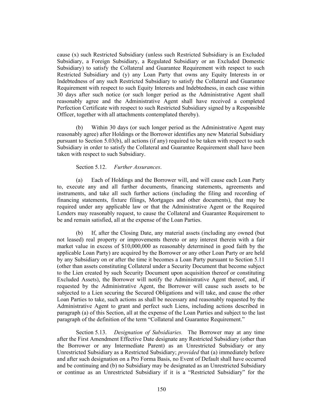 cause (x) such Restricted Subsidiary (unless such Restricted Subsidiary is an Excluded Subsidiary, a Foreign Subsidiary, a Regulated Subsidiary or an Excluded Domestic Subsidiary) to satisfy the Collateral and Guarantee Requirement with respect to such Restricted Subsidiary and (y) any Loan Party that owns any Equity Interests in or Indebtedness of any such Restricted Subsidiary to satisfy the Collateral and Guarantee Requirement with respect to such Equity Interests and Indebtedness, in each case within 30 days after such notice (or such longer period as the Administrative Agent shall reasonably agree and the Administrative Agent shall have received a completed Perfection Certificate with respect to such Restricted Subsidiary signed by a Responsible Officer, together with all attachments contemplated thereby). (b) Within 30 days (or such longer period as the Administrative Agent may reasonably agree) after Holdings or the Borrower identifies any new Material Subsidiary pursuant to Section 5.03(b), all actions (if any) required to be taken with respect to such Subsidiary in order to satisfy the Collateral and Guarantee Requirement shall have been taken with respect to such Subsidiary. Section 5.12. Further Assurances. (a) Each of Holdings and the Borrower will, and will cause each Loan Party to, execute any and all further documents, financing statements, agreements and instruments, and take all such further actions (including the filing and recording of financing statements, fixture filings, Mortgages and other documents), that may be required under any applicable law or that the Administrative Agent or the Required Lenders may reasonably request, to cause the Collateral and Guarantee Requirement to be and remain satisfied, all at the expense of the Loan Parties. (b) If, after the Closing Date, any material assets (including any owned (but not leased) real property or improvements thereto or any interest therein with a fair market value in excess of $10,000,000 as reasonably determined in good faith by the applicable Loan Party) are acquired by the Borrower or any other Loan Party or are held by any Subsidiary on or after the time it becomes a Loan Party pursuant to Section 5.11 (other than assets constituting Collateral under a Security Document that become subject to the Lien created by such Security Document upon acquisition thereof or constituting Excluded Assets), the Borrower will notify the Administrative Agent thereof, and, if requested by the Administrative Agent, the Borrower will cause such assets to be subjected to a Lien securing the Secured Obligations and will take, and cause the other Loan Parties to take, such actions as shall be necessary and reasonably requested by the Administrative Agent to grant and perfect such Liens, including actions described in paragraph (a) of this Section, all at the expense of the Loan Parties and subject to the last paragraph of the definition of the term “Collateral and Guarantee Requirement.” Section 5.13. Designation of Subsidiaries. The Borrower may at any time after the First Amendment Effective Date designate any Restricted Subsidiary (other than the Borrower or any Intermediate Parent) as an Unrestricted Subsidiary or any Unrestricted Subsidiary as a Restricted Subsidiary; provided that (a) immediately before and after such designation on a Pro Forma Basis, no Event of Default shall have occurred and be continuing and (b) no Subsidiary may be designated as an Unrestricted Subsidiary or continue as an Unrestricted Subsidiary if it is a “Restricted Subsidiary” for the 150